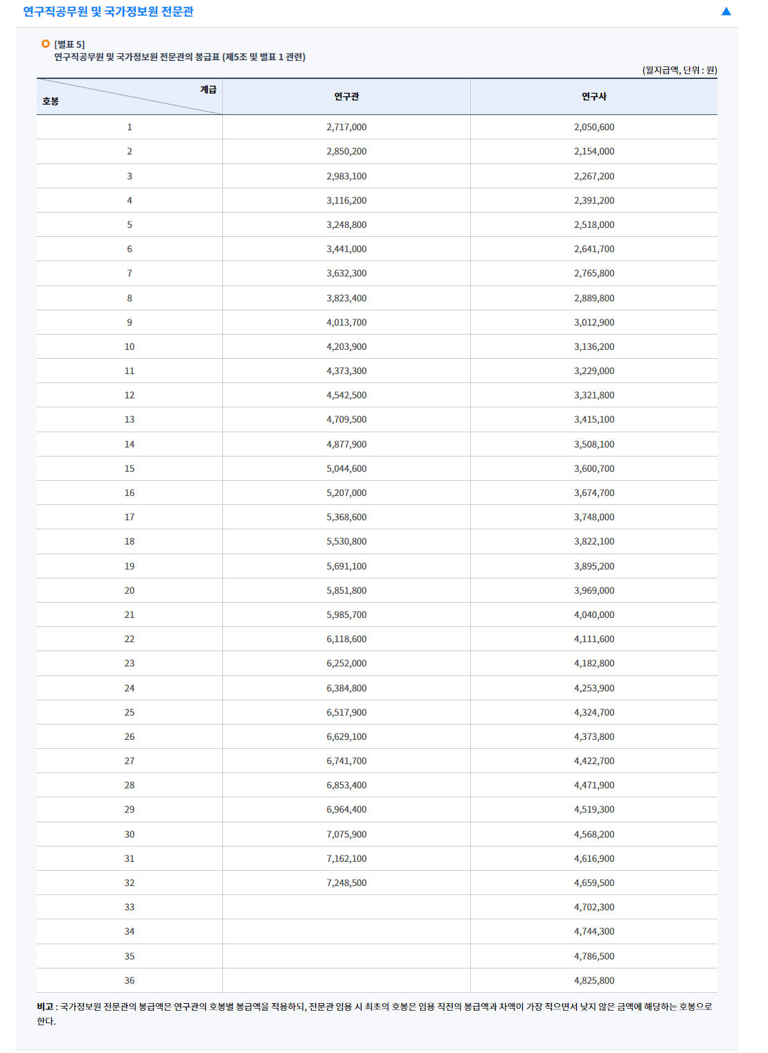일반직, 지도직, 전문경력관, 교원, 경찰, 군인 등 직종별로 봉급표가 각기 다르고 이 중에 연구직공무원의 봉급표가 별도로 있다.