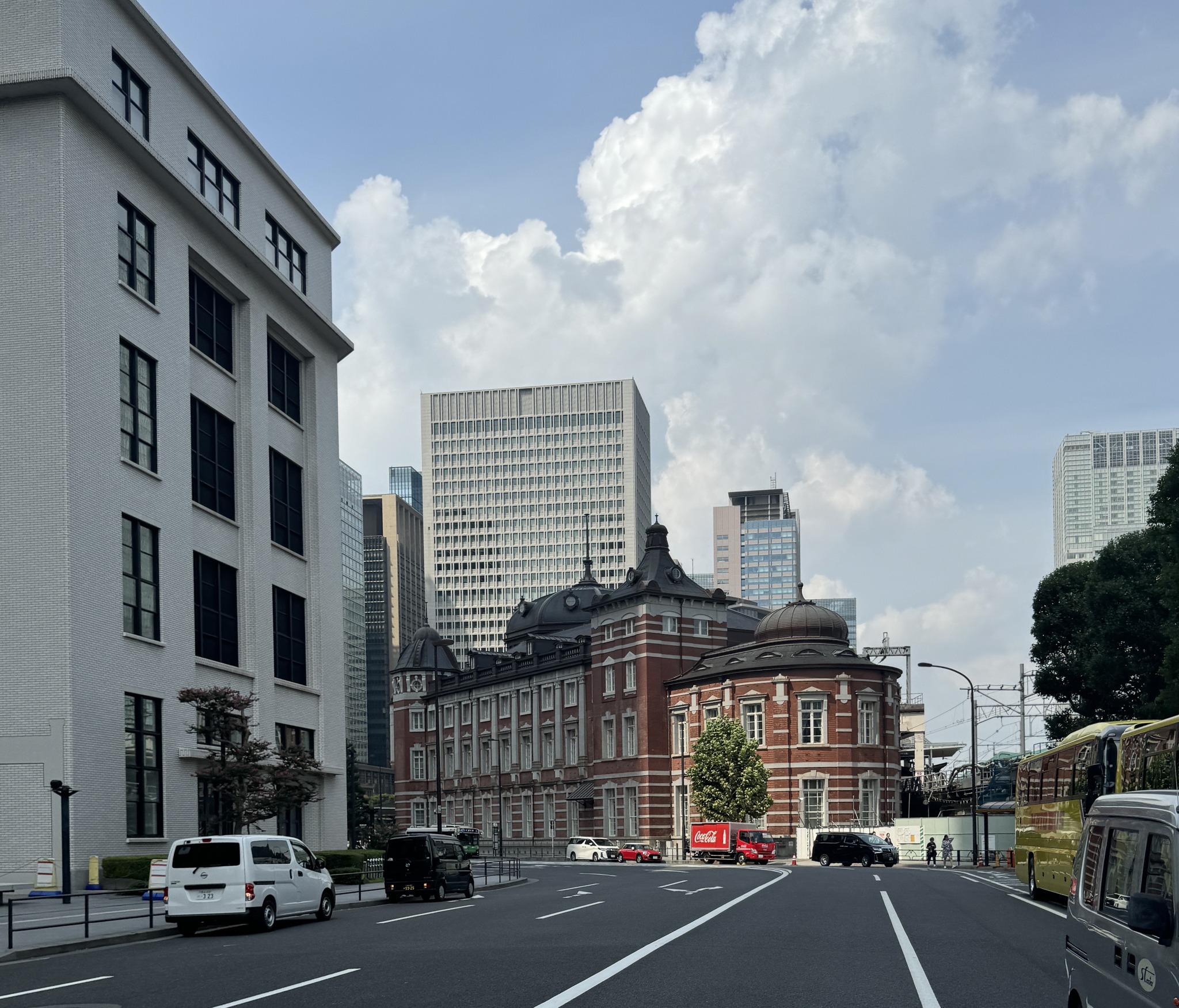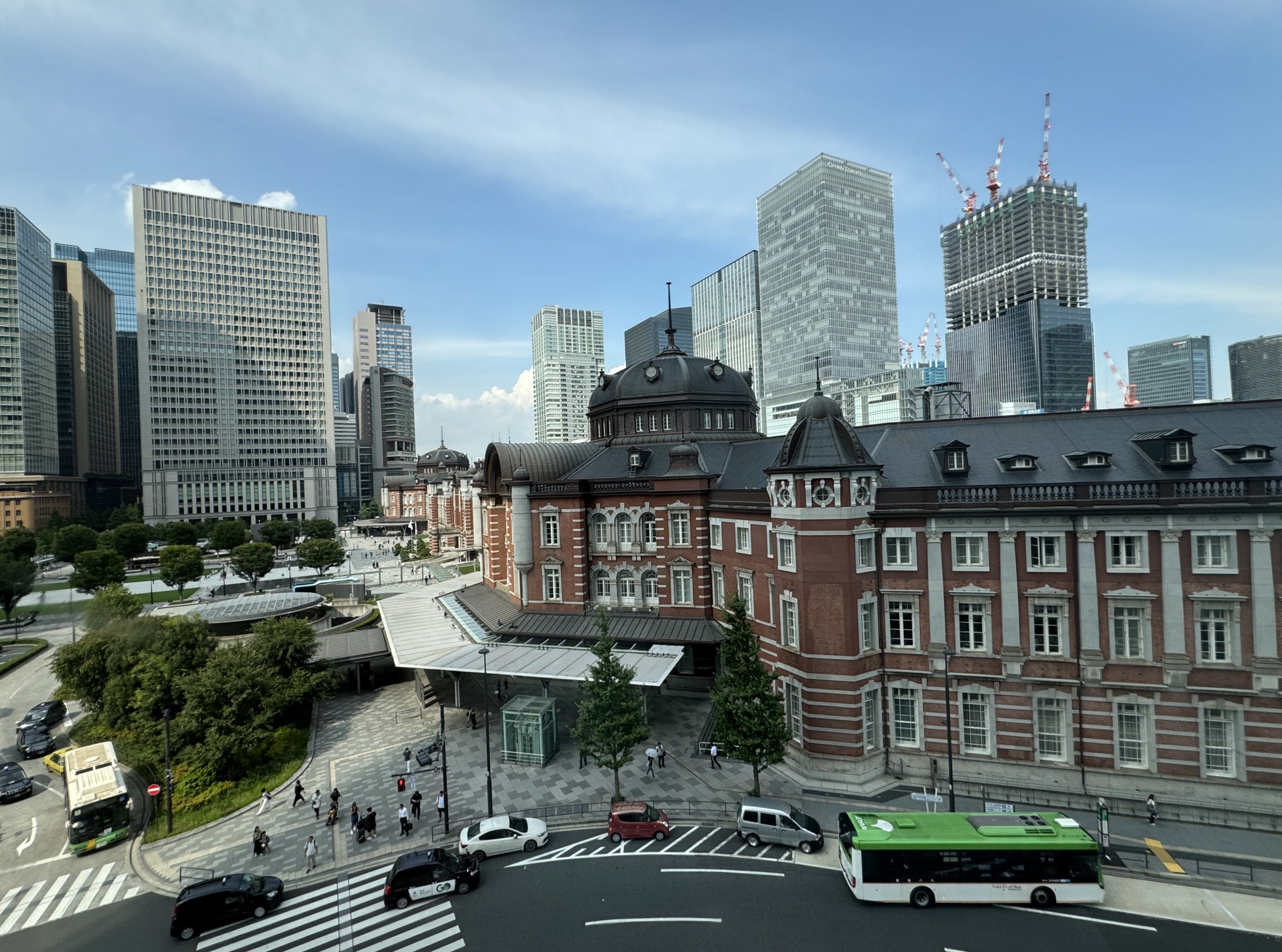 옥상정원에서는 도쿄역과 광장 너머 마루젠이 보인다.
