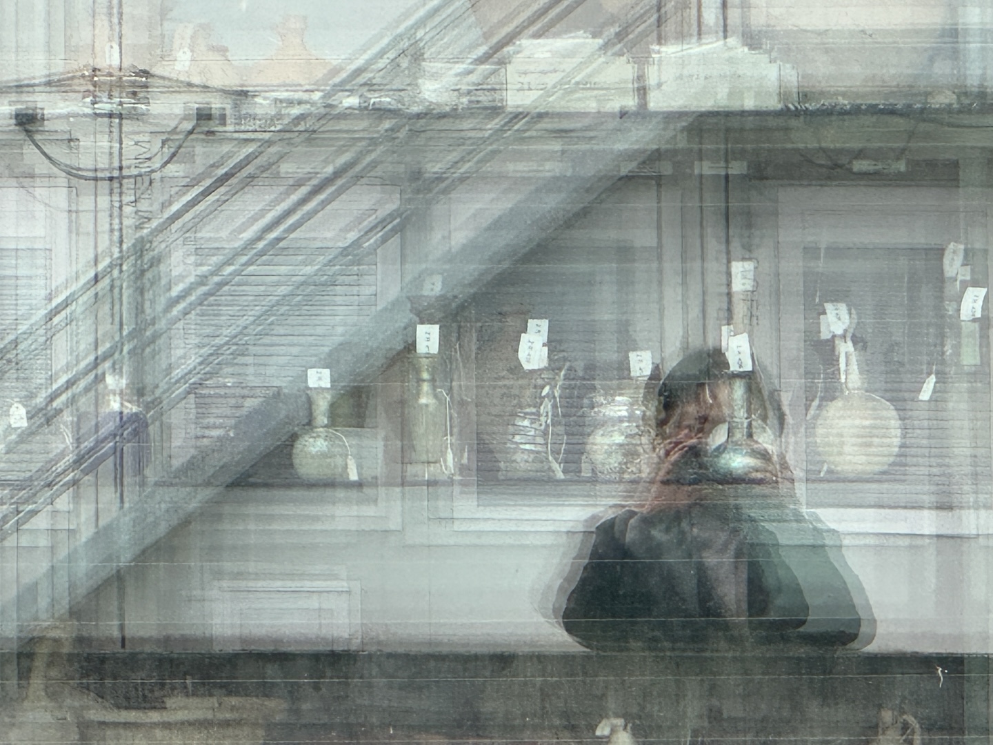 창밖으로 건너다 보이는 수장고 선반 유리들이