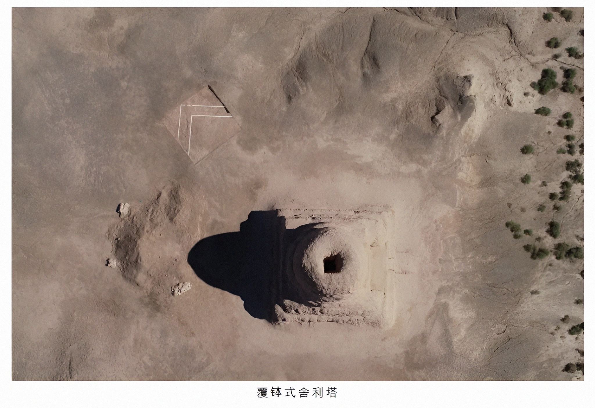 원형 불탑佛塔은 삼층 방형 탑기塔基와 복발식覆钵式 탑신塔身을 두루 갖추어 불전佛典에서 기재한 조탑造塔 양식과 완전히 일치하며 2~3세기 아모하阿姆河[아무다리아 강] 유역 지구로 연대가 거슬로 올라갈 수 있다.