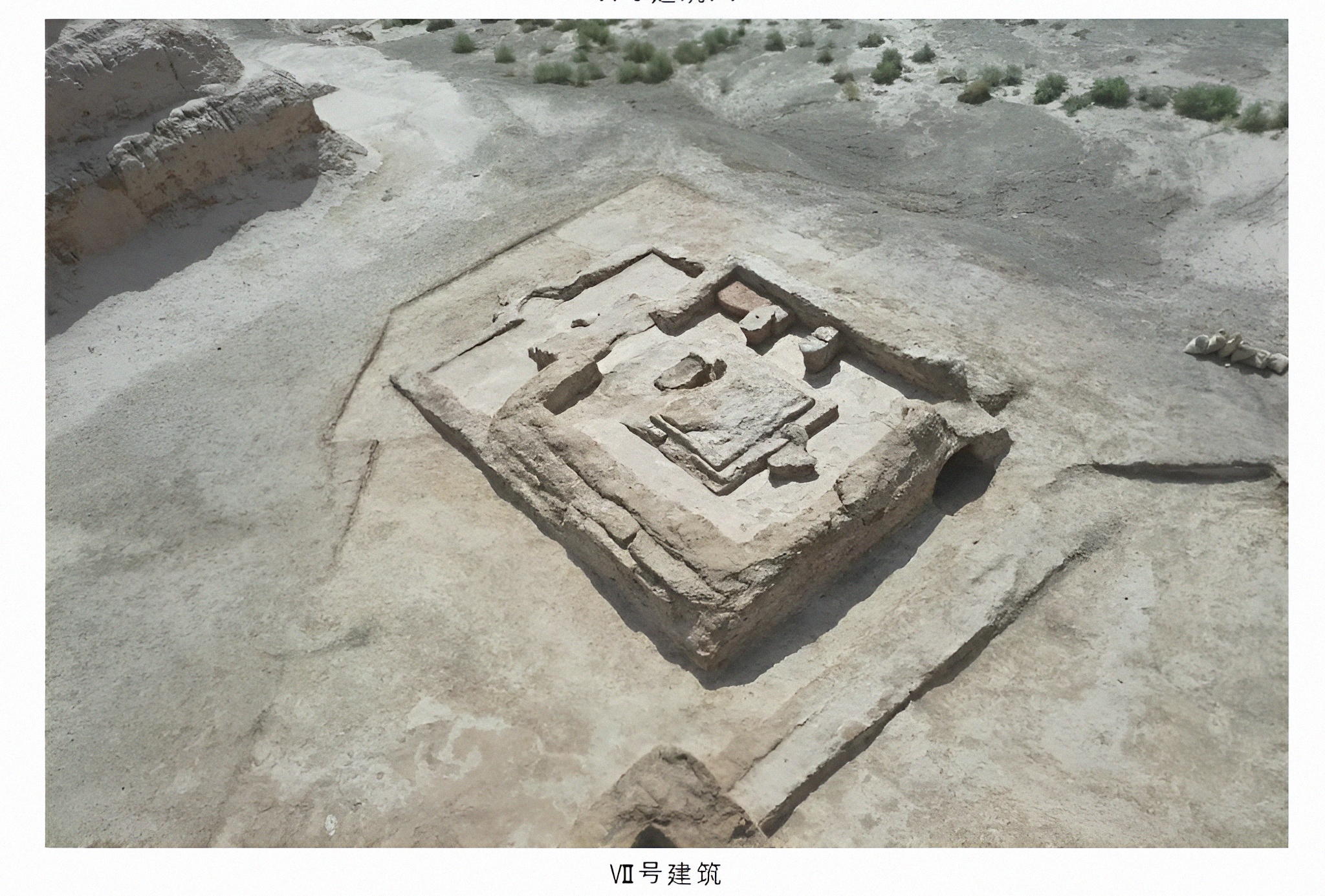 개중 VII호 건축물 중심은 삼층 방형 기좌基座로 보호하고 구렛나루이 있는 불상佛像과 육지불각六趾佛脚, 그리고 카로슈티 문자 비슷한 것을 찍은 유물을 출토했다.