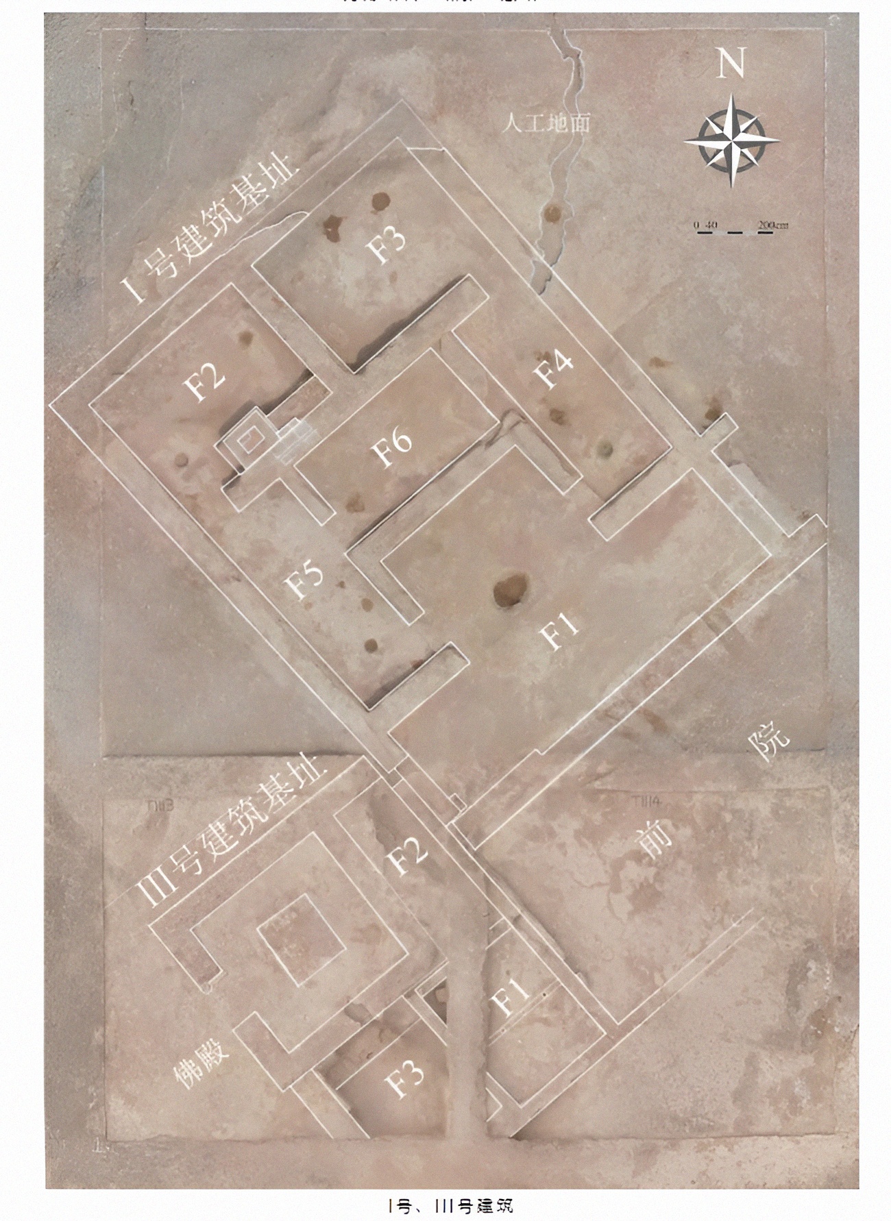 조사 결과 산문대도山门大道·산문대전山门大殿·주전主殿을 감싼 다칸식 대불전多间式大佛殿·중심 불탑佛坛 혹은 탑주塔柱를 두른 “回”자형 불전佛殿·독동식 승방独栋式僧房·좌대坐台를 갖춘 승방僧房 혹은 선실禅室·주방厨房·강당讲堂 등 10여 처 대형大型 건축기지建筑基址가 드러나고