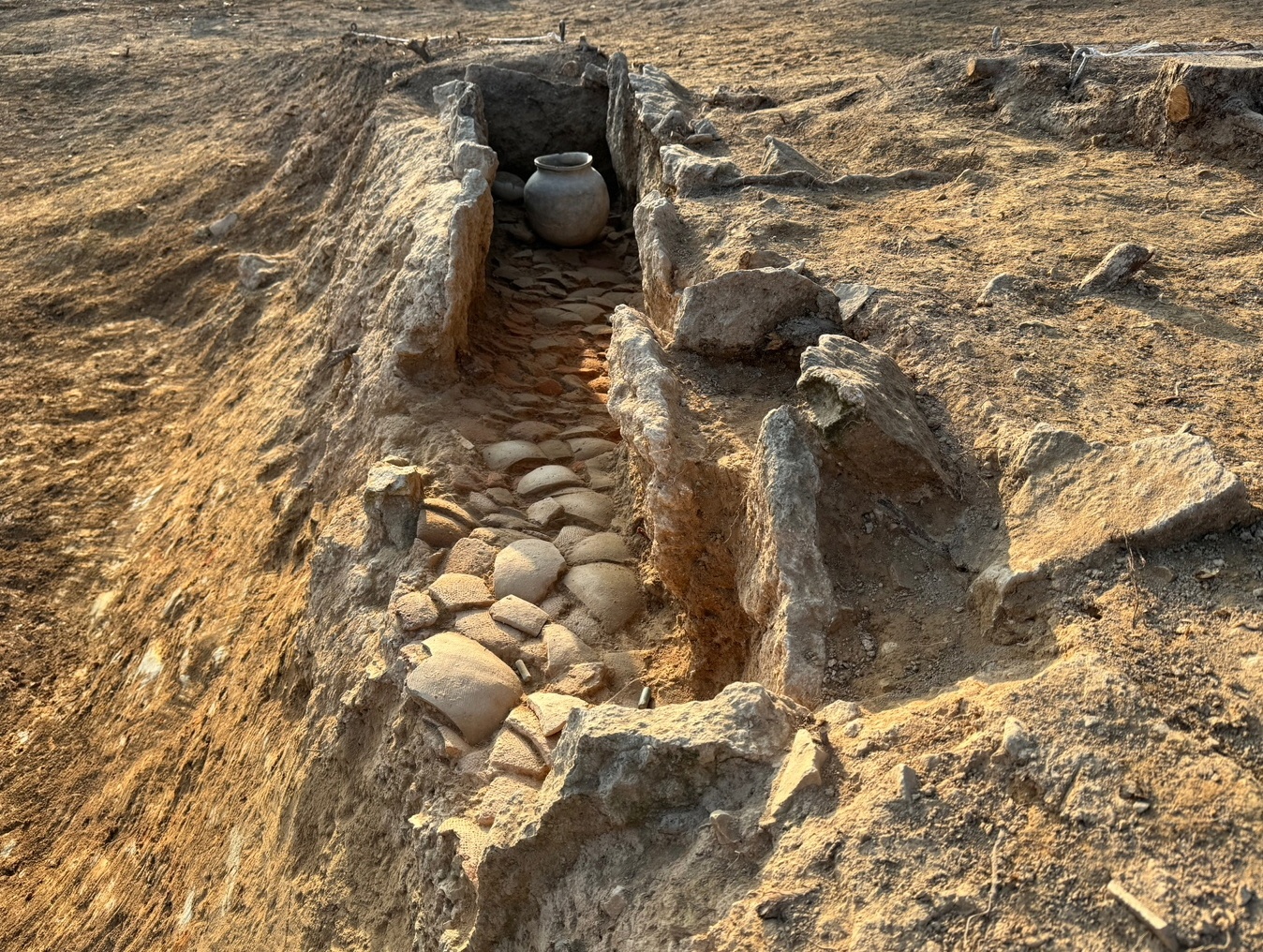 그렇다면 저 무덤방 바닥에 그릇 쪼가리들을 동강내서 깐 일은 우연인가? 다시 말해 마침 적당한 건축 자재가 없어 옆에 보이는 휴대용 아궁이를 비롯한 부엌 가구 세트들을 깨뜨려서 바닥에다 잔뜩 깔아 시신 자리로 썼을까?