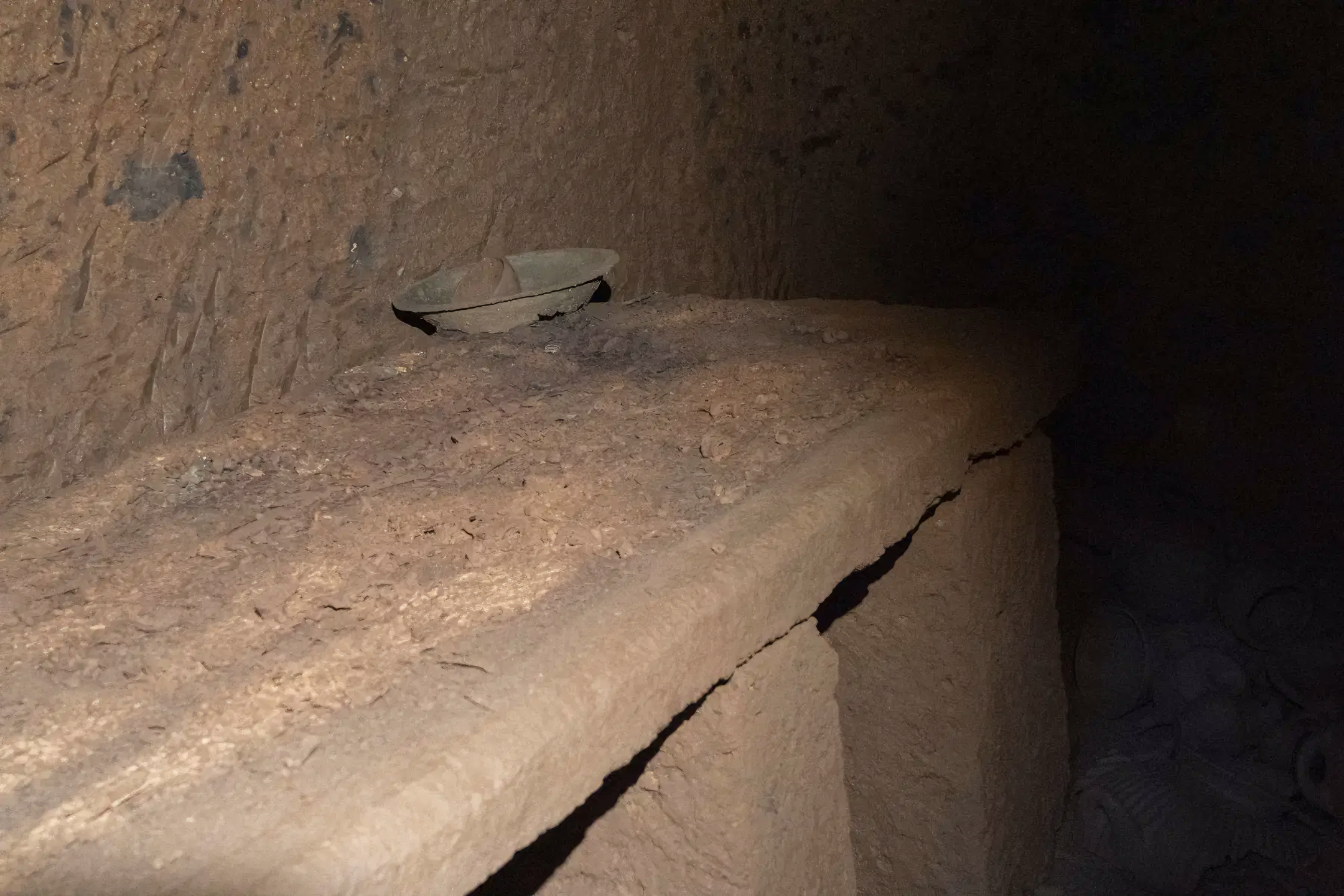 왼쪽 장례 침상funerary bed에는 고인을 위한 세면대basin와 여러 청동 장신구가 그대로 남아 있다.