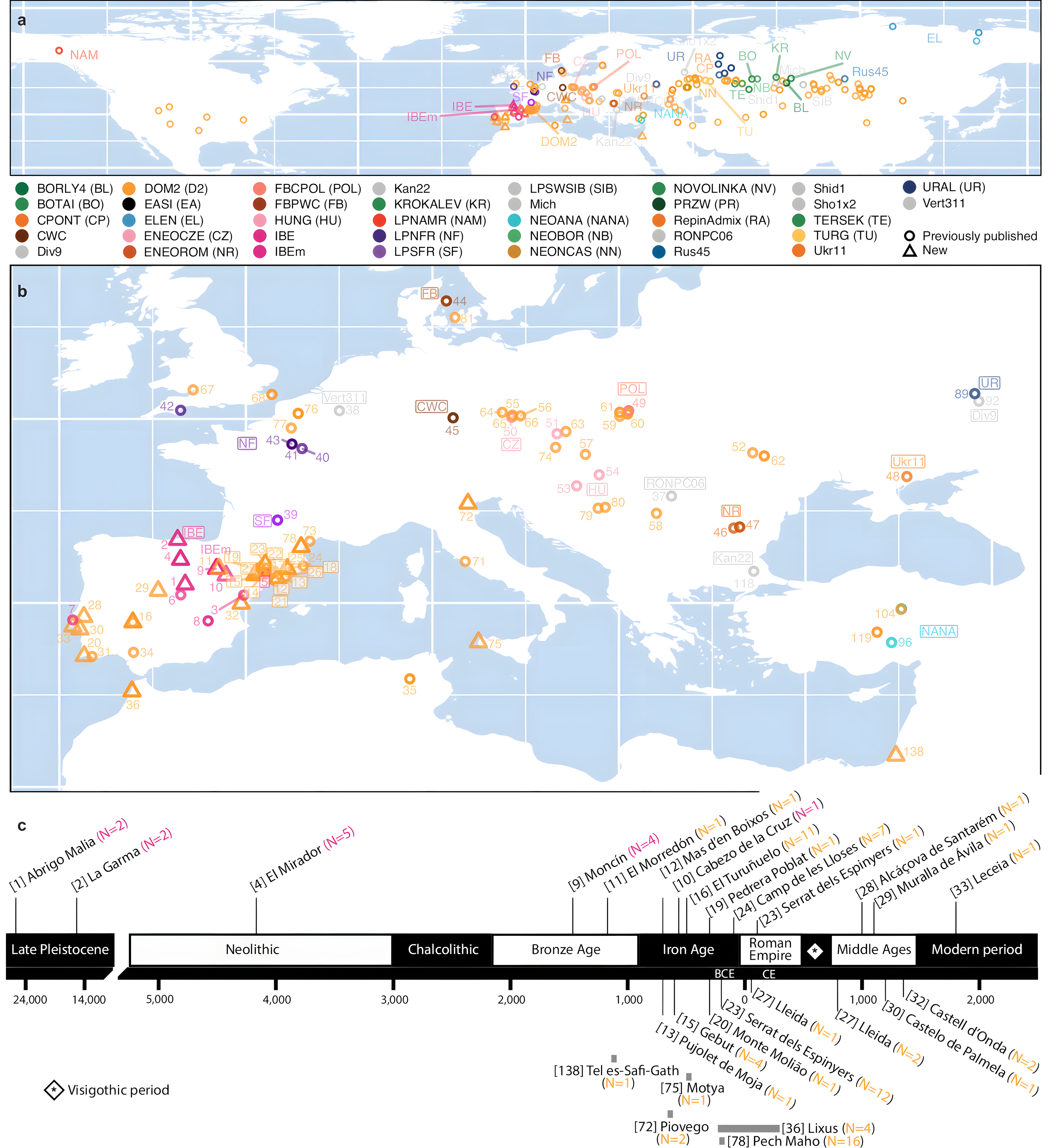 본 연구에서는 이베리아와 더 넓은 지중해 지역에서 채취한 87개체 고대 말 표본(중앙값 범위 = 0.97X)으로부터 유전체 전체 염기서열 데이터를 생성하여 지난 약 2만6천 년 동안의 유전적 역사를 재구성한다.
