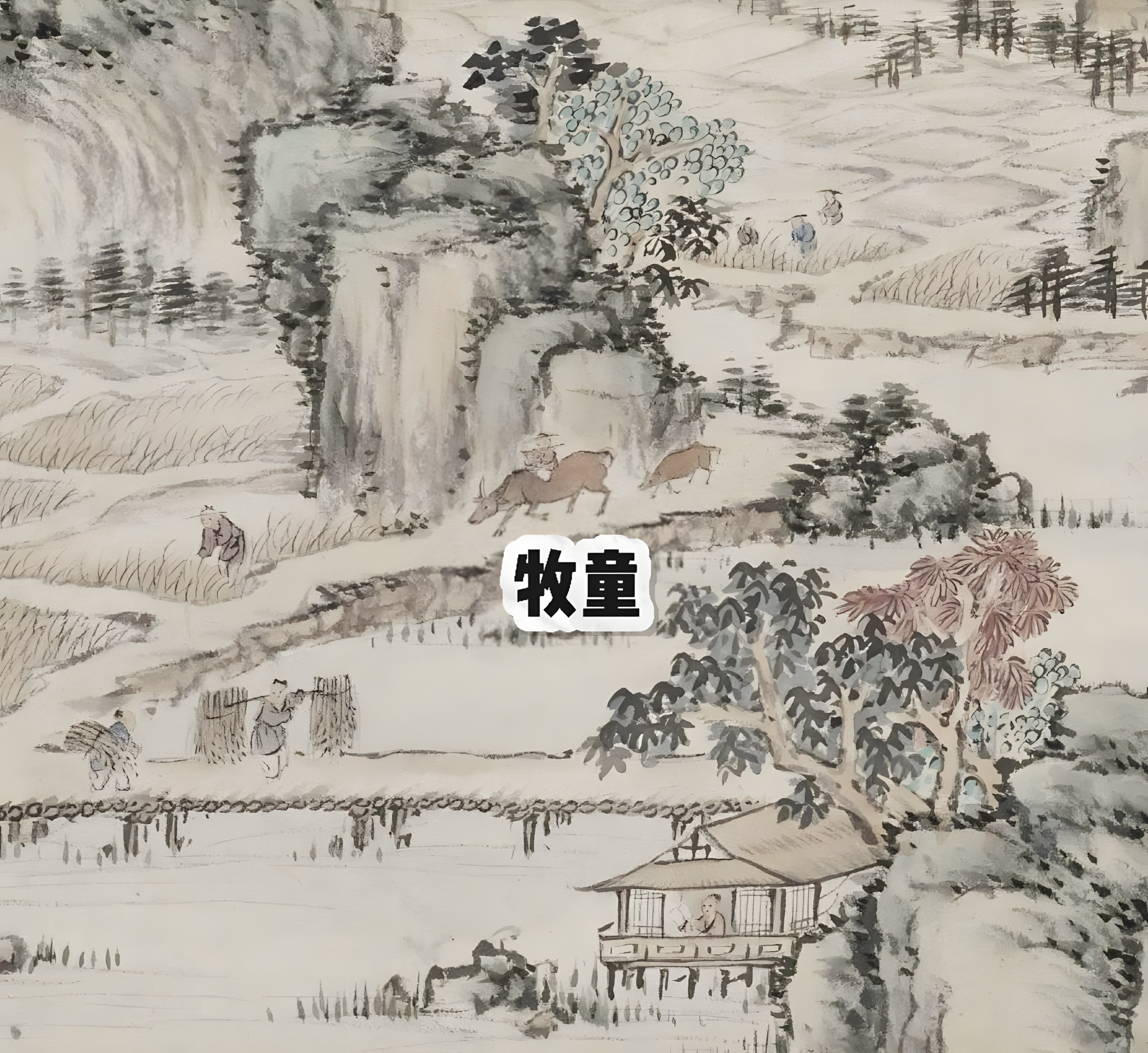 농번기 광경 밖으로는 밭머리에서 소를 타고 피리를 부는 목동도 있다.