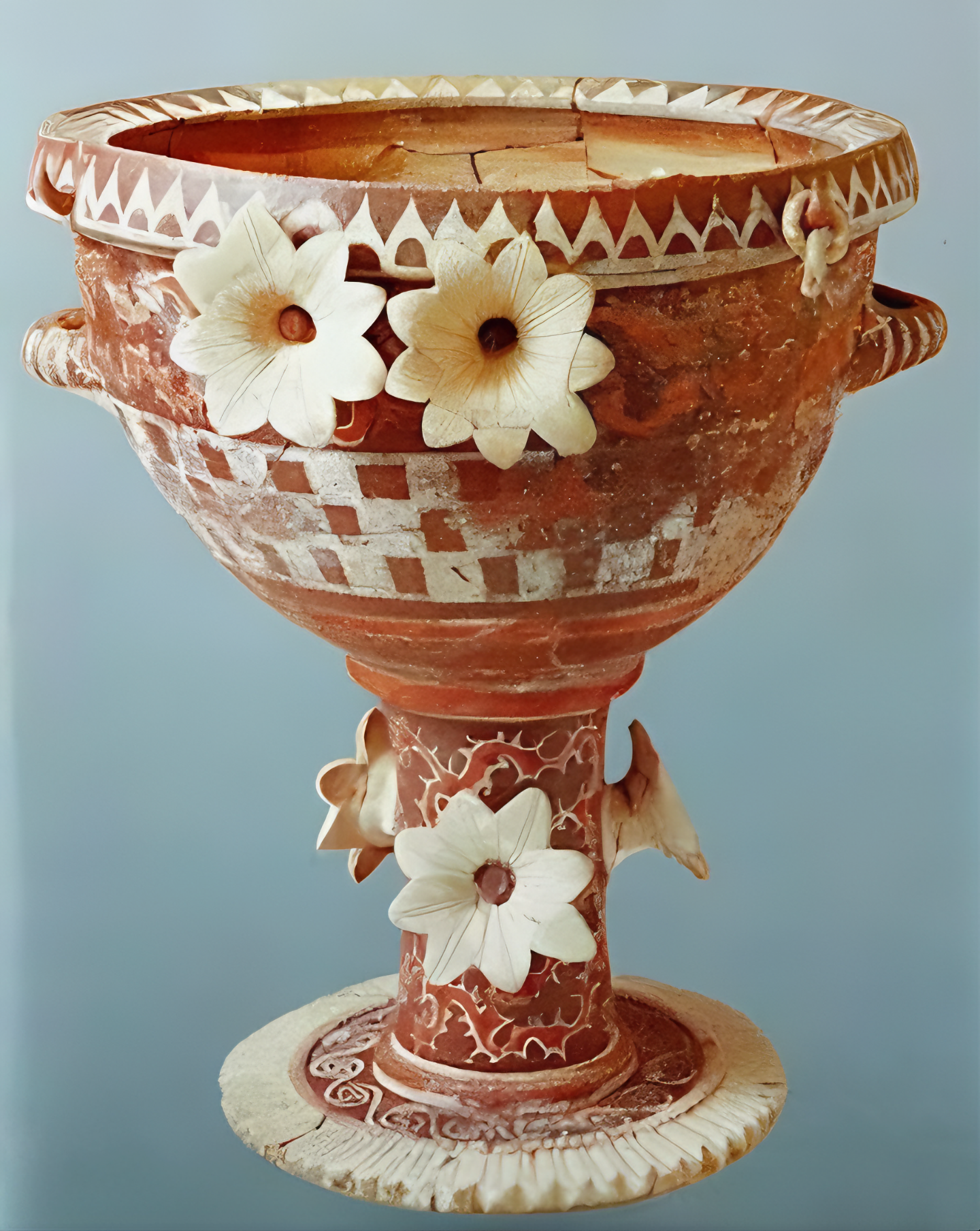 진짜로 꽃을 덕지덕지 장식물로 붙인 도기라, 제작 시점은 기원전 1천700년 무렵으로 본다 한다.