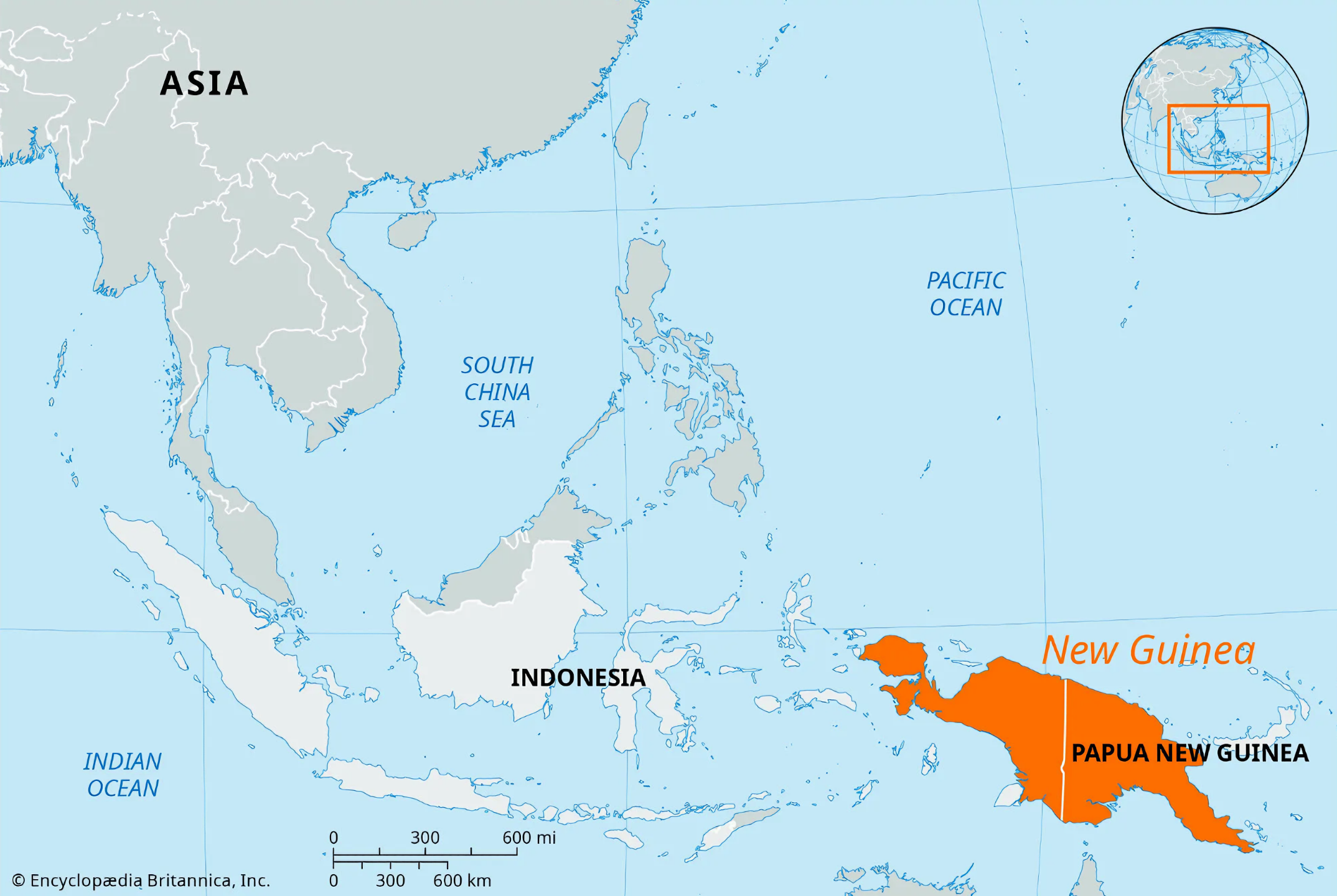 동쪽 절반은 1975년 독립국이 된 파푸아뉴기니Papua New Guinea 대부분을 차지한다.