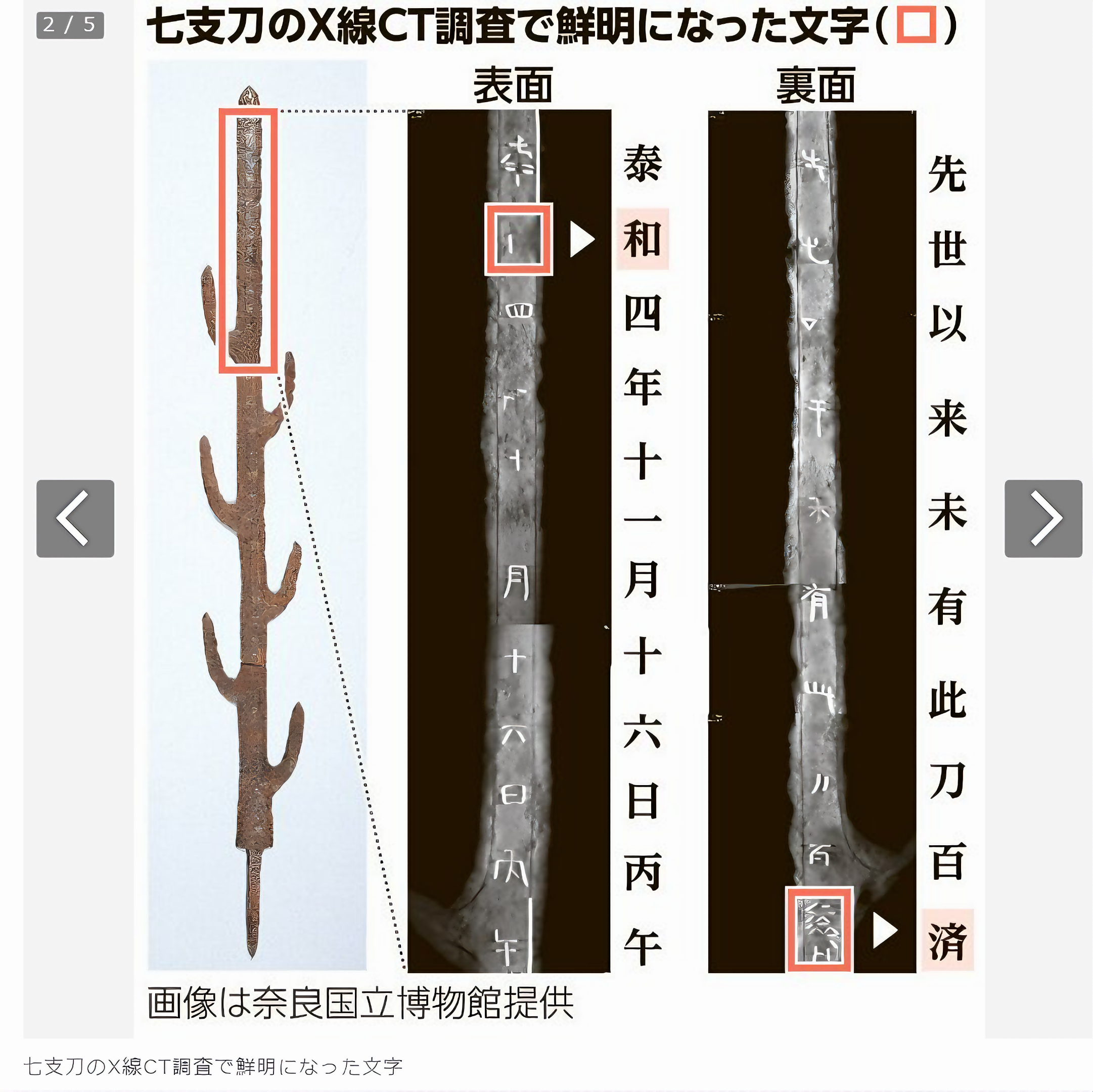 나라奈良 석상신궁石上神宮[이소노카미 신쿠]에 전하는 국보 칠지도七支刀(4세기)를 처음으로 X선 CT(컴퓨터 단층 촬영) 조사한 결과 금 상감 글씨가 선명하게 드러났다.
