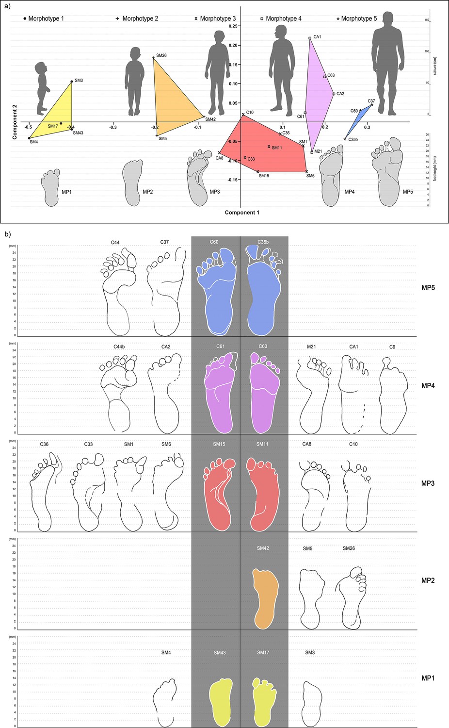 가장 잘 보존된 발자국 11개를 형태 분류 및 형태 계측법morpho-classificatory and morphometric approaches을 사용해 추가 조사한 결과 발자국을 만든 사람들 최소 수를 추정했다.
