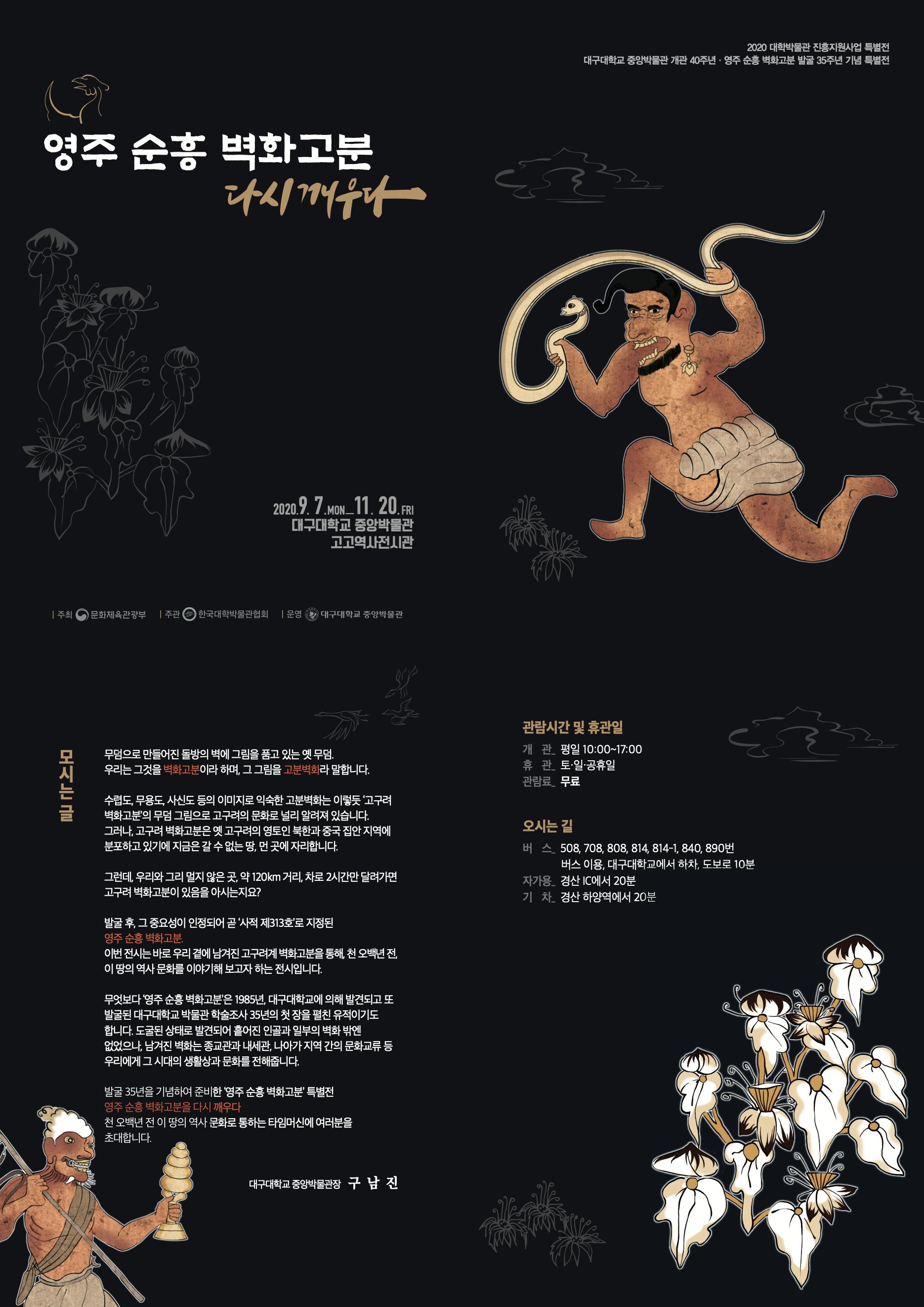 539년 이 땅의 역사 문화를 품은 ‘영주 순흥 벽화고분’을 발굴 35년 만에 다시금 대중 앞으로 성큼 일으켜 세운 이번 특별전, 전시 타이틀도 [영주 순흥 벽화고분_다시 깨우다] 이다.