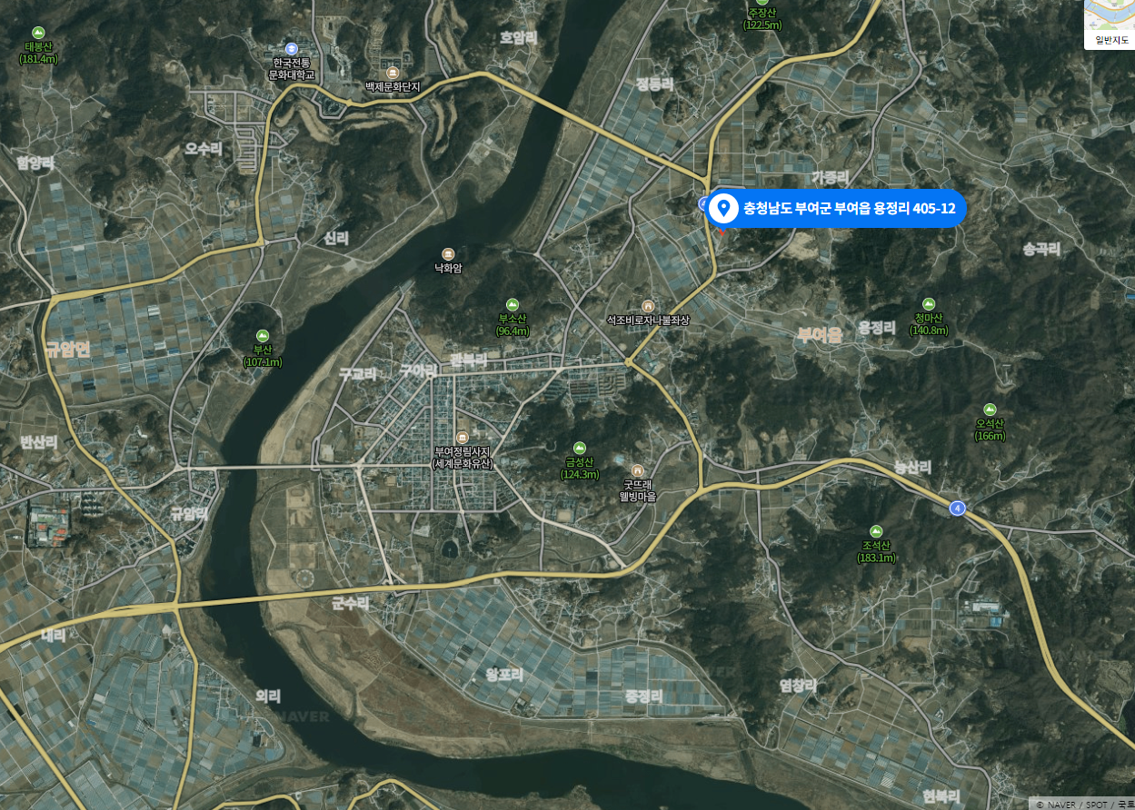 이런 소식이 부여발로 전해졌으니, 위선 그 위치 충남 부여군 부여읍 용정리 405-12번지 일원을 지도에서 살핀다.