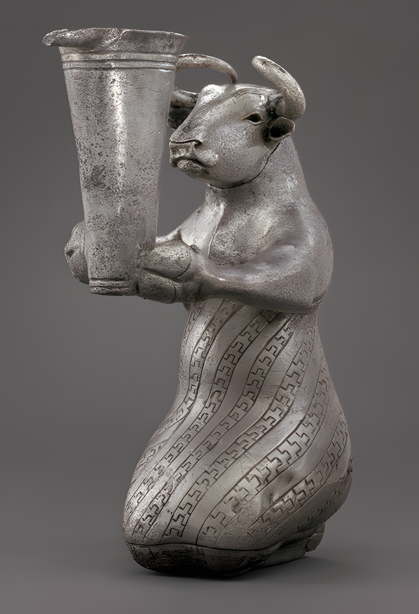 이 5,000년 된 은제 조각상은 인간과 유사한 자세로 무릎을 꿇고 주둥이가 있는 그릇을 든 황소를 묘사한다.