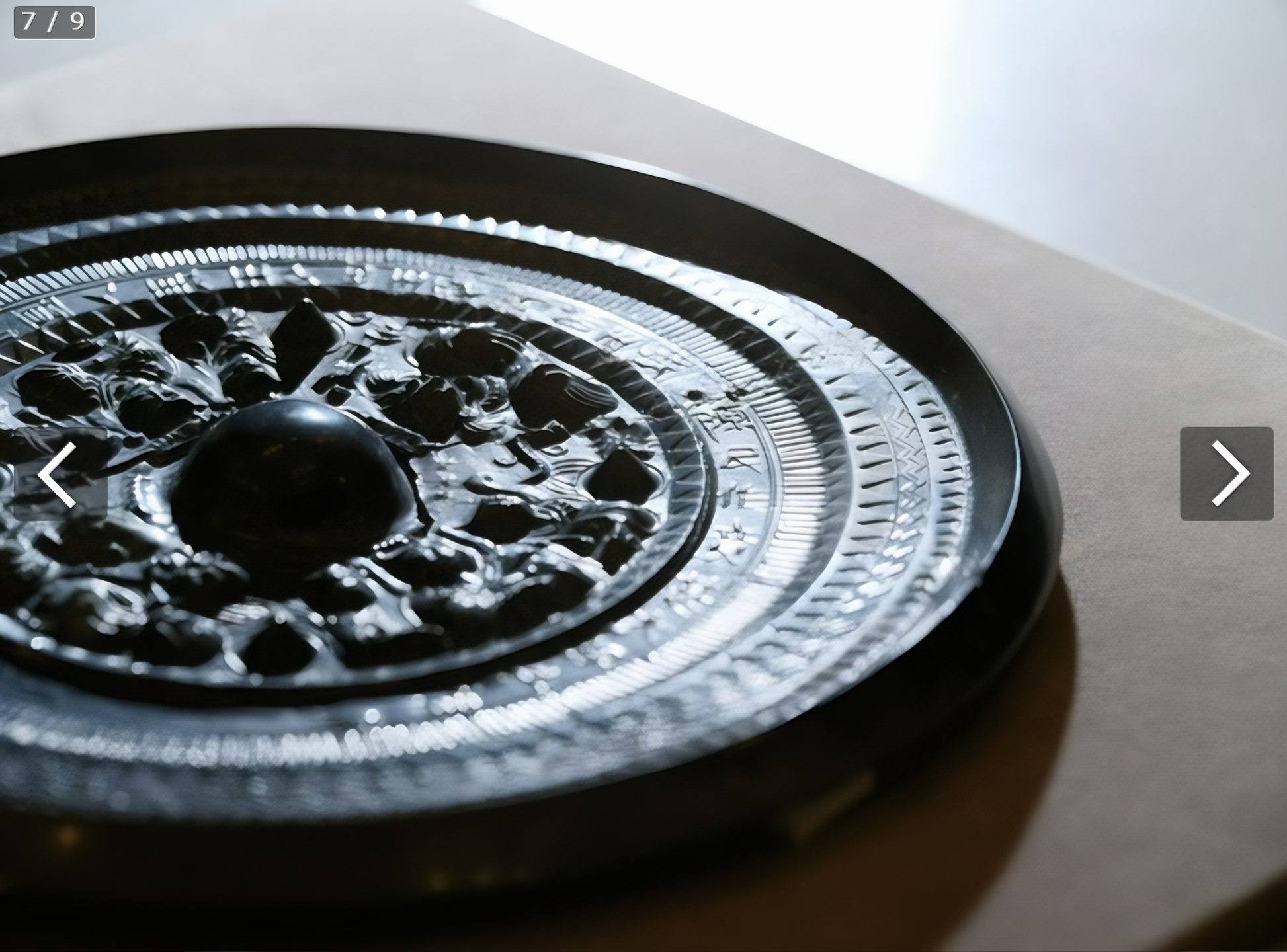 이번 것은 직경 19센치로 일본국 출토 동일 동경으로는 최대다. 용이나 호랑이를 나타내는 역S자형 문양이 있다.