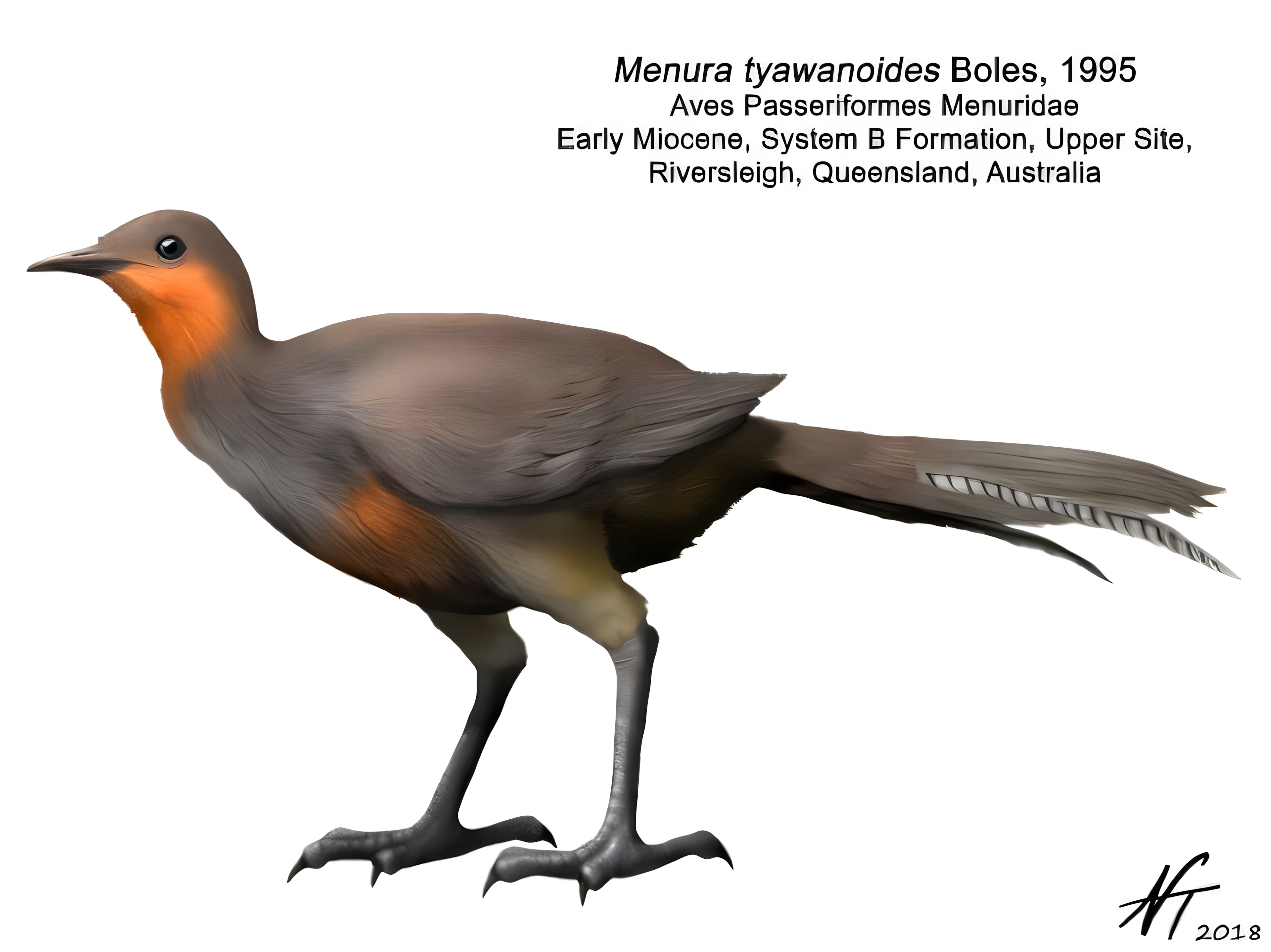 이 메누라 티아와노이데스Menura tyawanoides의 손목뼈 화석은 보도자료에 따르면 1,700만 년에서 1,800만 년 전의 것으로 추정된다.
