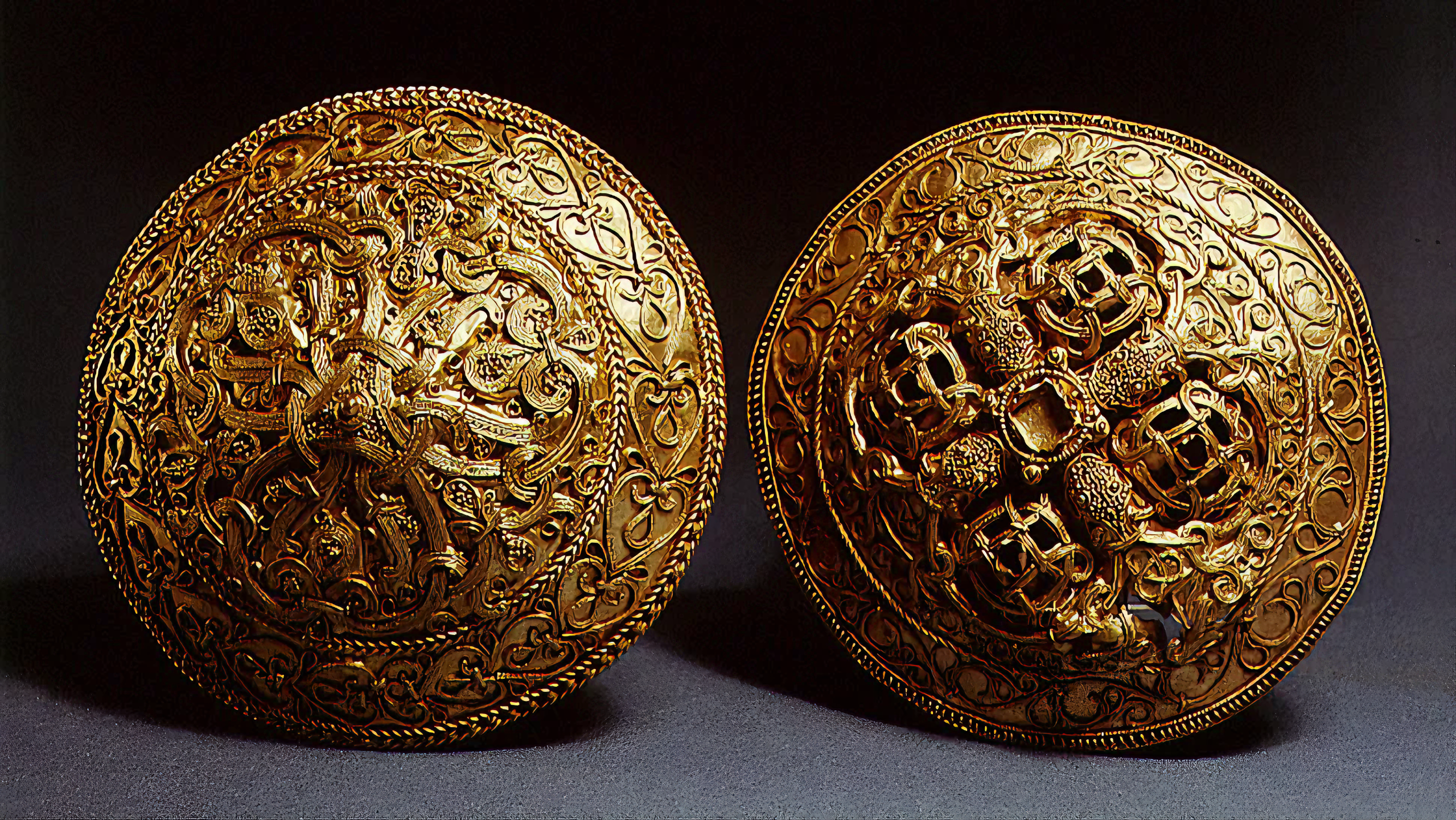 이 두 개 브로치는 덴마크 남서부 유틀란트Jutland 반도에서 금팔찌와 함께 발견된 작은 보물 중 일부였다.
