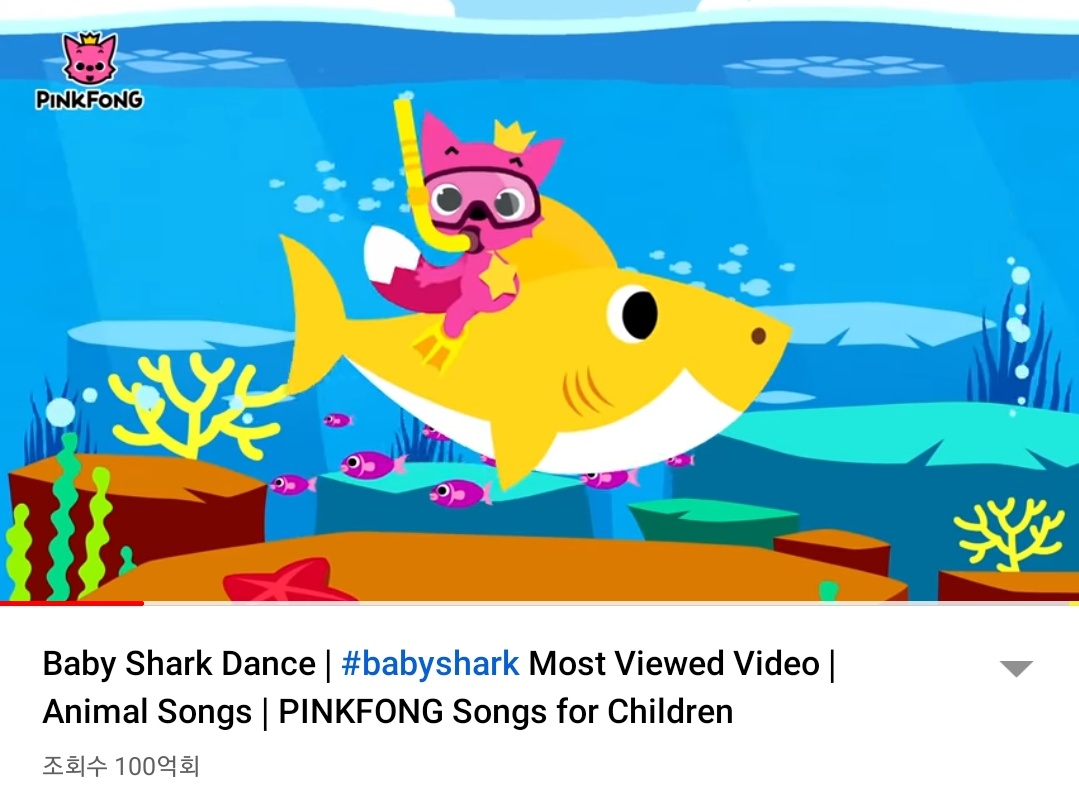 한데 그런 강남스타일도 무색케 하는 또 하나의 영상 콘텐츠가 있으니 그것도 한국발이다. 아기상어 Baby Shark 영상 중에서도 "Baby Shark Dance" 영상이 한국시간 2022년 1월 13일 오후 4시 무렵 10 billion views를 돌파하는 기적을 이루었다. 지구촌 인구 숫자를 뛰어넘은 수치다.