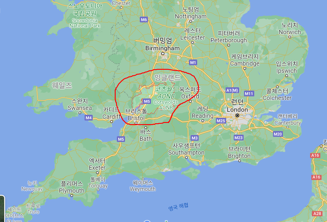 아무튼 우선 Cotswolds-Severn 이라는 키워드로 그곳이 어디메인가를 구글 지도로 찍어보니 요상해서 아래와 같이 검출된다.