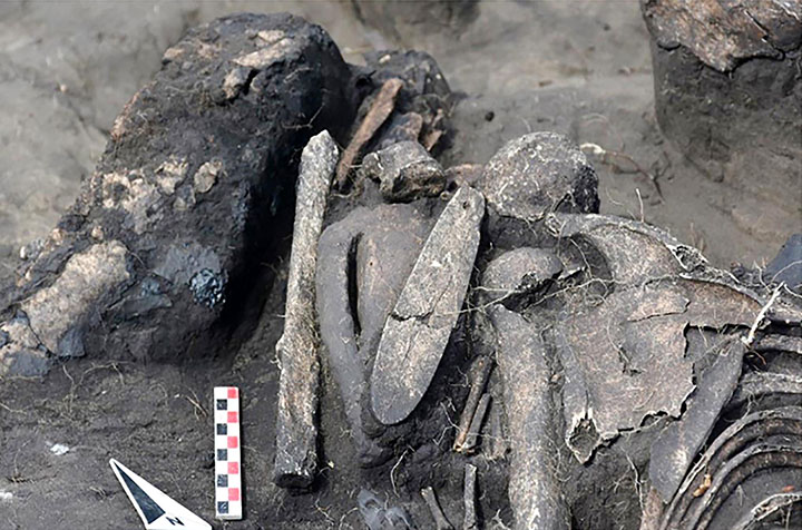 우리 기사를 보면 문제의 조각이 "자작나무 껍질로 둘러싸인 남녀 유골들과 함께 있었다"고 하는데, 사진이 제시하는 인골 사진을 보니 남녀 유골은 나란히 매장한 것이 아니고 아래위로 놓인 듯하다.