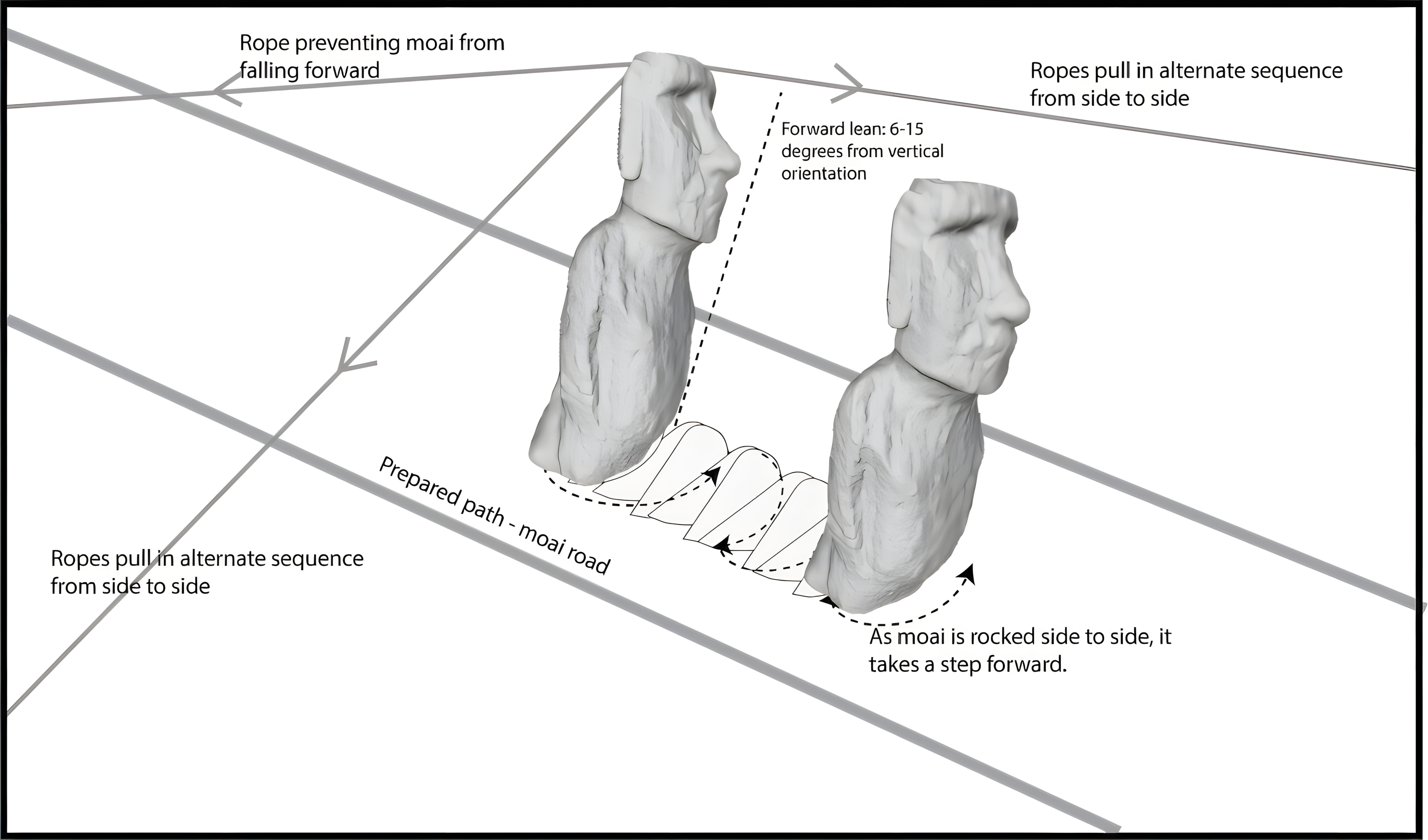 연구진은 로프와 18명 인력만으로 40분 만에 모아이 석상을 100미터 이동시켰다.