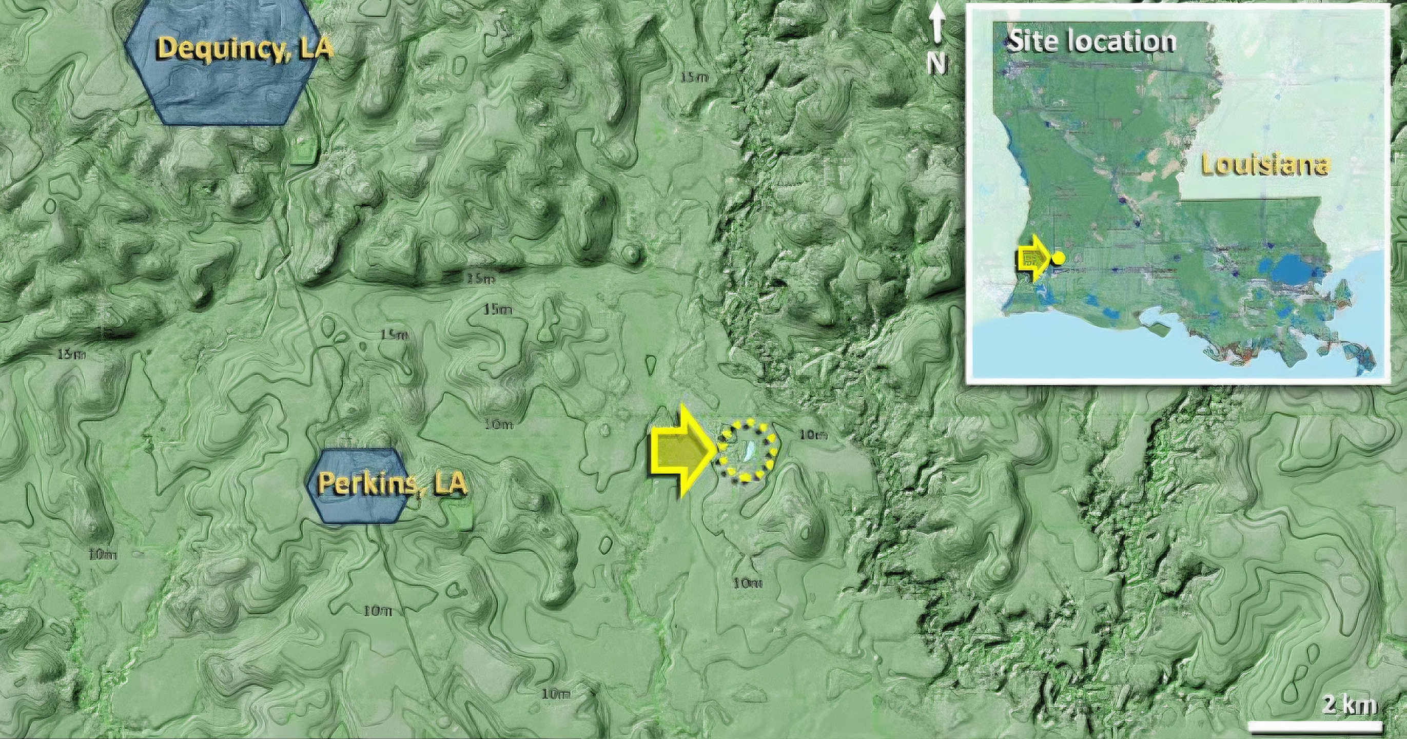 12,800년 전 충돌 증거를 보여주는 루이지애나 공중폭발 분화구 함몰부. 이 호수는 루이지애나주 퍼킨스 동쪽, 루이지애나주 남서쪽 모서리(삽입 그림, 화살표)에 위치하며 퍼킨스 지역으로 불린다. 출처: 기본 이미지: USGS. 삽입 이미지: Google Maps, 2024, INEGI. ScienceOpen
