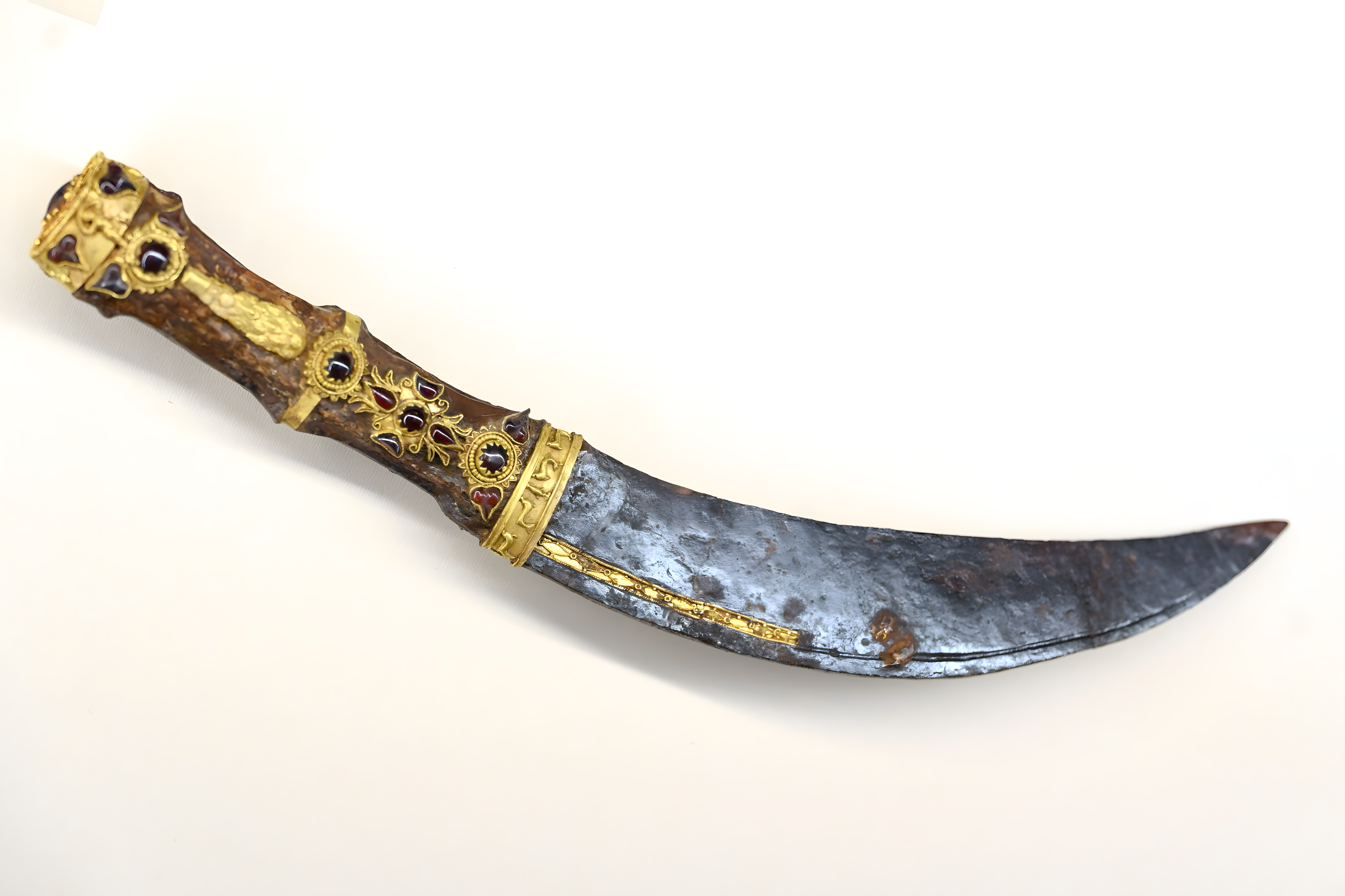 무덤에서 발견된 다른 유물로는 도기와 유리 그릇, 철제 창과 방패, 은으로 만든 보석과 독특한 보석으로 덮인 칼이 있다.