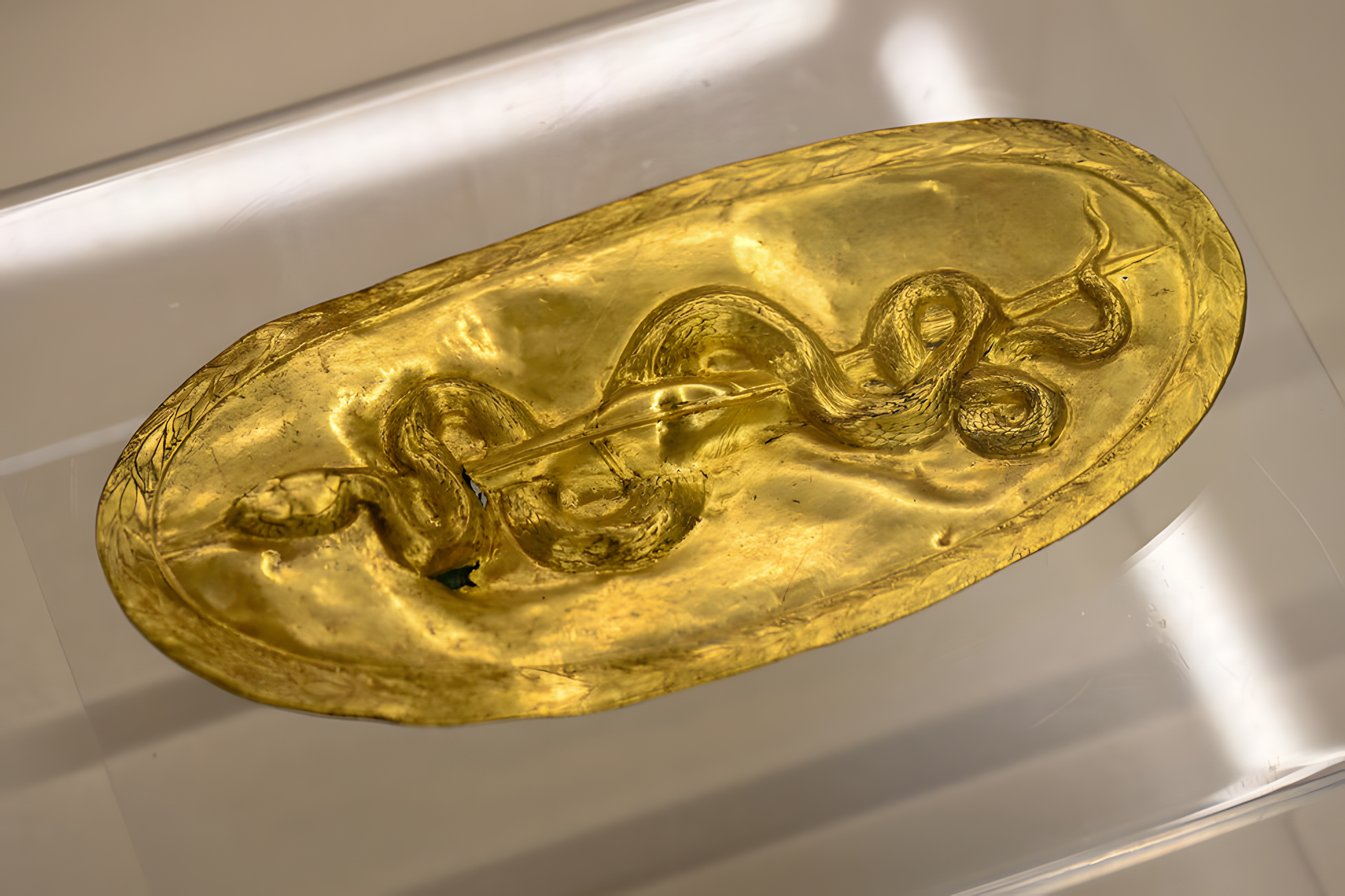 마구에는 헤라클레스 공적을 더 잘 보여주는 것으로 추정되는 다른 동물들 청동 조각상과 더불어 뱀을 그린 금제 머리 장식이 있었다.