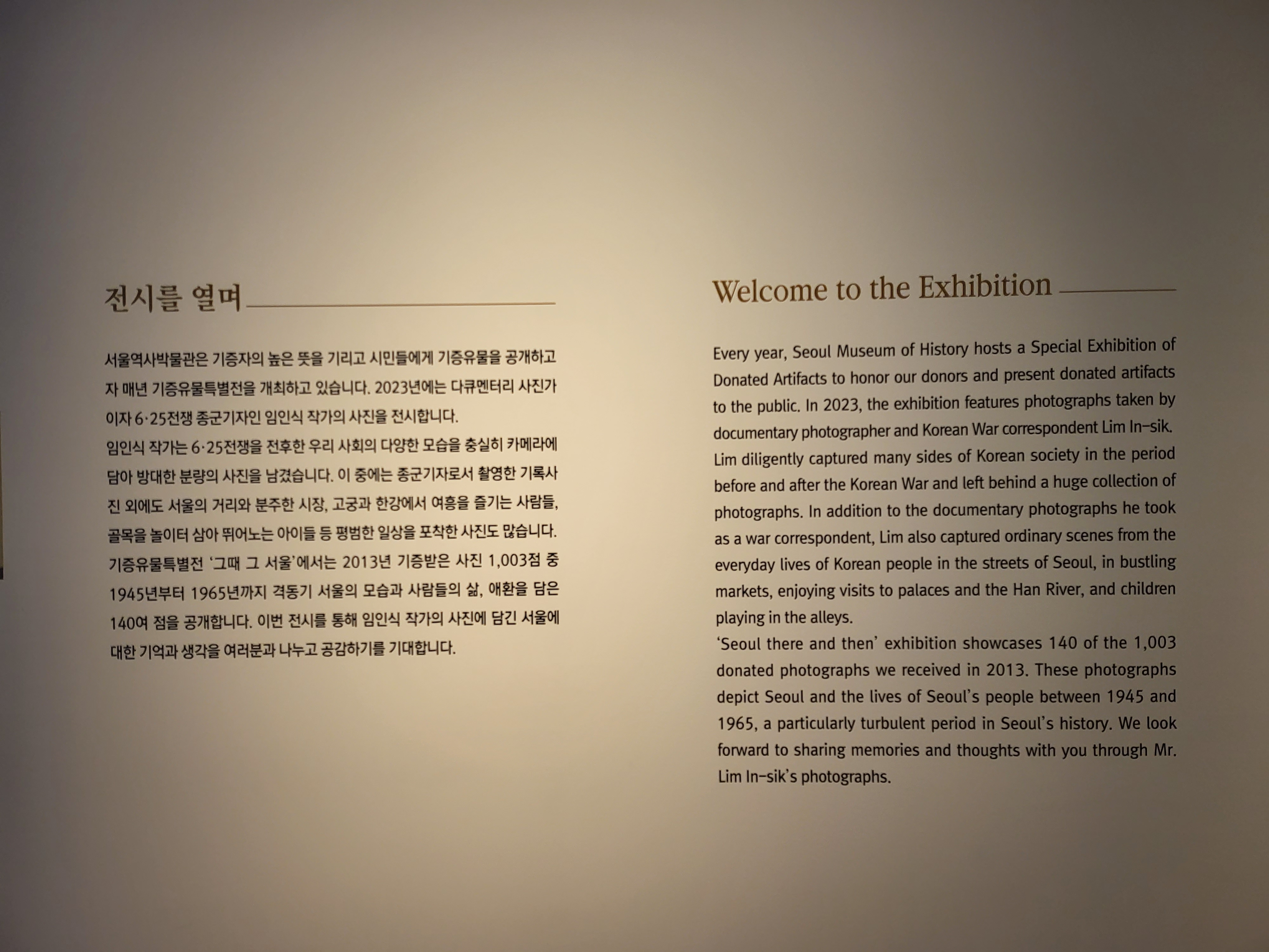 이번 특별전에는 개중 140여 점을 선별해 소재 혹은 주제별 배치를 했으니 폐허가 된 서울, 하늘에서 본 서울, 격동기 서울, 삶의 현장 남대문시장, 서민들의 휴식처 고궁, 생업과 놀의 공간 한강, 골목 안 아이들, 스포츠 문화의 확산 8가지가 그것이다.