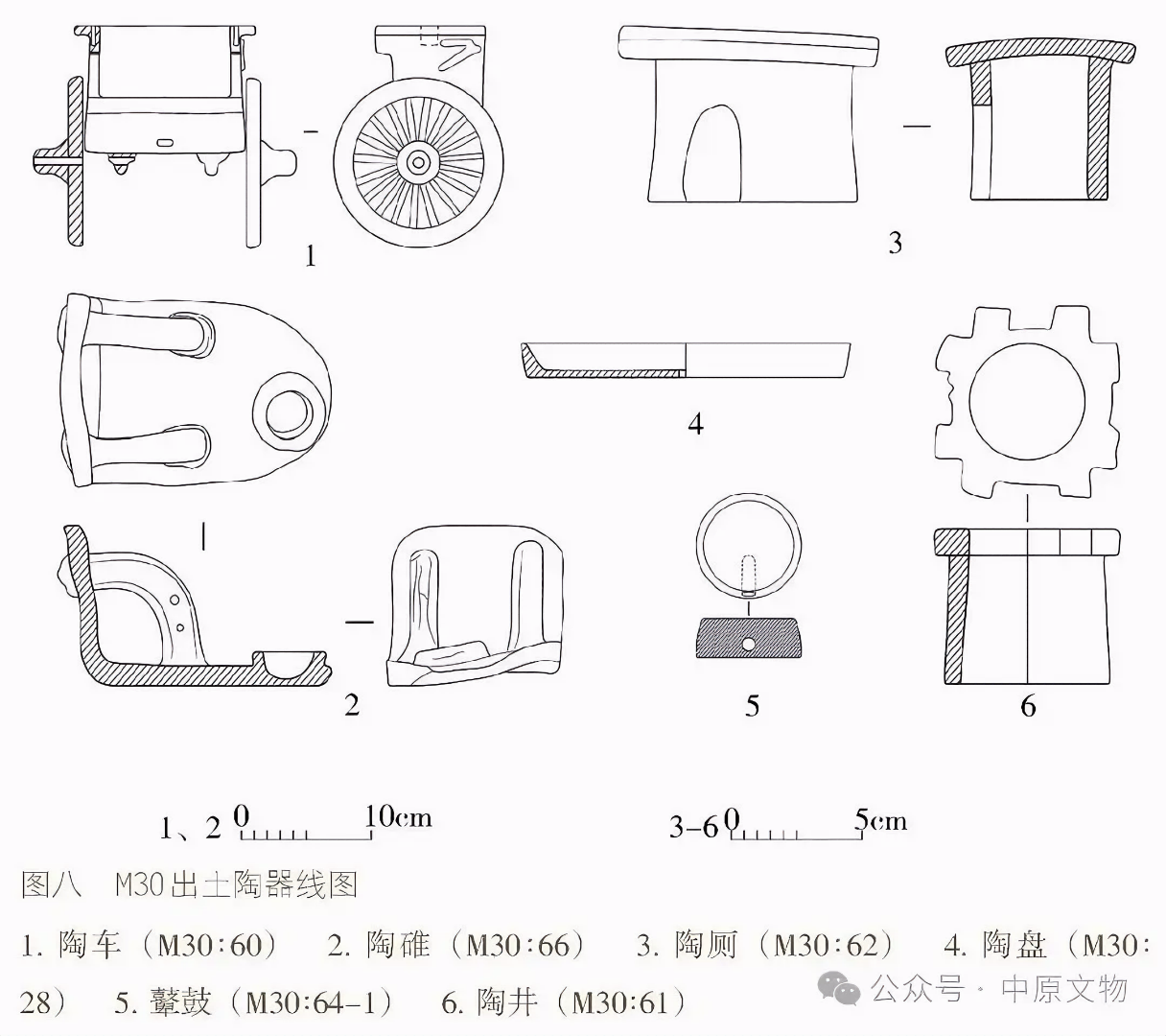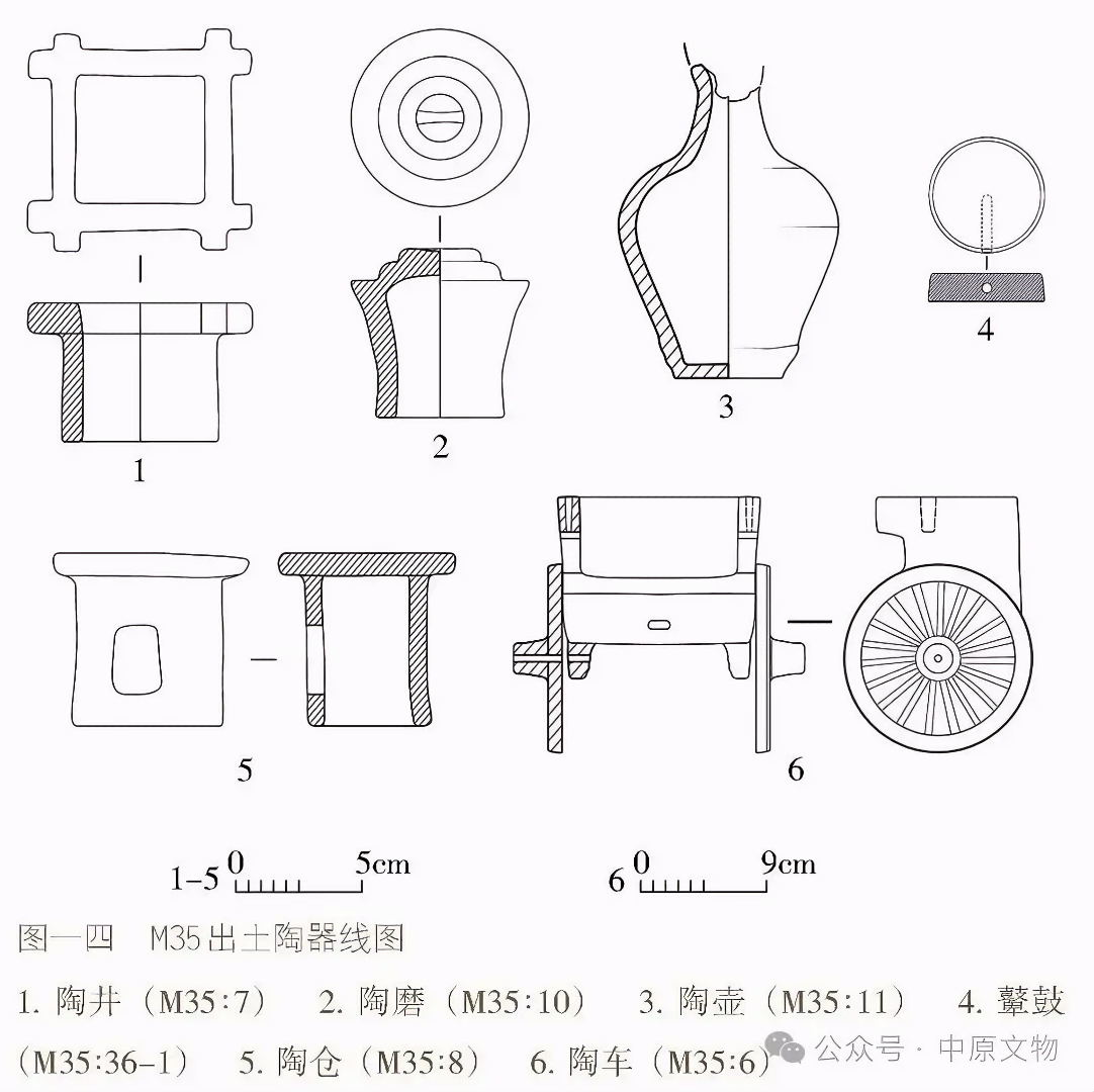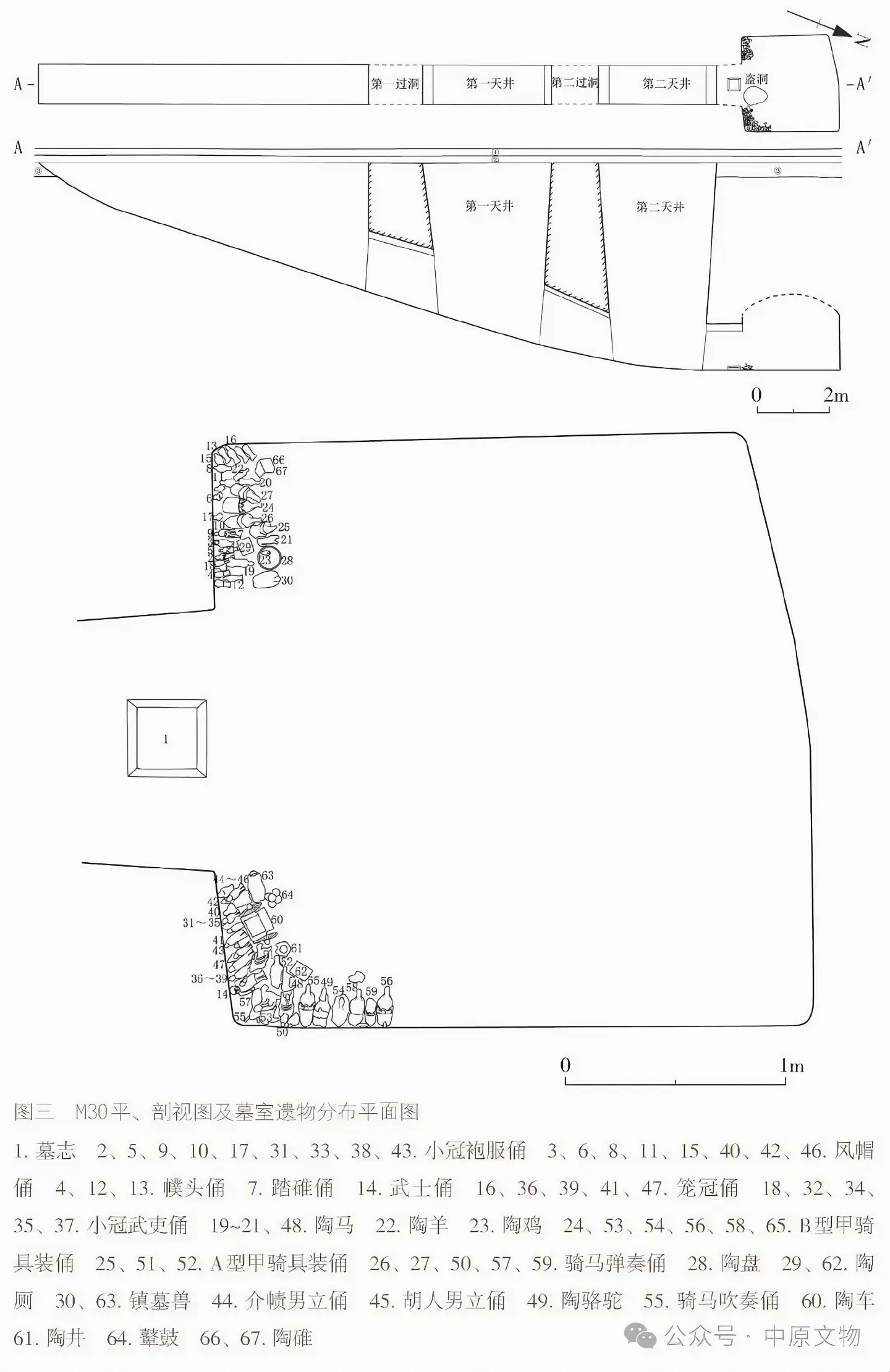 출토 도자기 66점(그룹)에는 용俑, 말, 낙타, 개, 닭, 수레, 우물, 화장실 등이 있으며 모두 흙으로 된 회색 도자기泥质灰陶다.