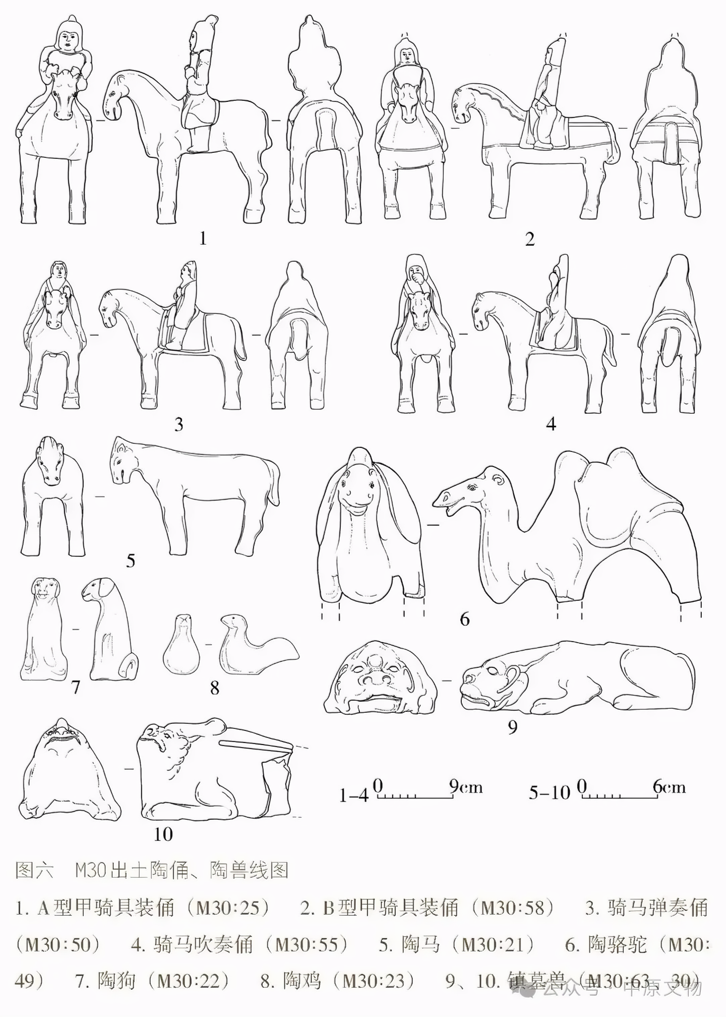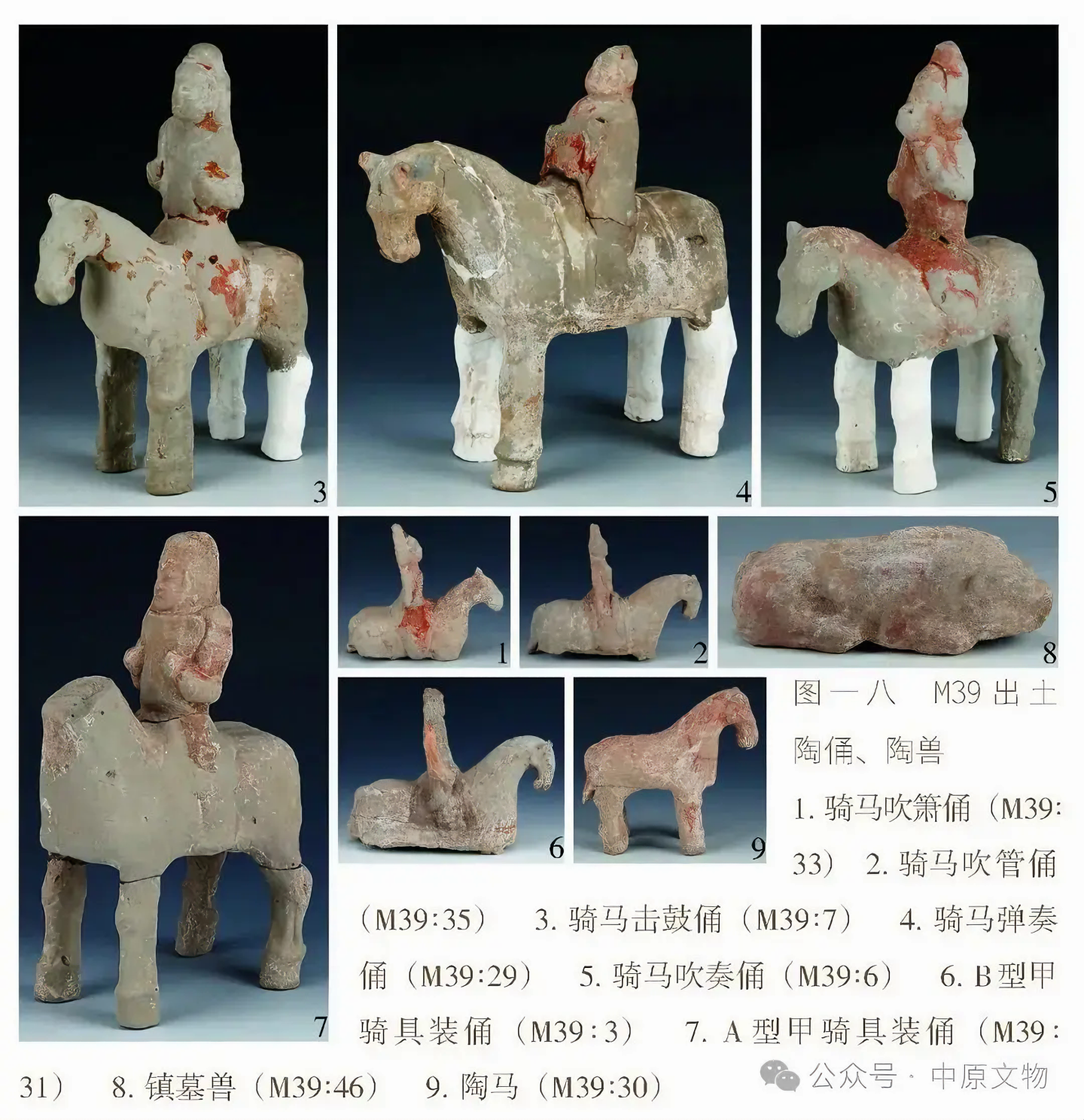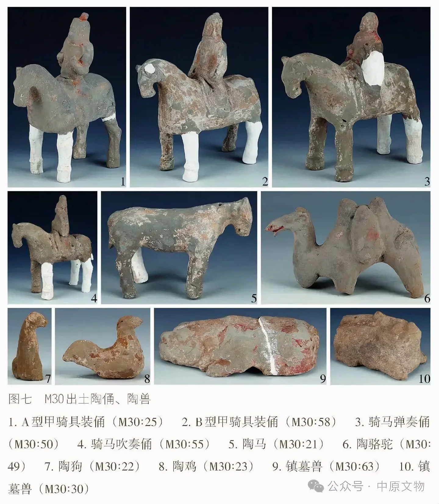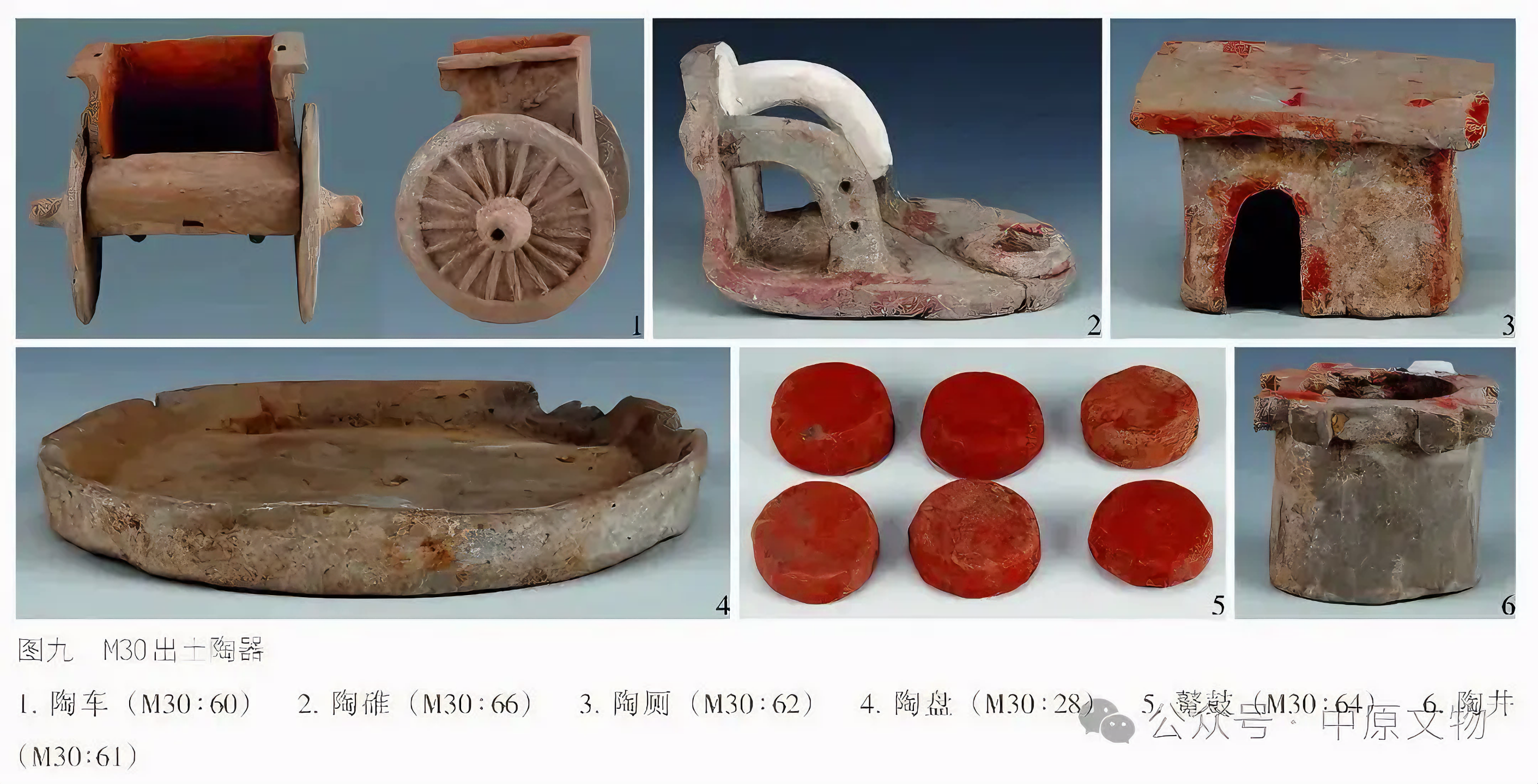 출토 도자기 66점(그룹)에는 용俑, 말, 낙타, 개, 닭, 수레, 우물, 화장실 등이 있으며 모두 흙으로 된 회색 도자기泥质灰陶다.
