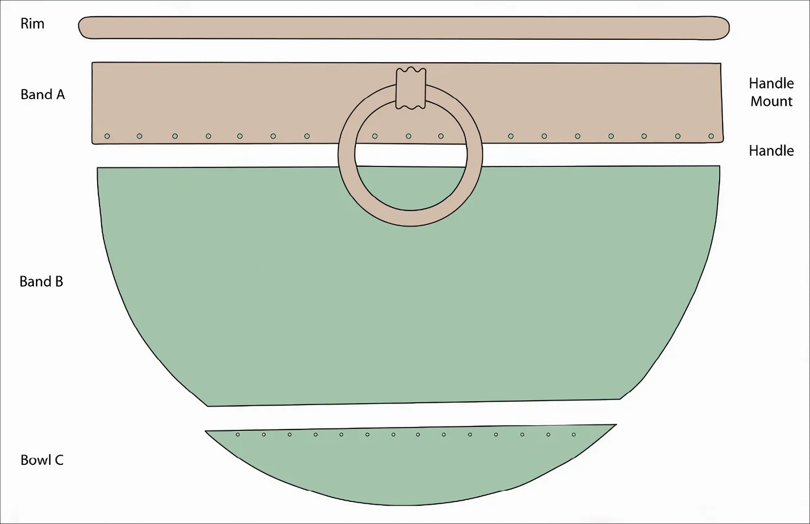 콜드론은 철제 테두리, 반구형 구리 합금 그릇, 그리고 철제 상단 띠에 부착한 두 개 철제 고리 손잡이 등 여러 부분으로 구성되어 있다.