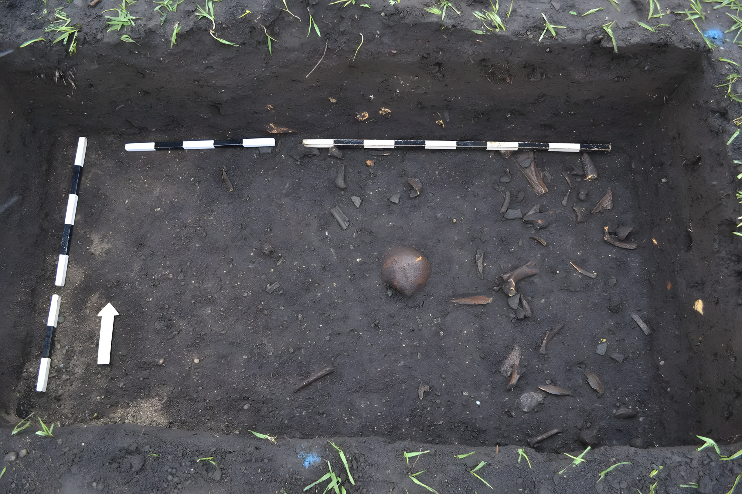 이 유물에는 최소 세 명의 유해, 동물 유해, 32점 금속 물체, 그리고 50점이 넘는 도기 용기 조각이 포함되어 있었다.