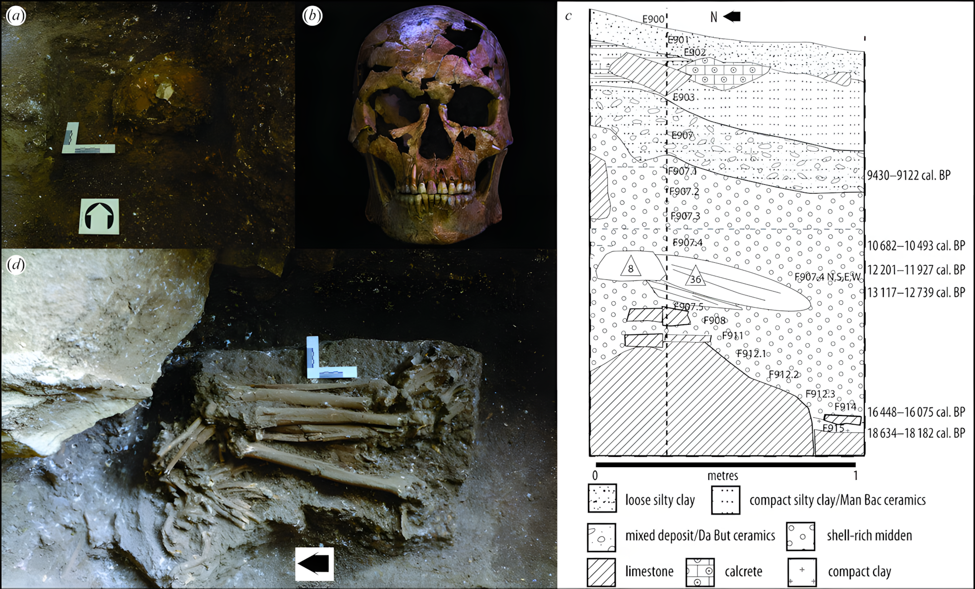 TBH1. (a) 파괴된 두개골, (b) 재건 후 두개골, (c) 대표적인 서향 단면. 보정된 방사성탄소 연대(현재(cal. BP) 이전 보정)와 TBH1의 지층 위치를 보여줌. (d) 인골 출토. https://doi.org/10.1098/rspb.2025.1819