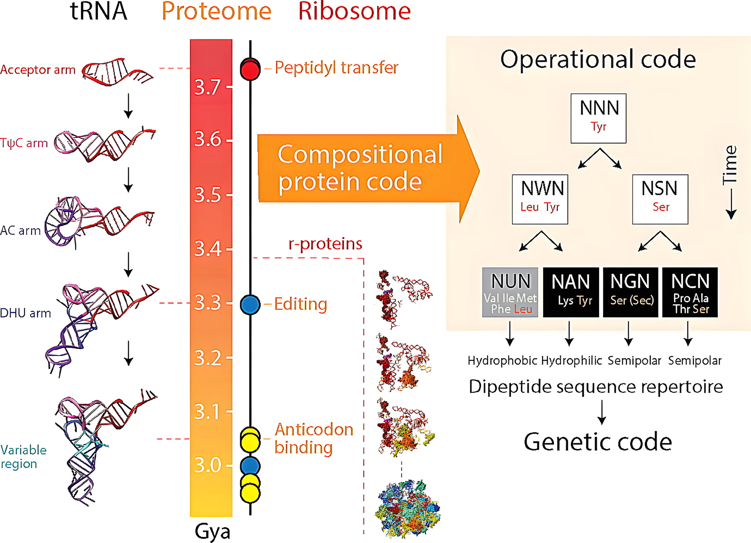 이전 연구에서 연구진은 tRNA 계통수를 구축하여 아미노산이 유전 암호에 진입하는 과정을 시간적으로 분석하고, 아미노산을 출현 시점에 따라 세 그룹으로 분류했다.