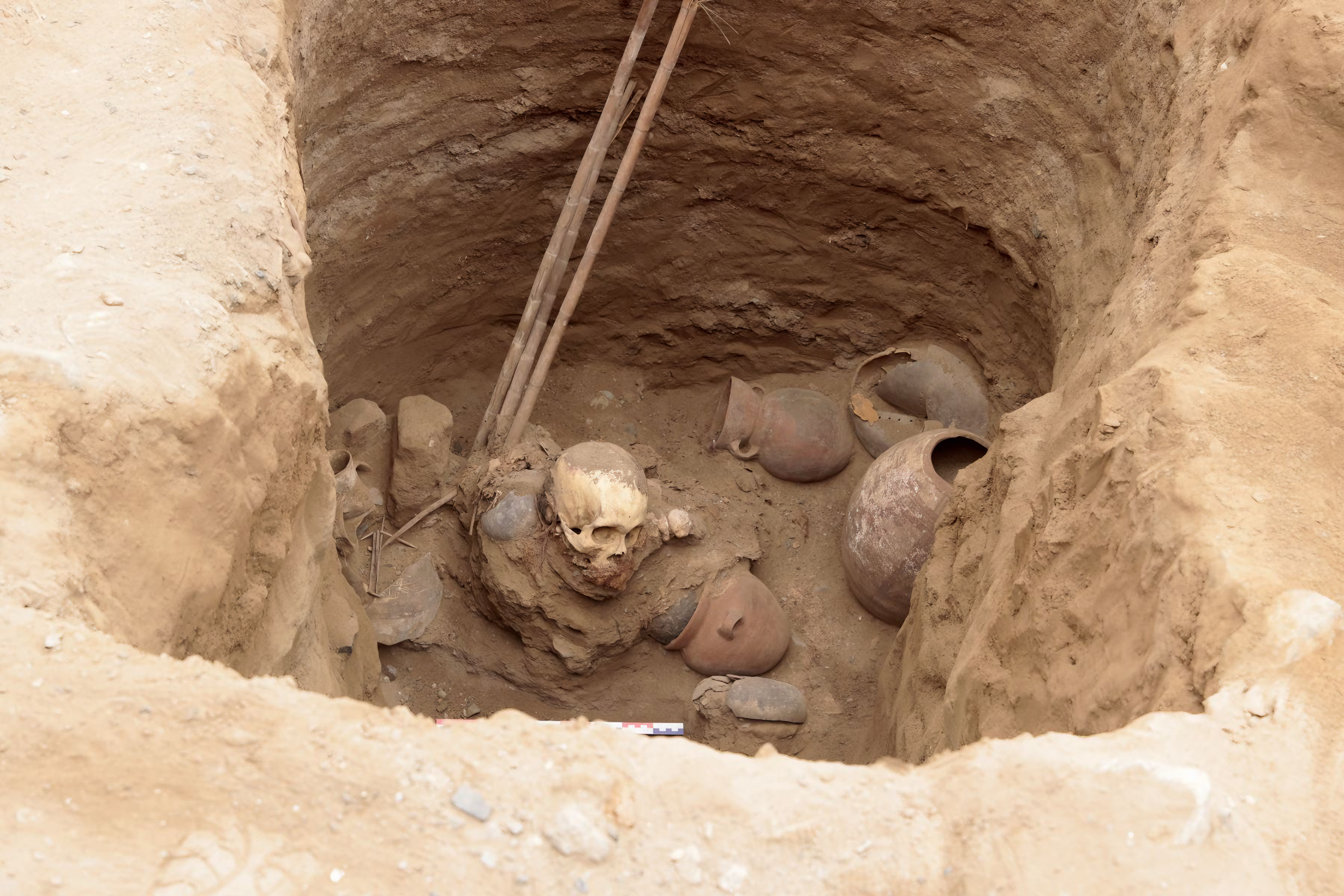 Descubrimiento arqueológico de más de 1,000 años en Puente Piedra 31/07/2025 El importante hallazgo arqueológico es una tumba en forma tubular, que contenía en su interior un fardo funerario de un personaje adulto, acompañado de un ajuar de vasijas: