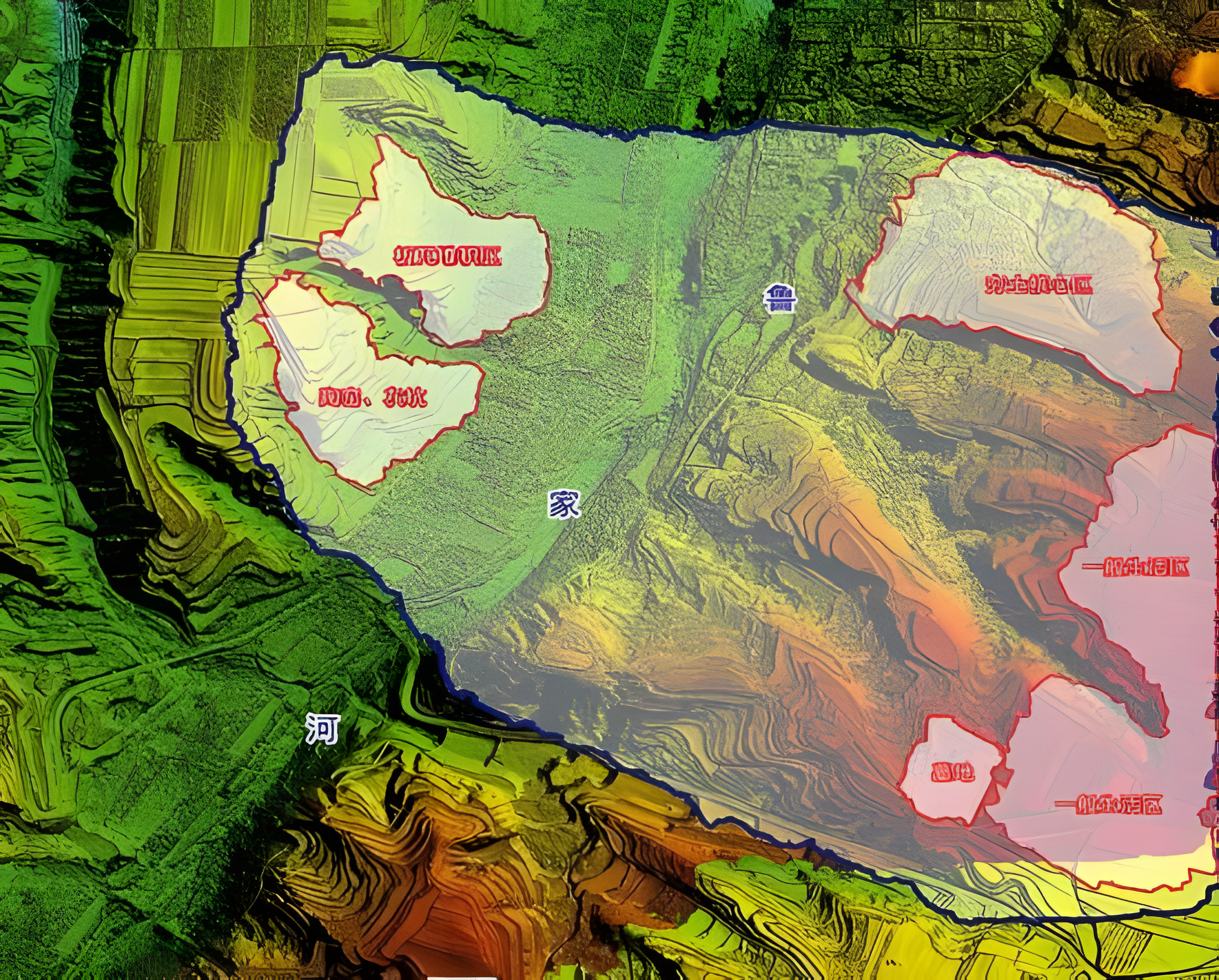 탐사 결과, 회갱과 판와板瓦 등 건축 자재가 대량으로 쌓여 있는 것으로 나타났으며, 이는 중요한 건축물이 위치한 곳으로, 고급 인구가 거주하는 지역이다. 도시 지역 외곽은 일반 주거와 무덤이다.