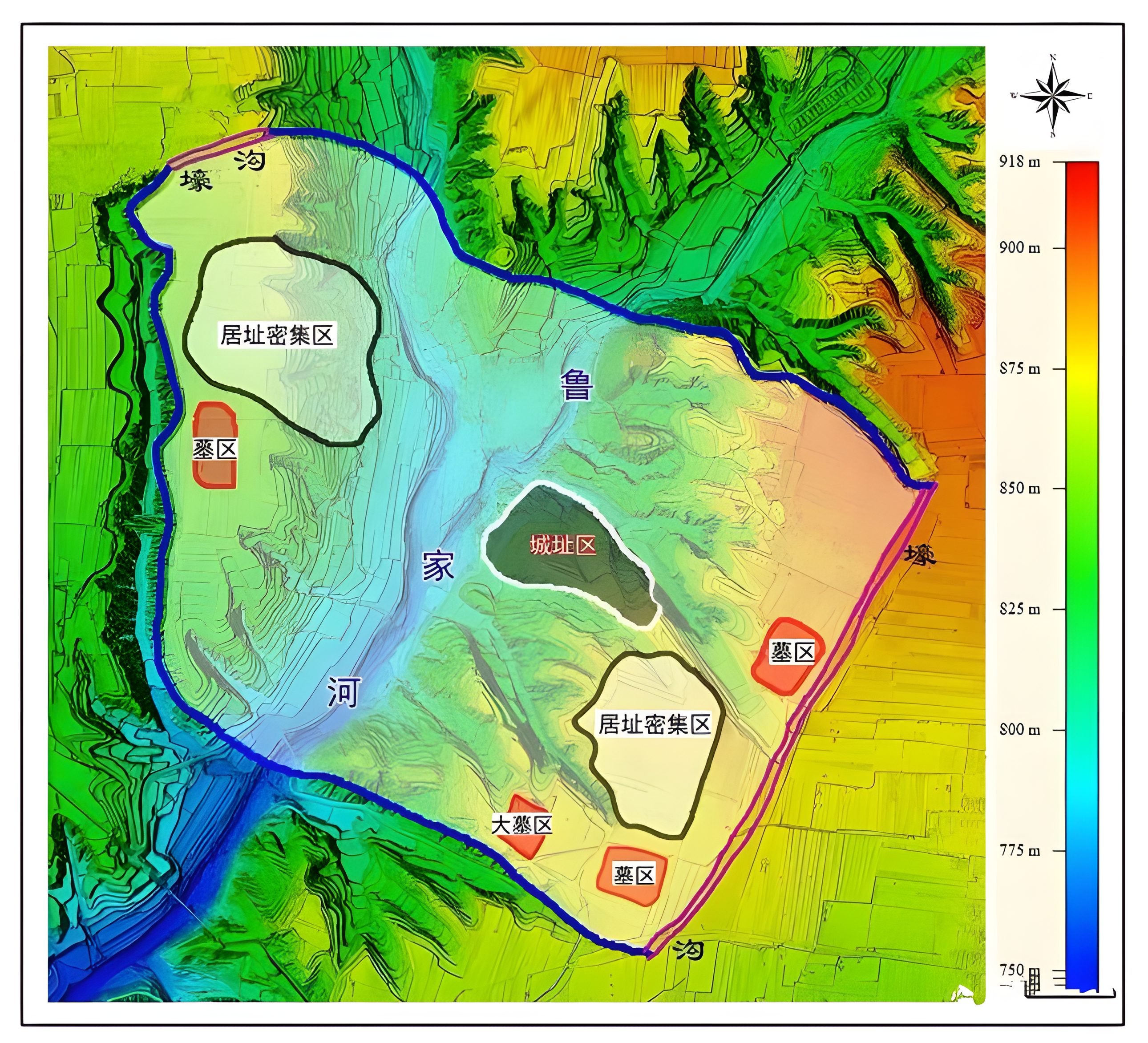 조사 결과 유적 범위는 약 3제곱킬로미터로 서쪽, 남쪽, 북쪽 세 면이 자연 참호를 경계로 삼고, 동쪽은 인공 참호를 통해 외부와 분리되어 있으며, 참호 남쪽과 북쪽 끝은 자연 참호와 연결되어, 자연 참호와 인공 참호를 연결하여 동서 2000미터, 남북 1500미터 폐쇄된 대형 유적을 형성한다.