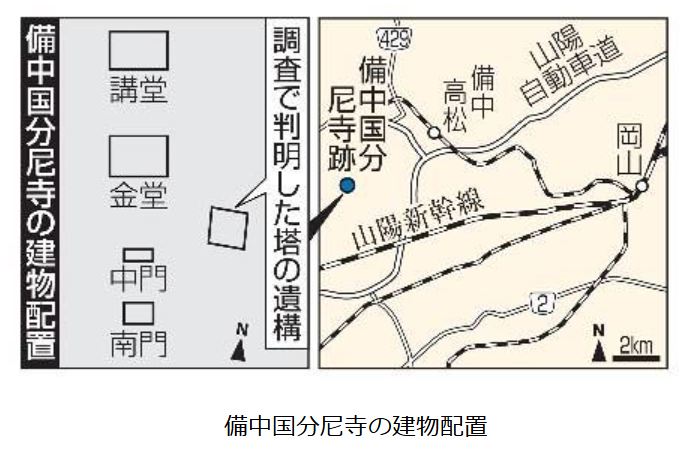나라奈良 시대에 성무聖武 천황 발원으로 건립된 비중備中 국분니사国分尼寺 유적에서 헤이안平安 시대 중기 탑 흔적이 발견되었다고 오카야마현 고대 기비 문화재 센터岡山県古代吉備文化財センター가 19일 발표했다.