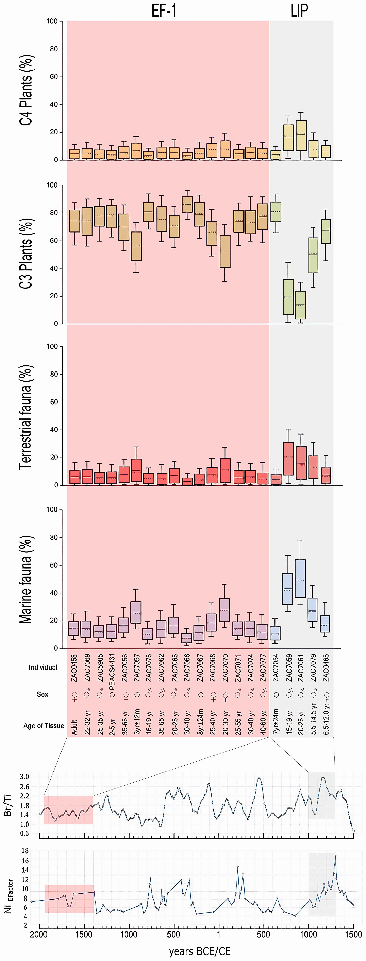 루이스 페조-란프랑코Luis Pezo-Lanfranco 박사와 그의 동료들이 초기 중부 안데스 문명 비차마Vichama (기원전 1800년~서기 1300년)를 산 38명 식습관을 재구성하기 위해 안정 동위원소 분석stable isotope analysis을 수행했다.