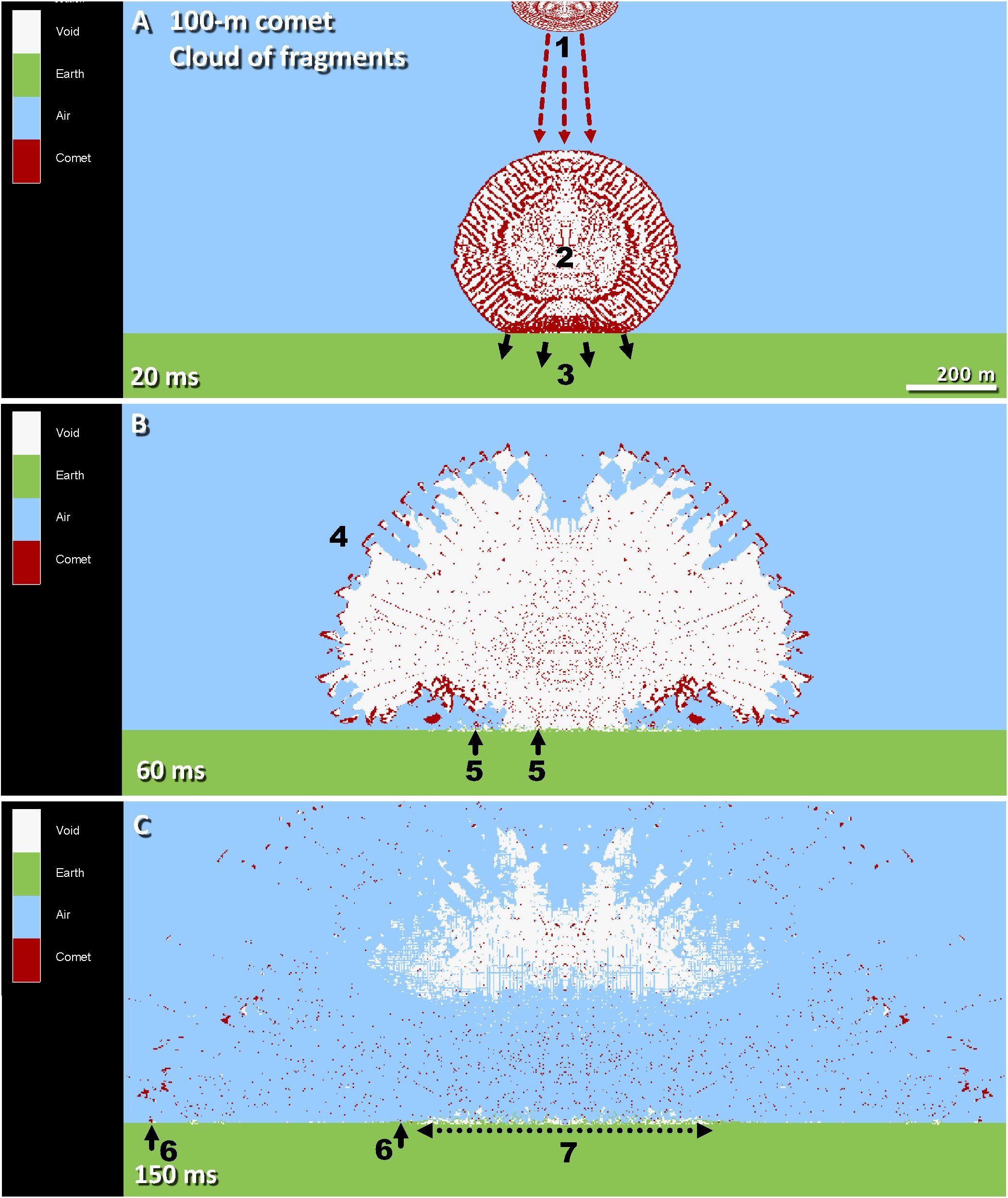 케넷과 동료들은 파편화한 혜성이 지상에서 폭발하여 지구에 충격파와 극심한 열을 보내는 시나리오를 제안한다.