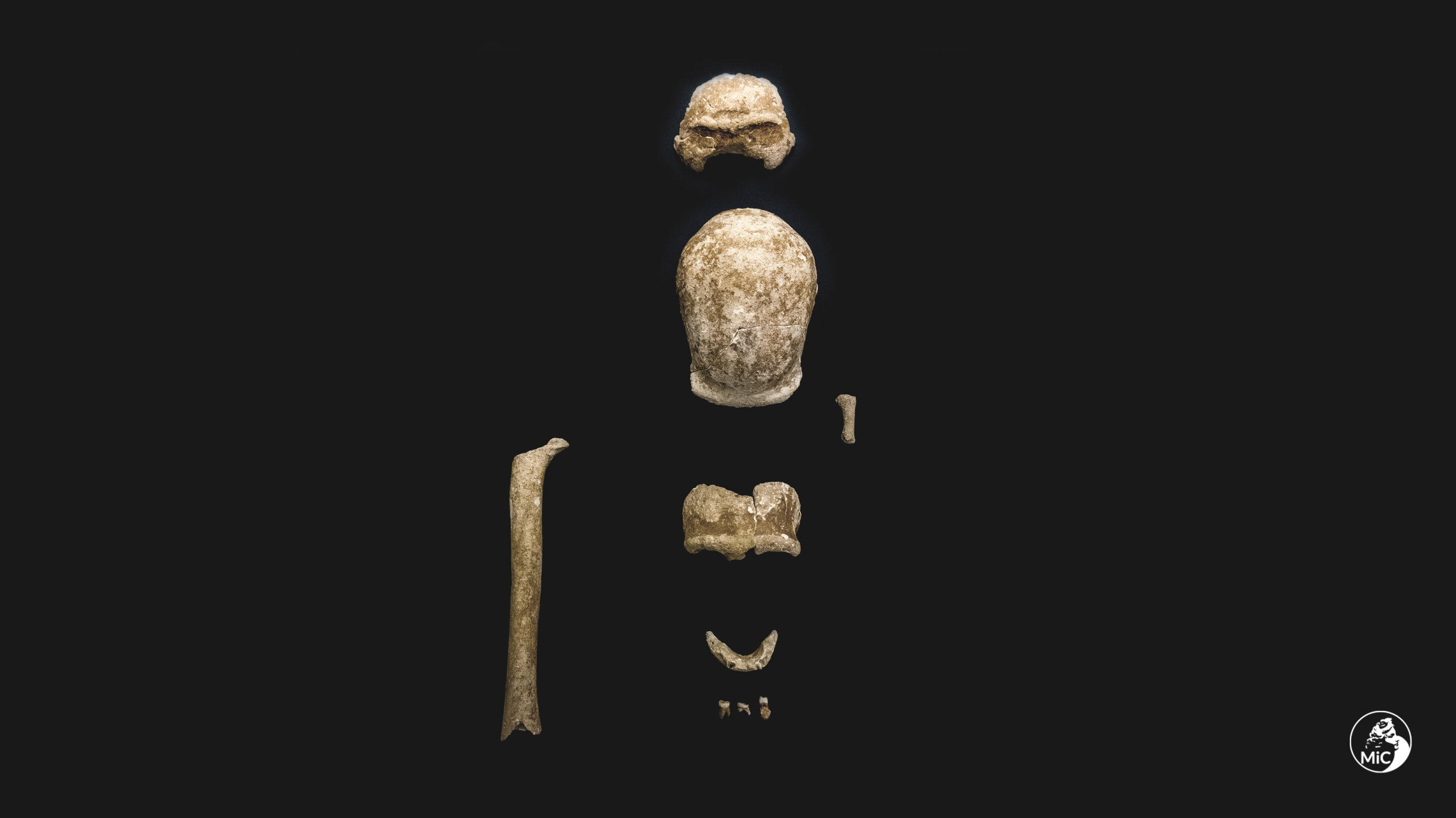 화석화한 뼈에는 두개골, 두개골 조각, 치아 두 개, 그리고 다른 뼈 조각이 포함된다.