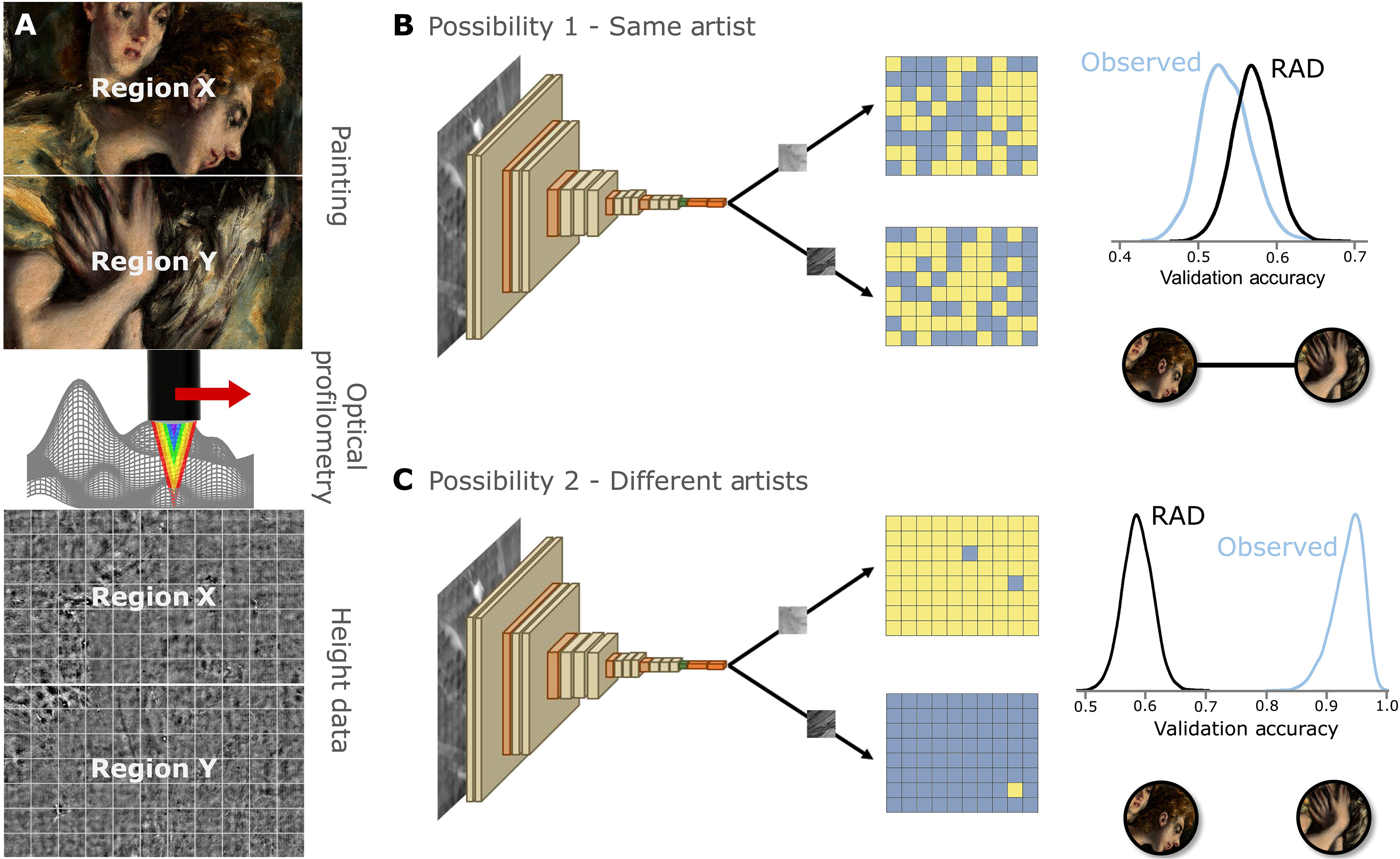 분석 원리. Overview of the first phase of the PATCH method. (A) Paint height data are gathered using optical profilometry, and two regions are chosen for comparison. Each region corresponds to an entire painting in the case of the student experiment, or a portion of a historical workshop painting, for example, the ones from El Greco’s The Baptism shown here. The height values are encoded in a 16-bit image file, which is subsequently divided into 1 cm–by–1 cm patches. (B and C) A CNN is repeatedly trained to sort patches of two images, recording its accuracy as a percentage of patches correctly sorted from the test set. This distribution of observed accuracies is compared to the random assignment distribution (RAD) of accuracies if the patches were sorted at random. If the observed accuracy is no better than the RAD accuracy, then the images were likely painted by the same artist, whereas if the observed accuracy is better than expected by chance, the images were likely painted by different artists. Image credit: painting images courtesy of Wikimedia Commons, public domain.