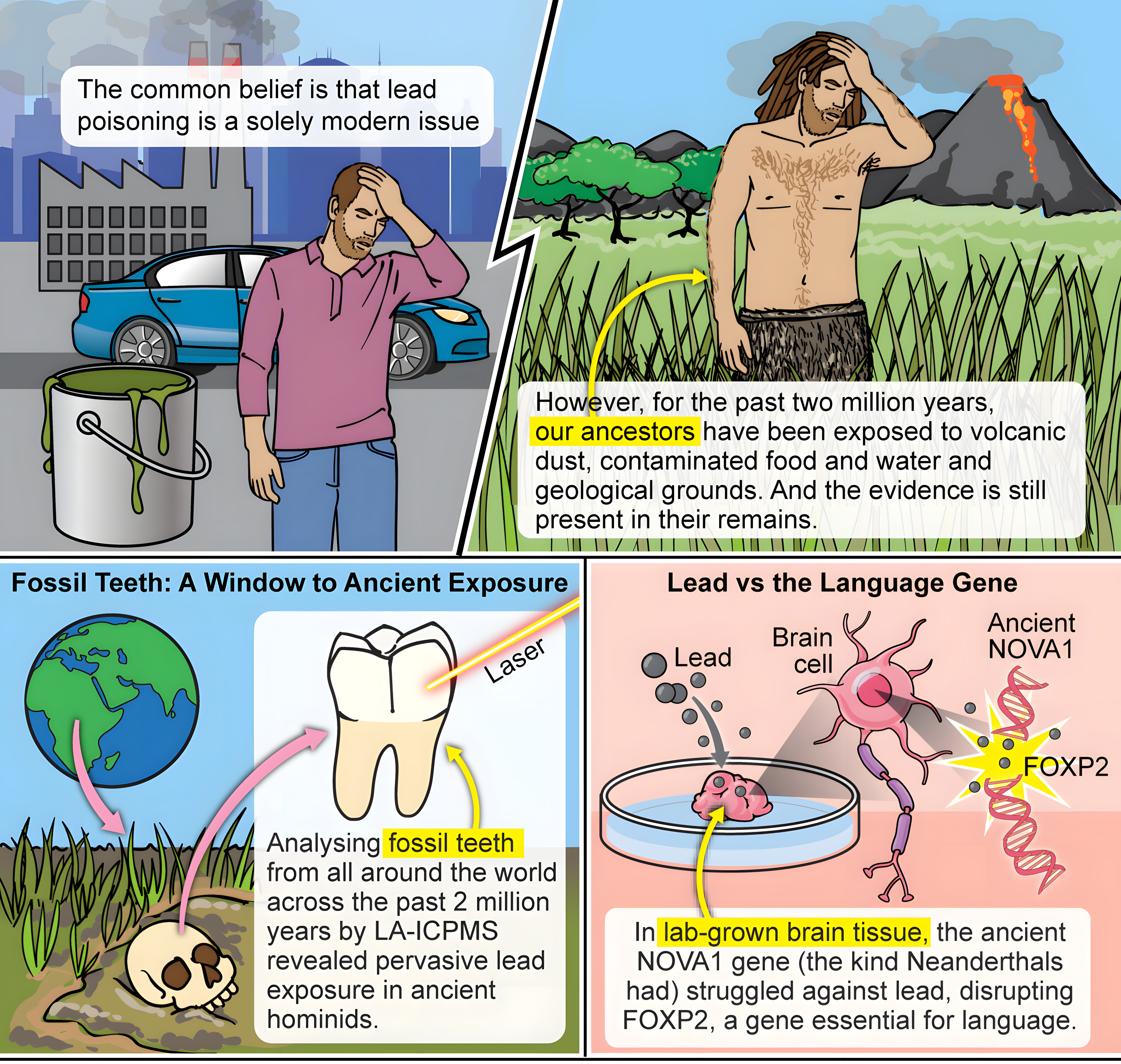 호주 서던 크로스 대학교Southern Cross University 지질고고학 및 고고측량학 연구단(GARG), 마운트 시나이 병원 아이칸Icahn School of Medicine at Mount Sinai Hospital 의대(뉴욕, 미국) 캘리포니아대학교 샌디에이고(UCSD, 미국) 의대 연구진이 주도한 이 연구는 새로운 화석 지구화학, 최첨단 뇌 오가노이드 실험, 그리고 선구적인 진화유전학을 결합하여 인류 역사에서 납이 차지하는 역할에 대한 놀라운 이야기를 밝혀냈다.