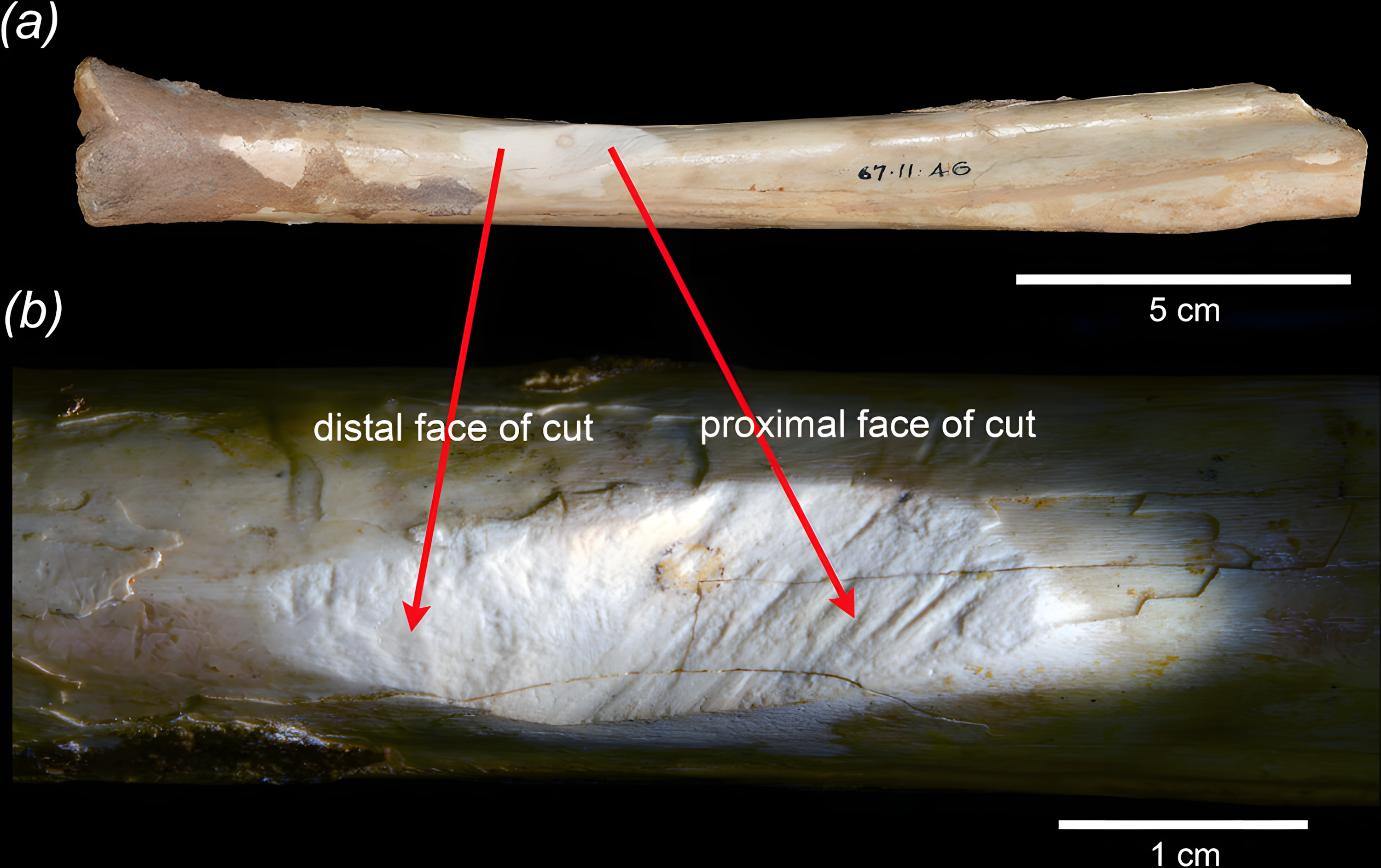 중요한 점은, 균열이 긴 균열과 교차하는 양쪽 끝부분이 잘려 있었다는 것이다. 이는 절단 당시 뼈가 이미 건조되었음을 의미한다.