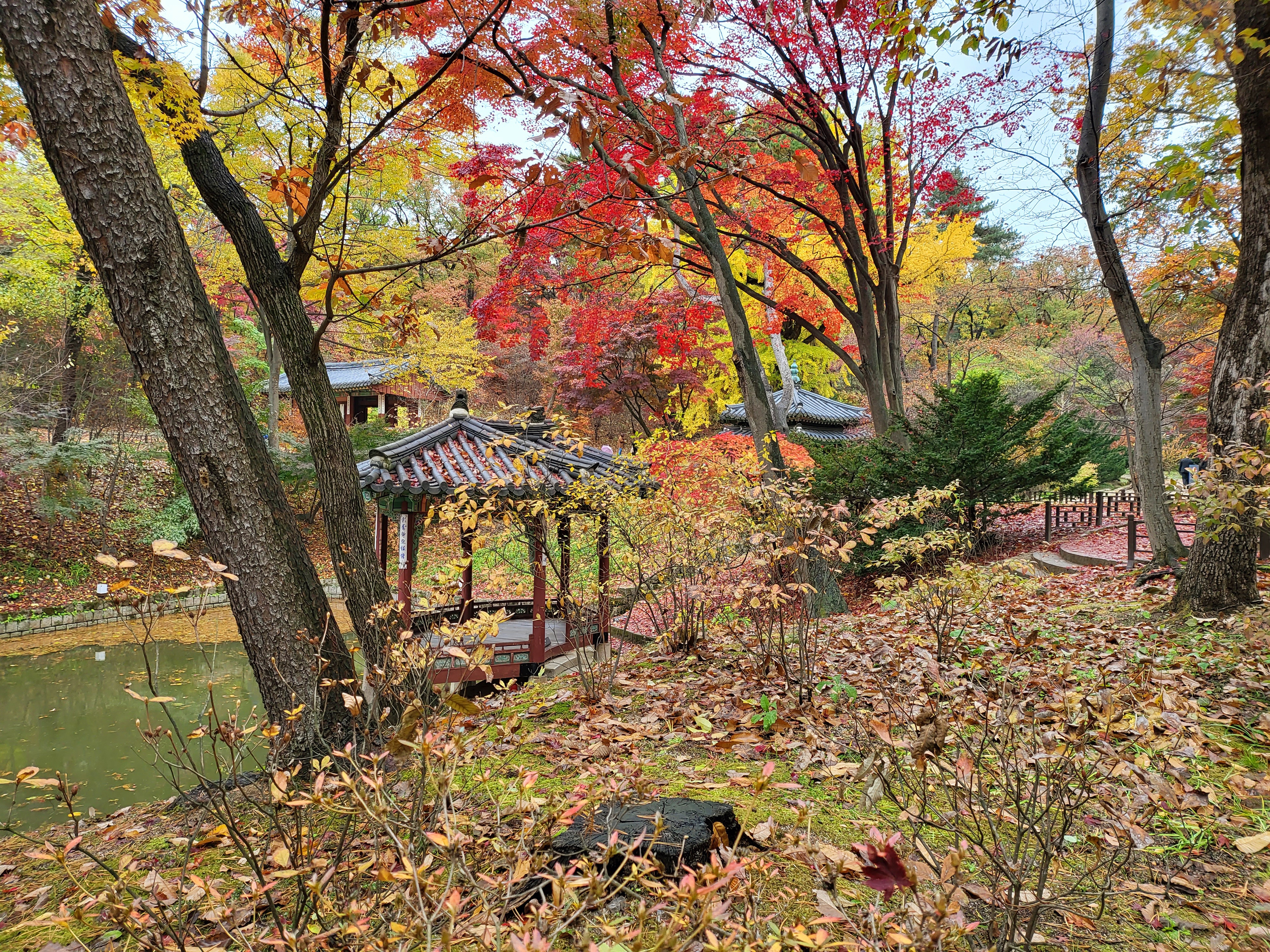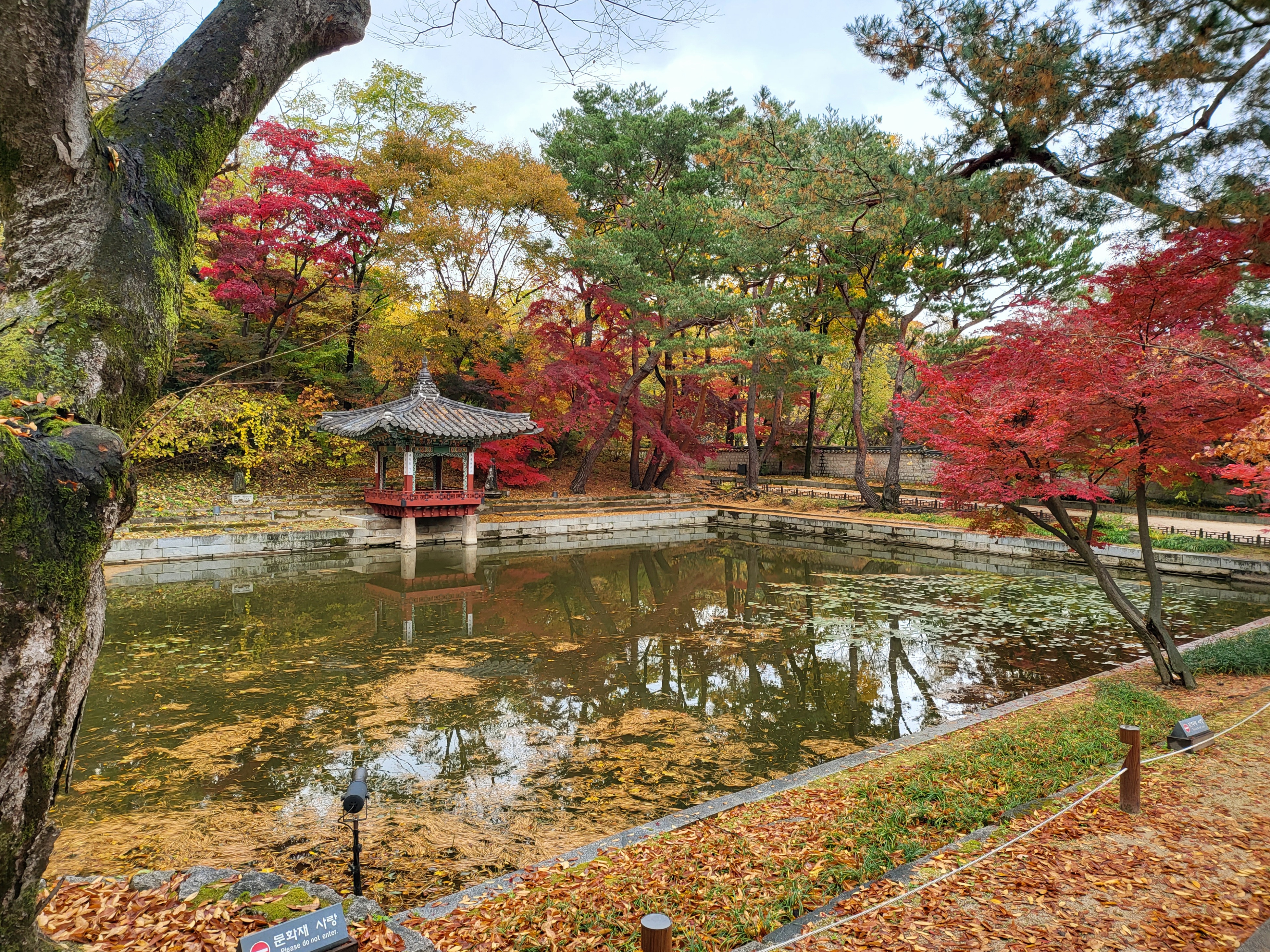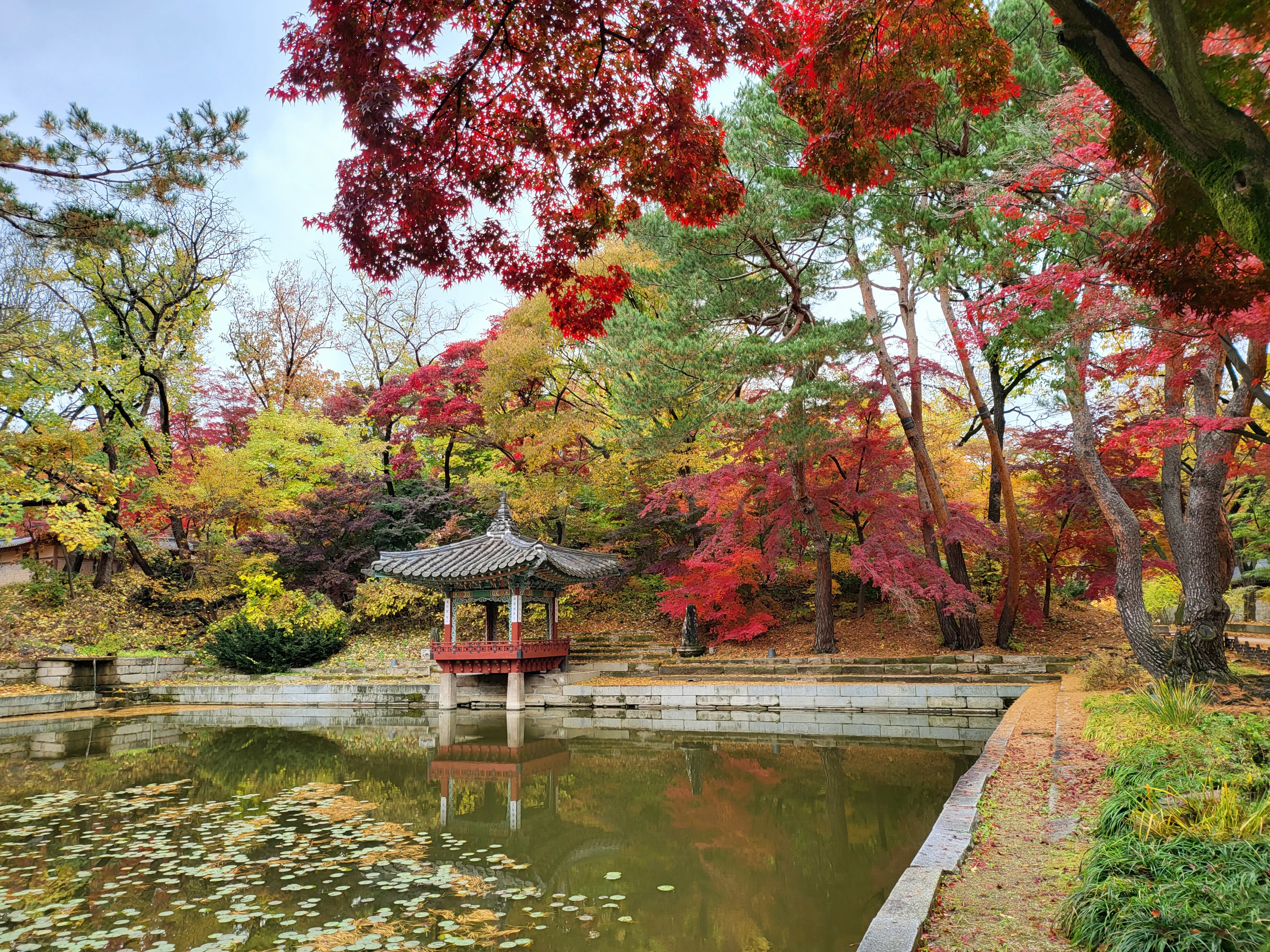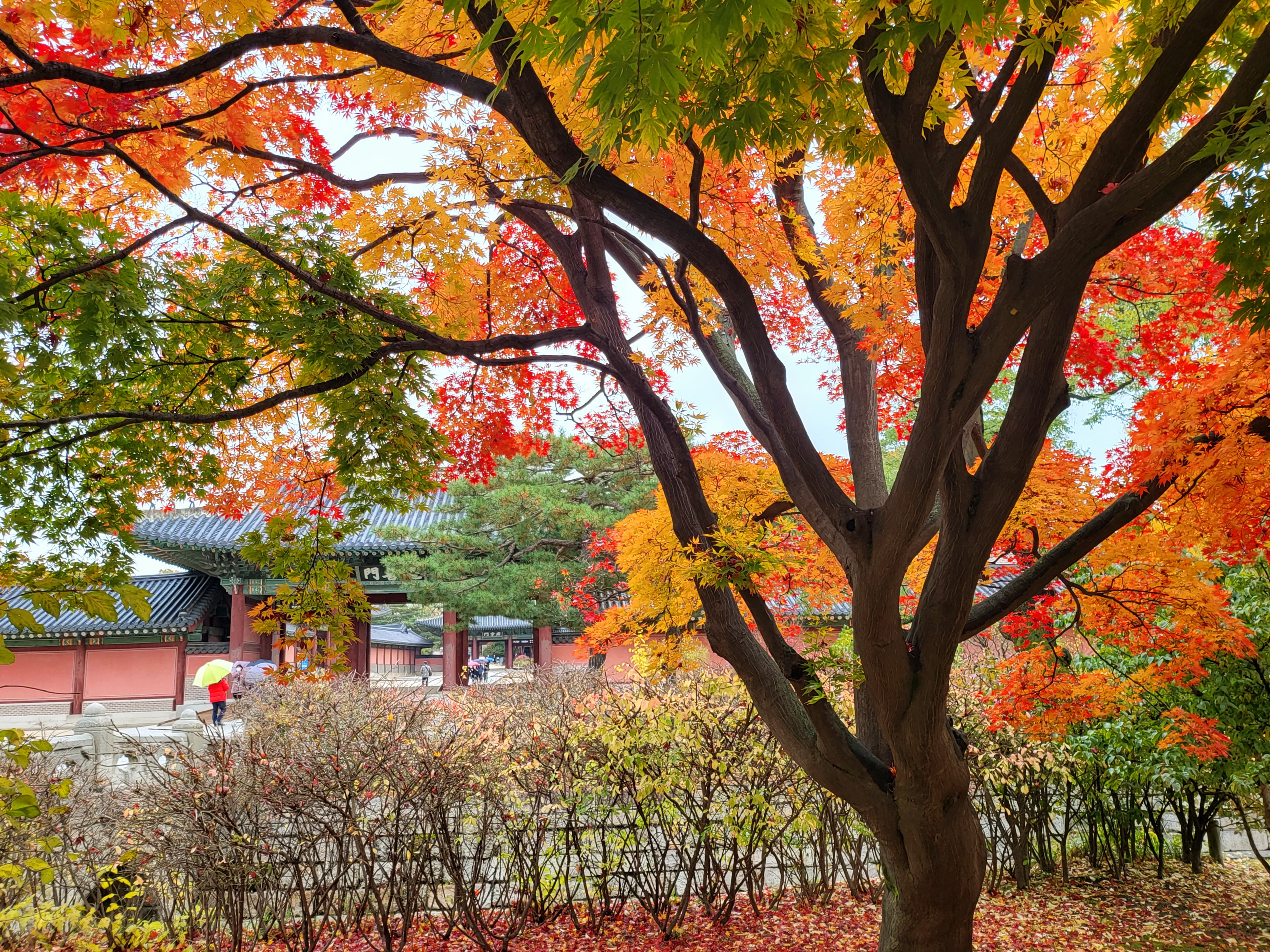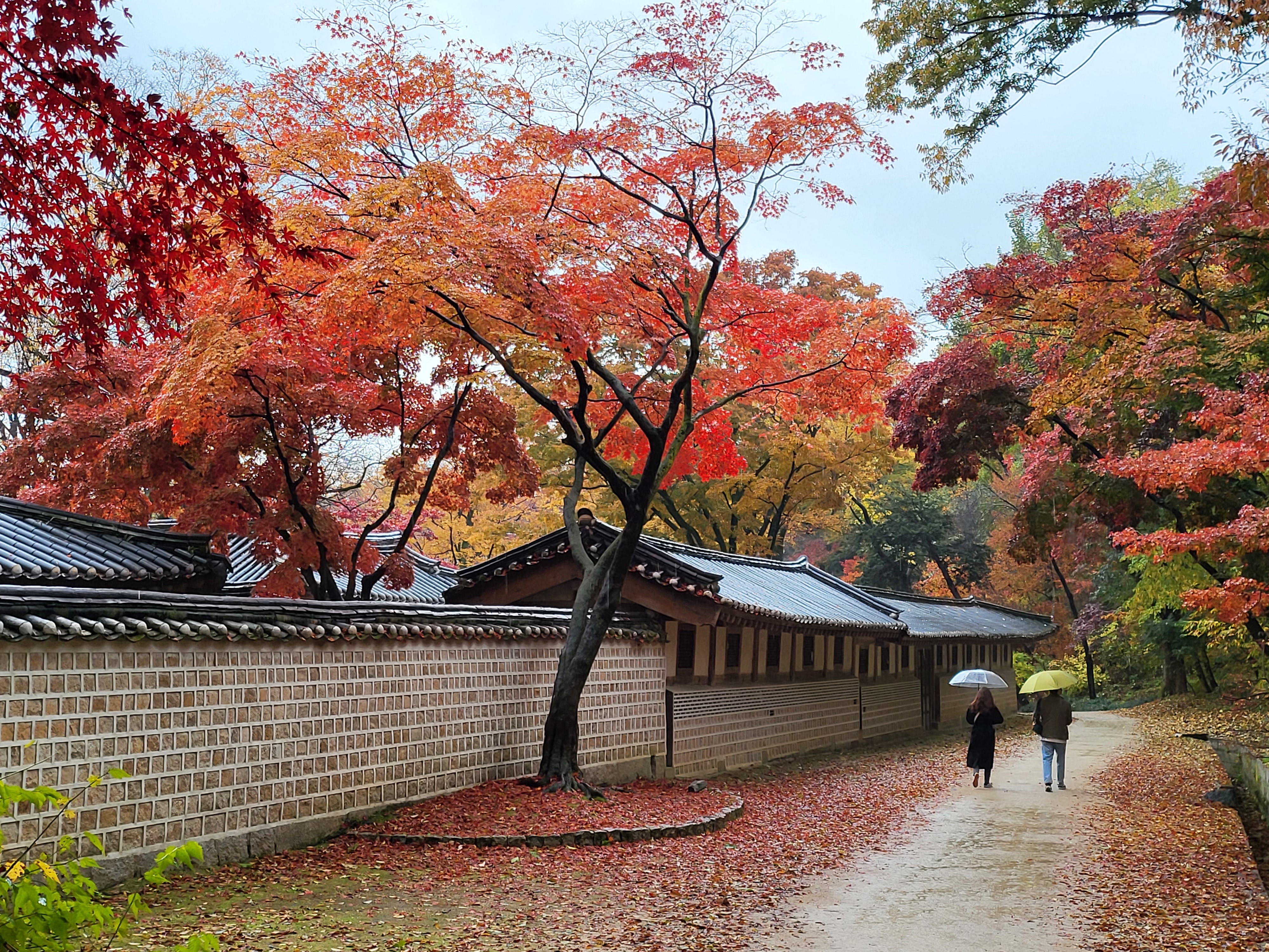 On a rainy Tuesday, Nov. 9 2021, royal palace Changdeokgung Palace of the Joseon Dynasty is blazing its late autumn red maple leaves.
