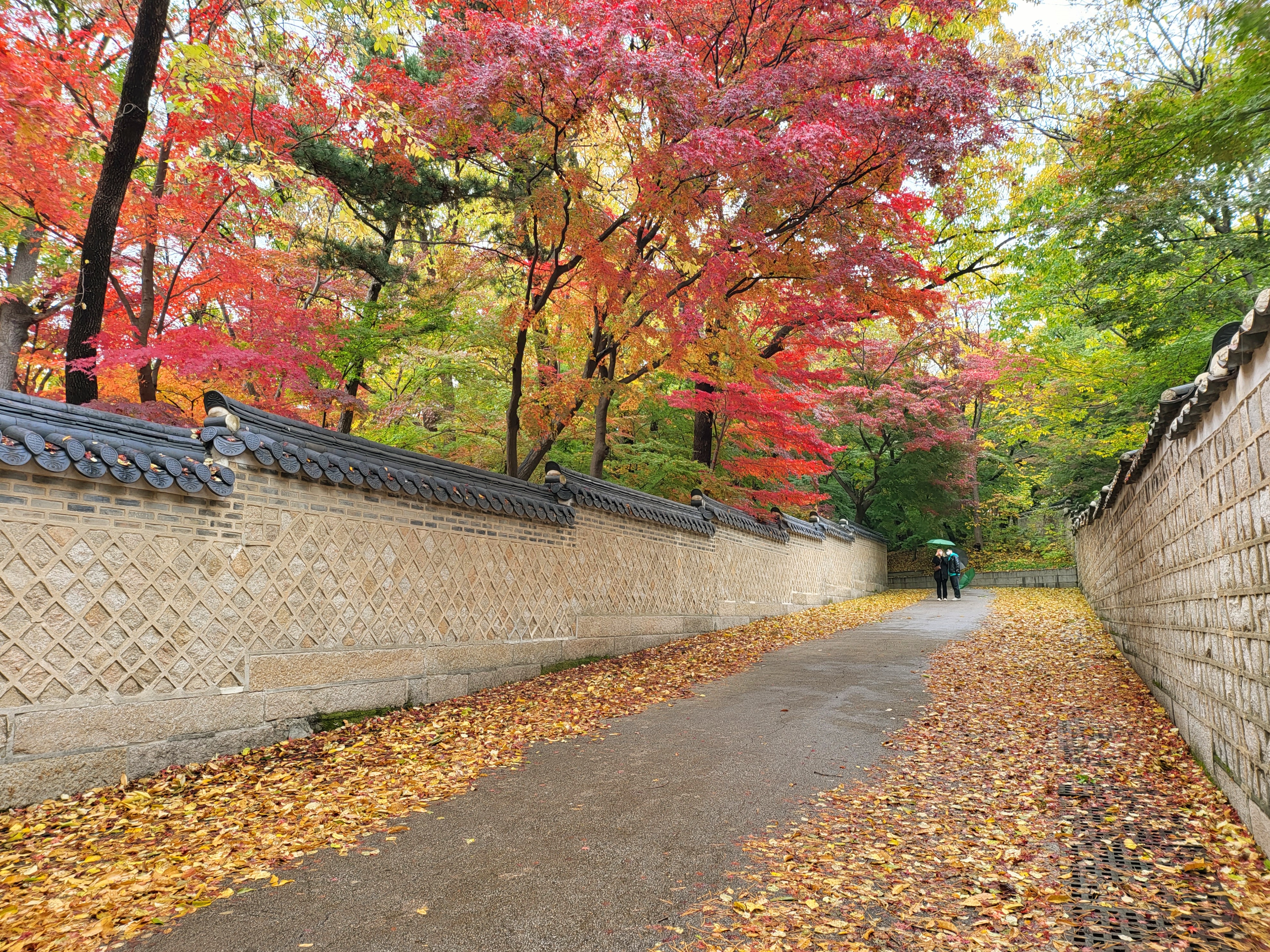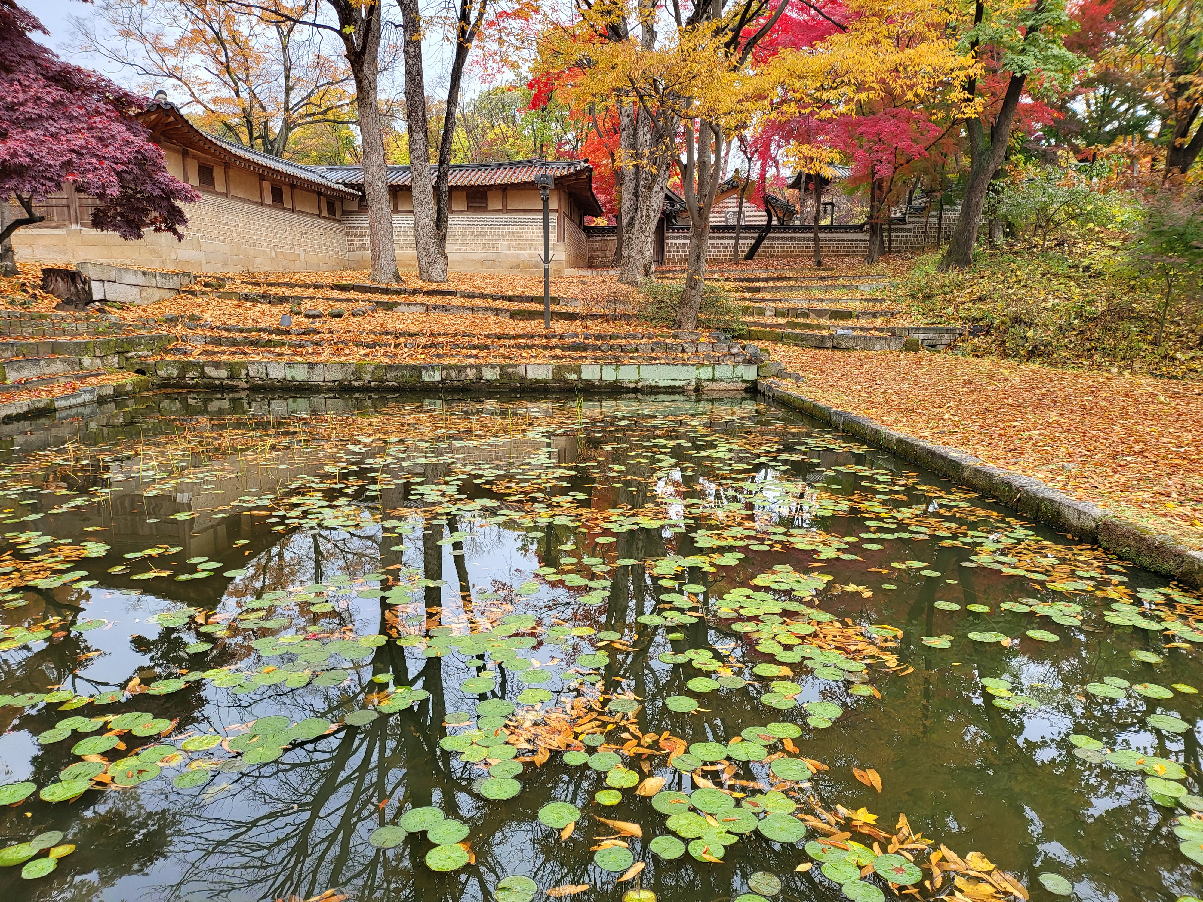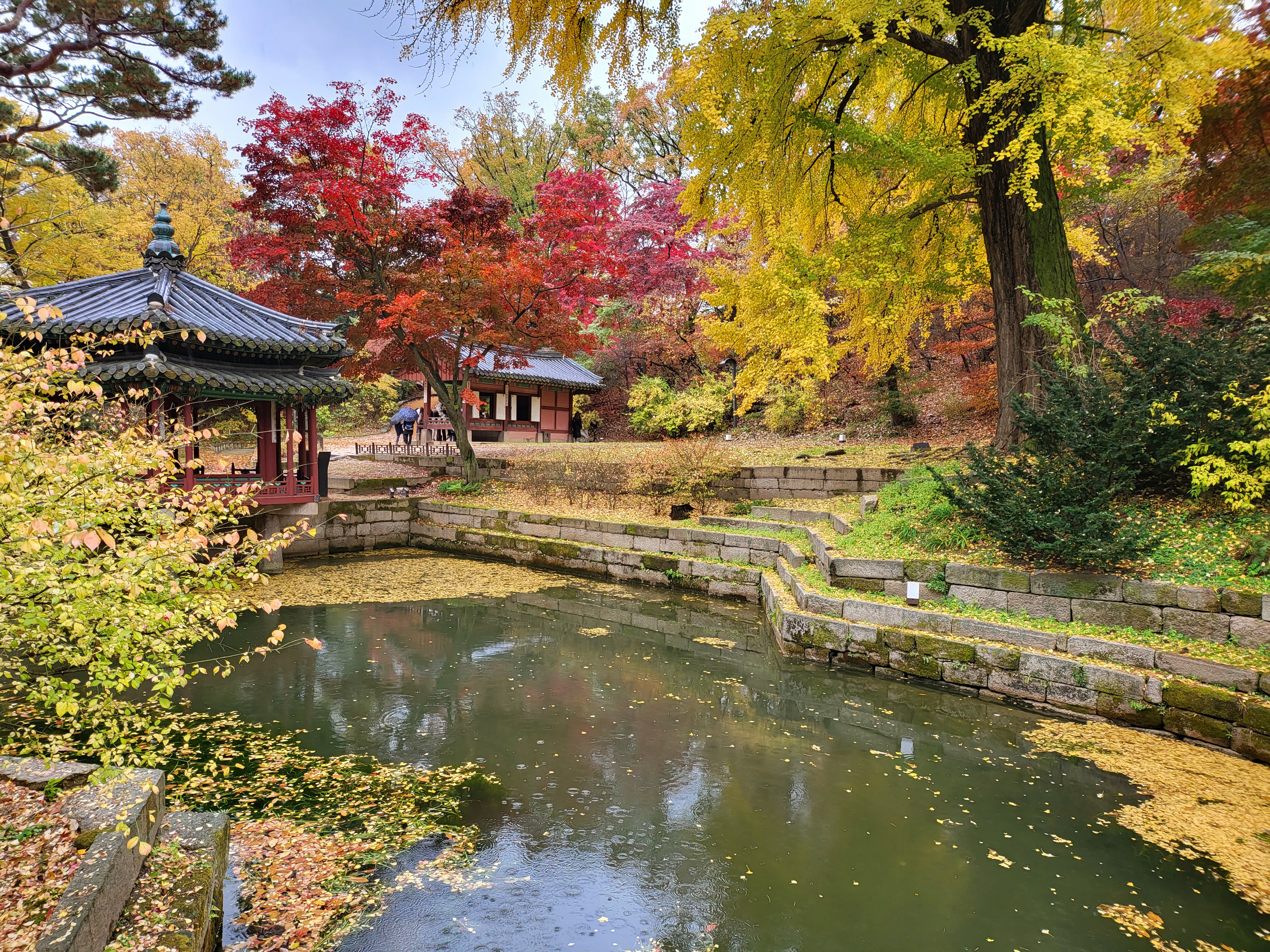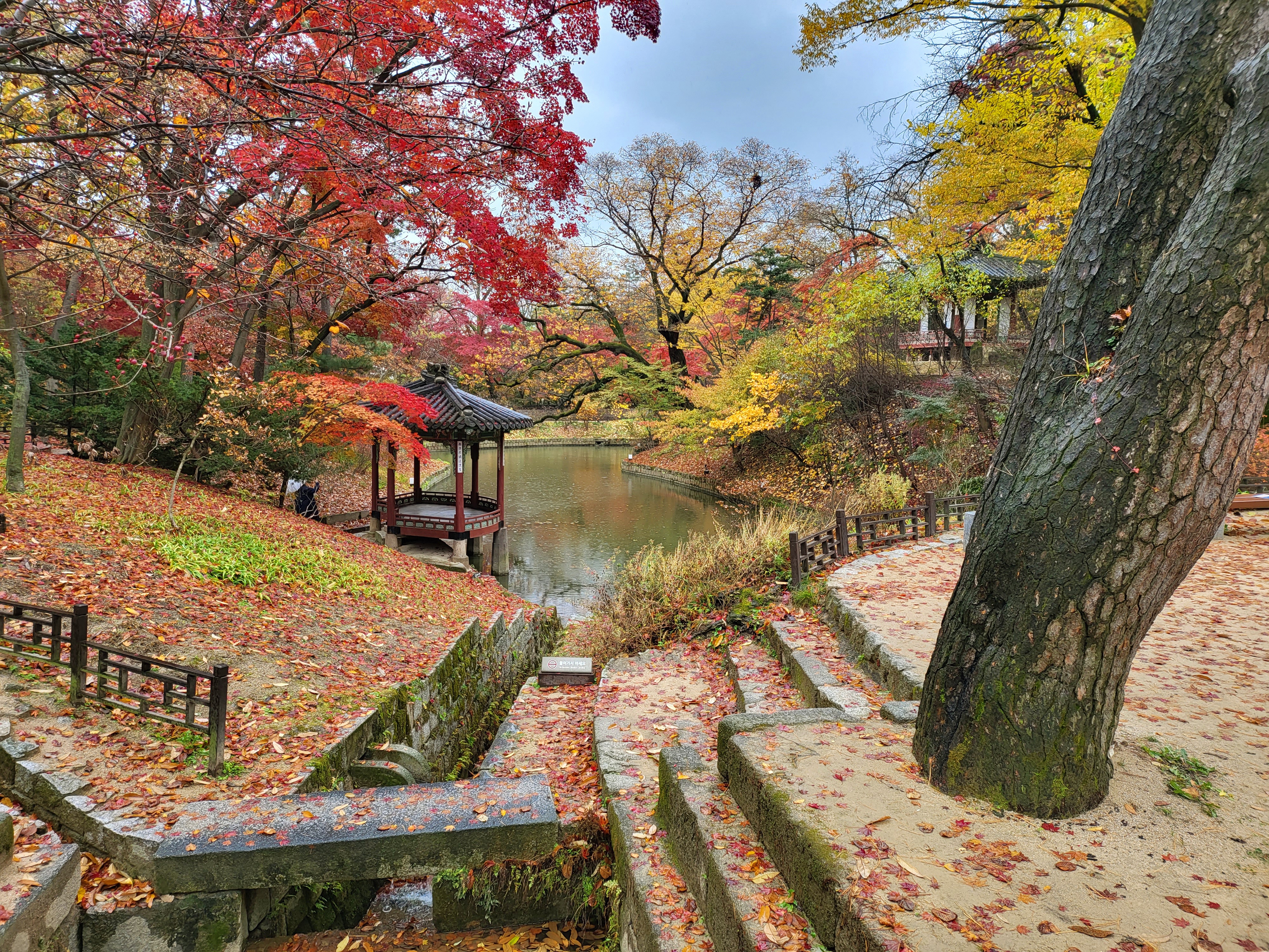 On a rainy Tuesday, Nov. 9 2021, royal palace Changdeokgung Palace of the Joseon Dynasty is blazing its late autumn red maple leaves.