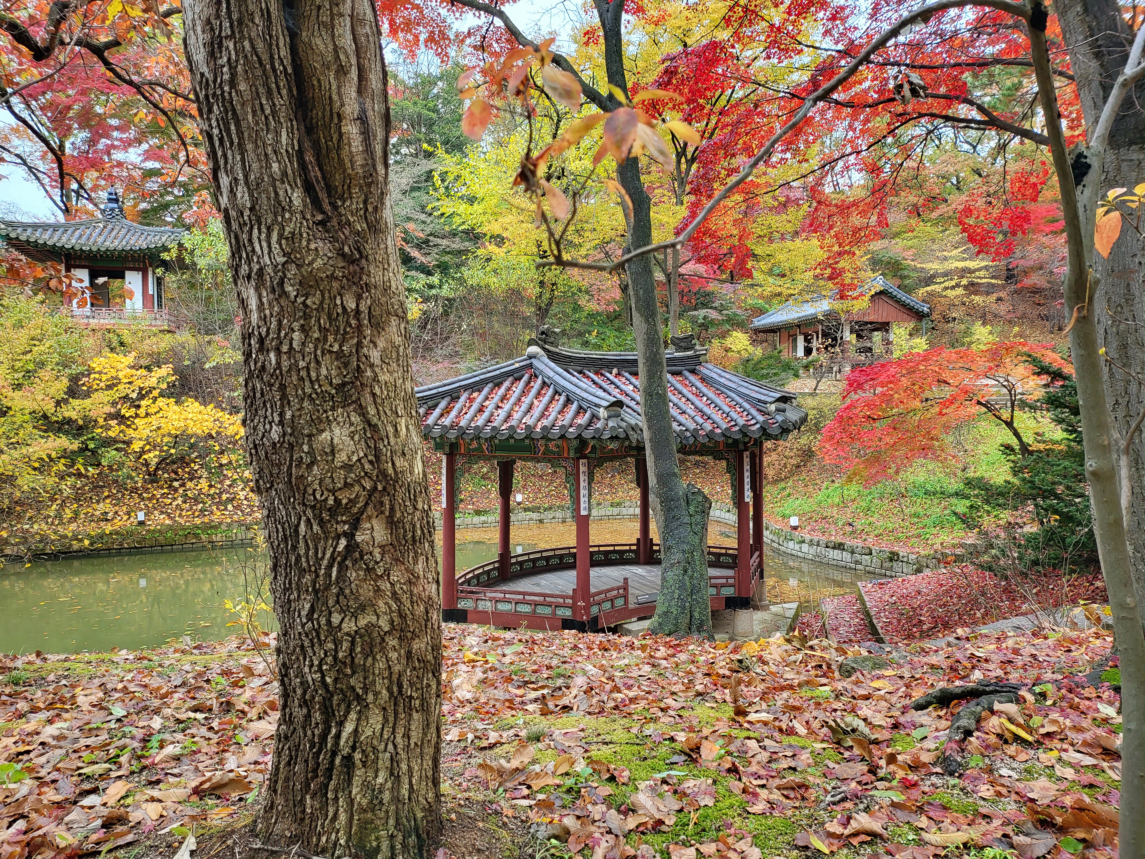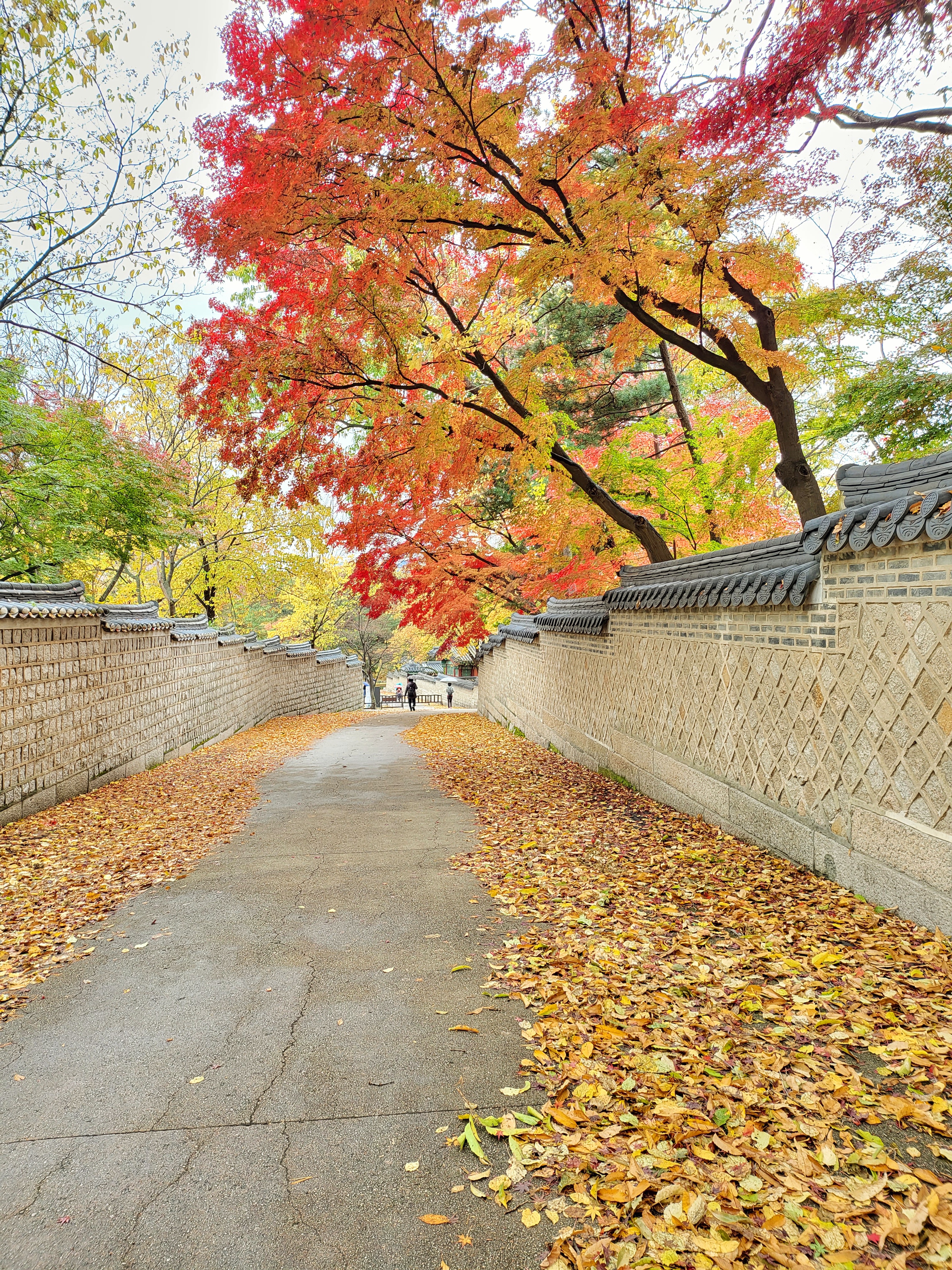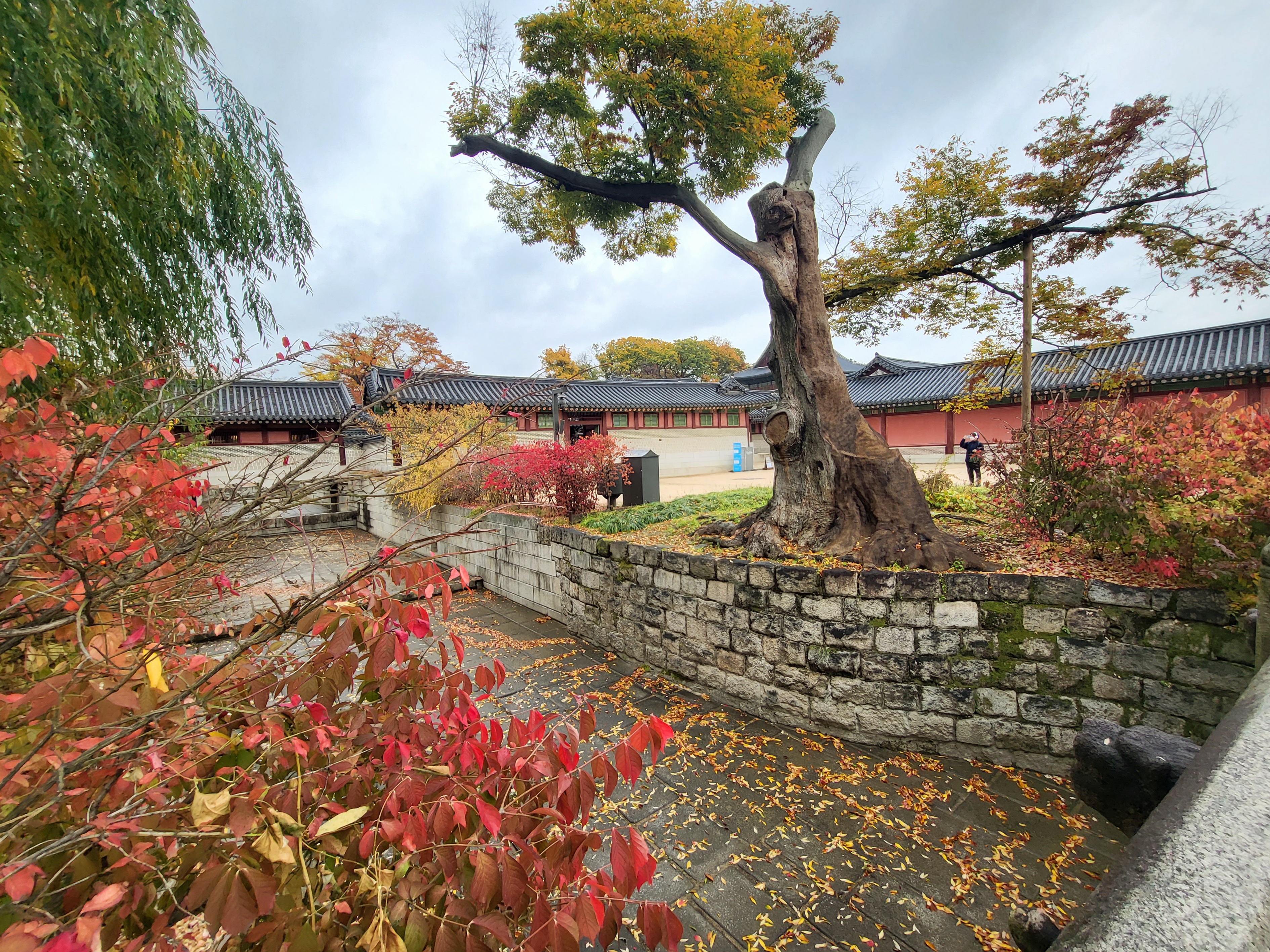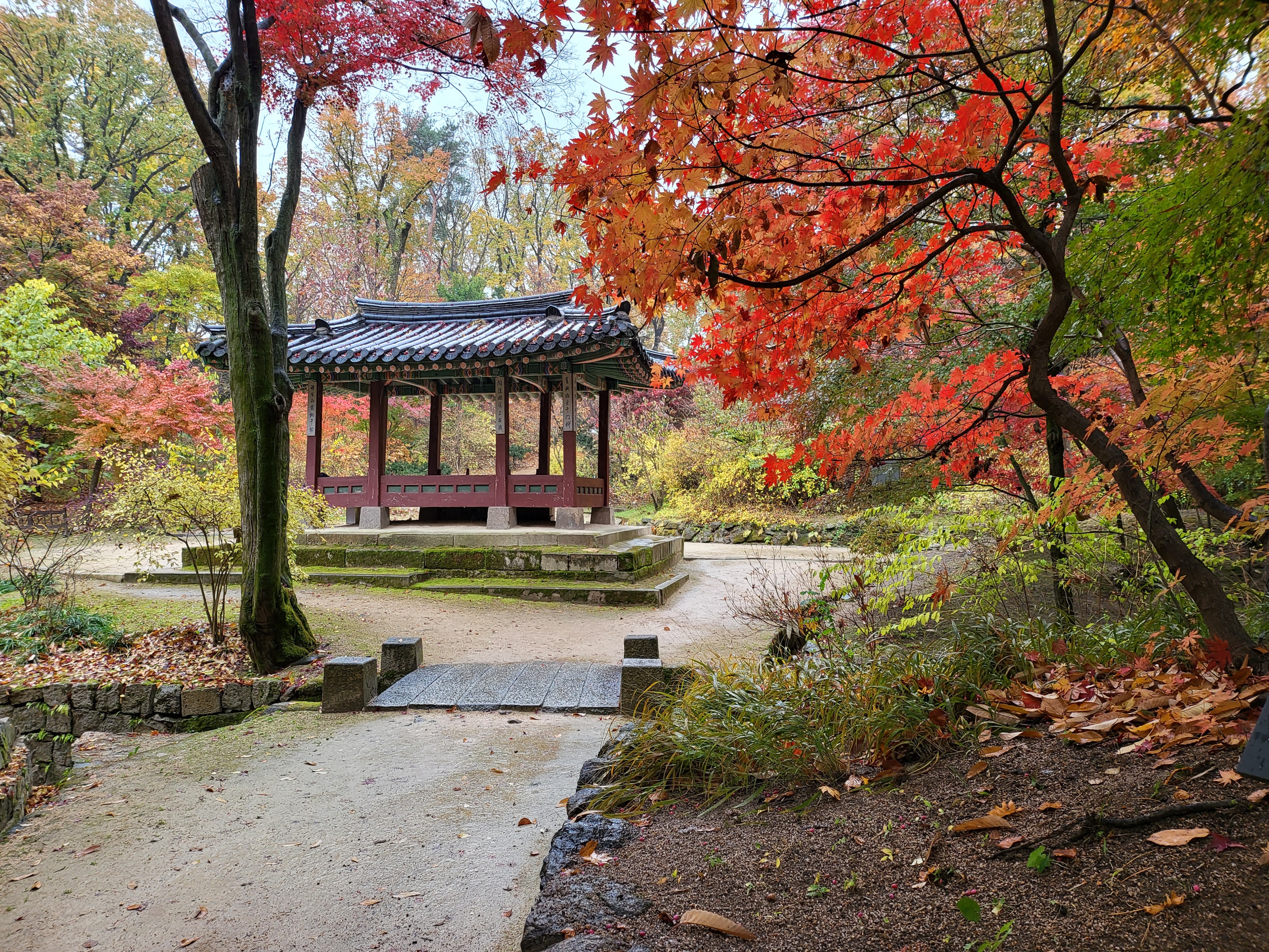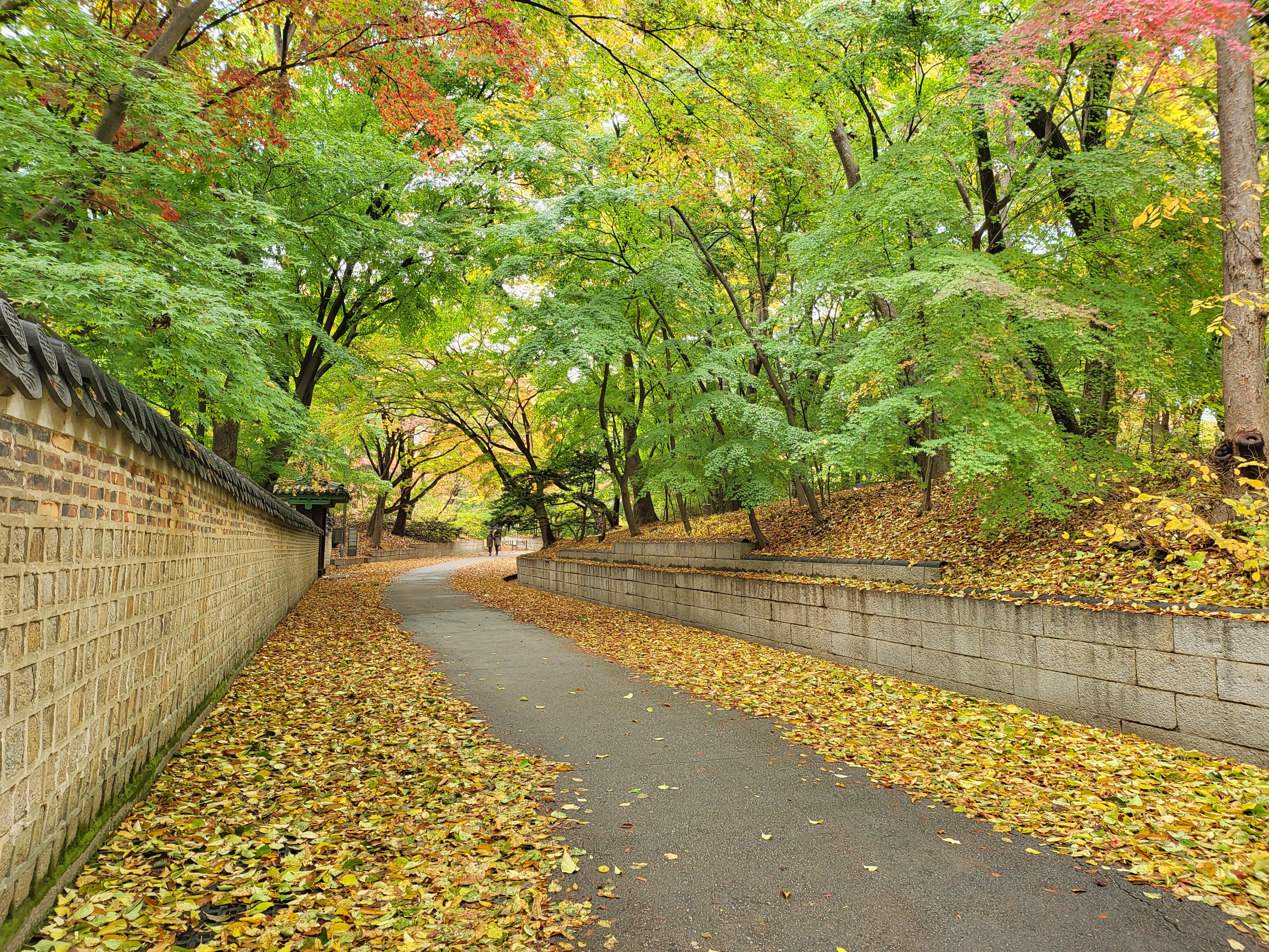 On a rainy Tuesday, Nov. 9 2021, royal palace Changdeokgung Palace of the Joseon Dynasty is blazing its late autumn red maple leaves.