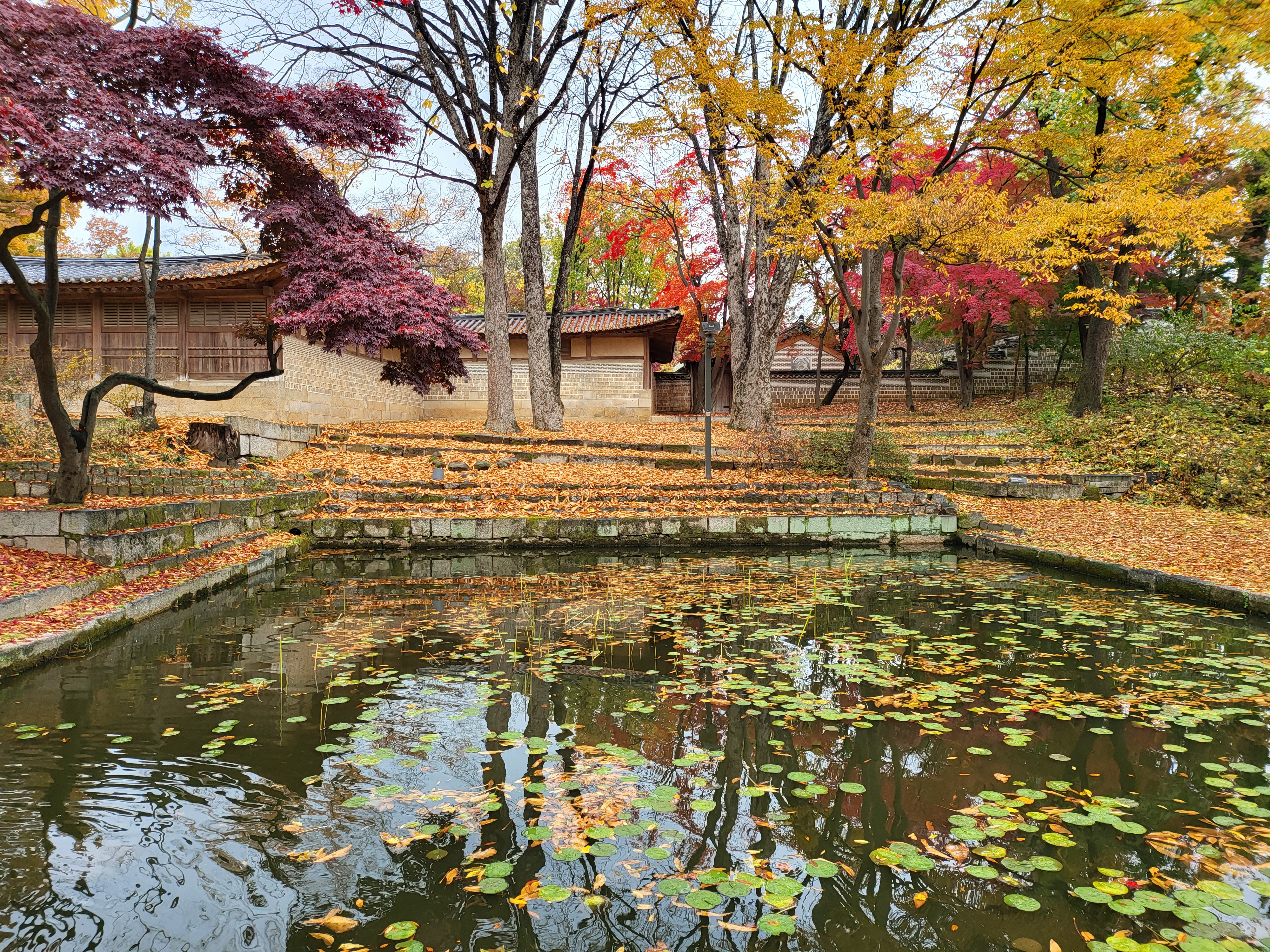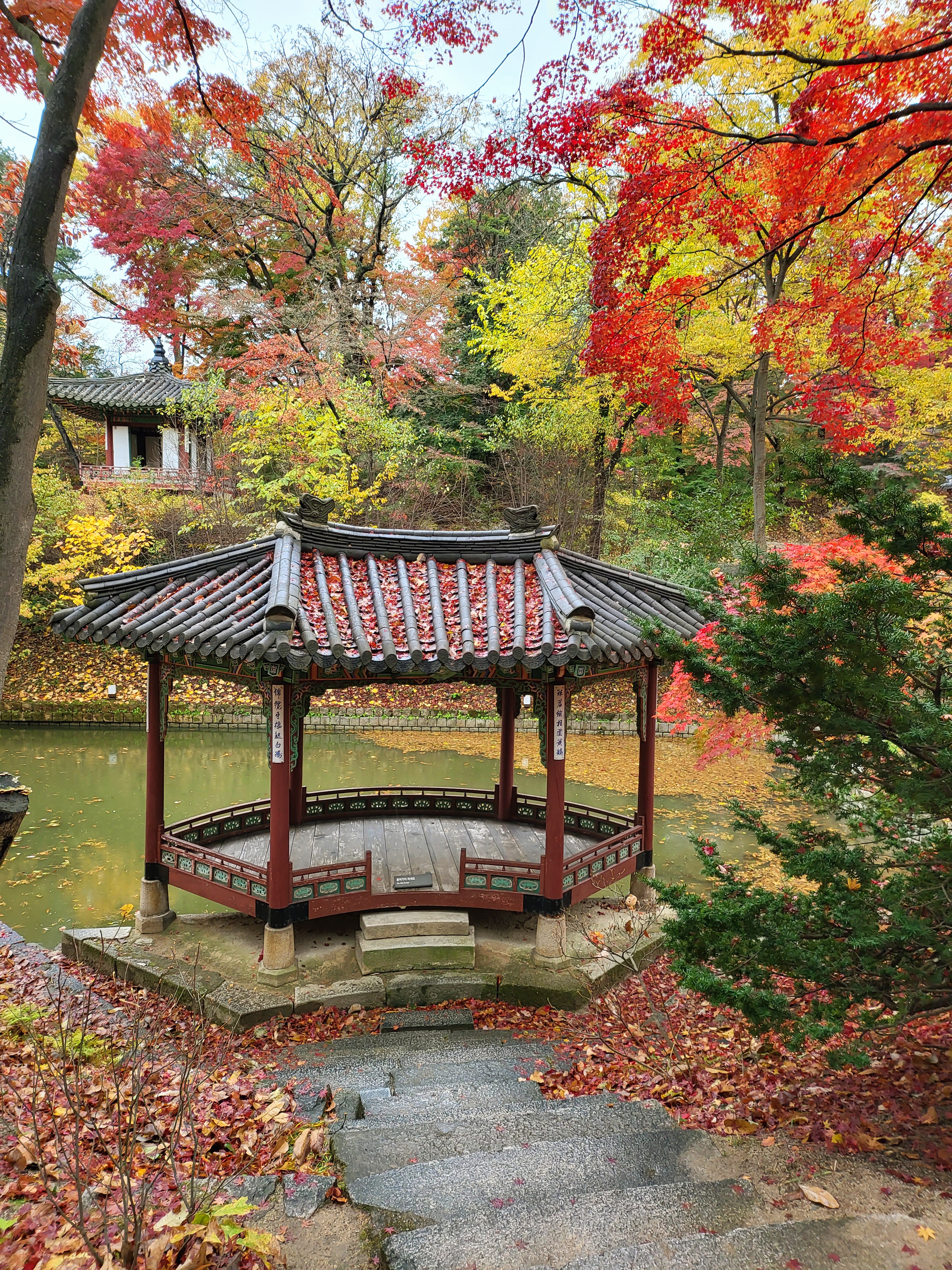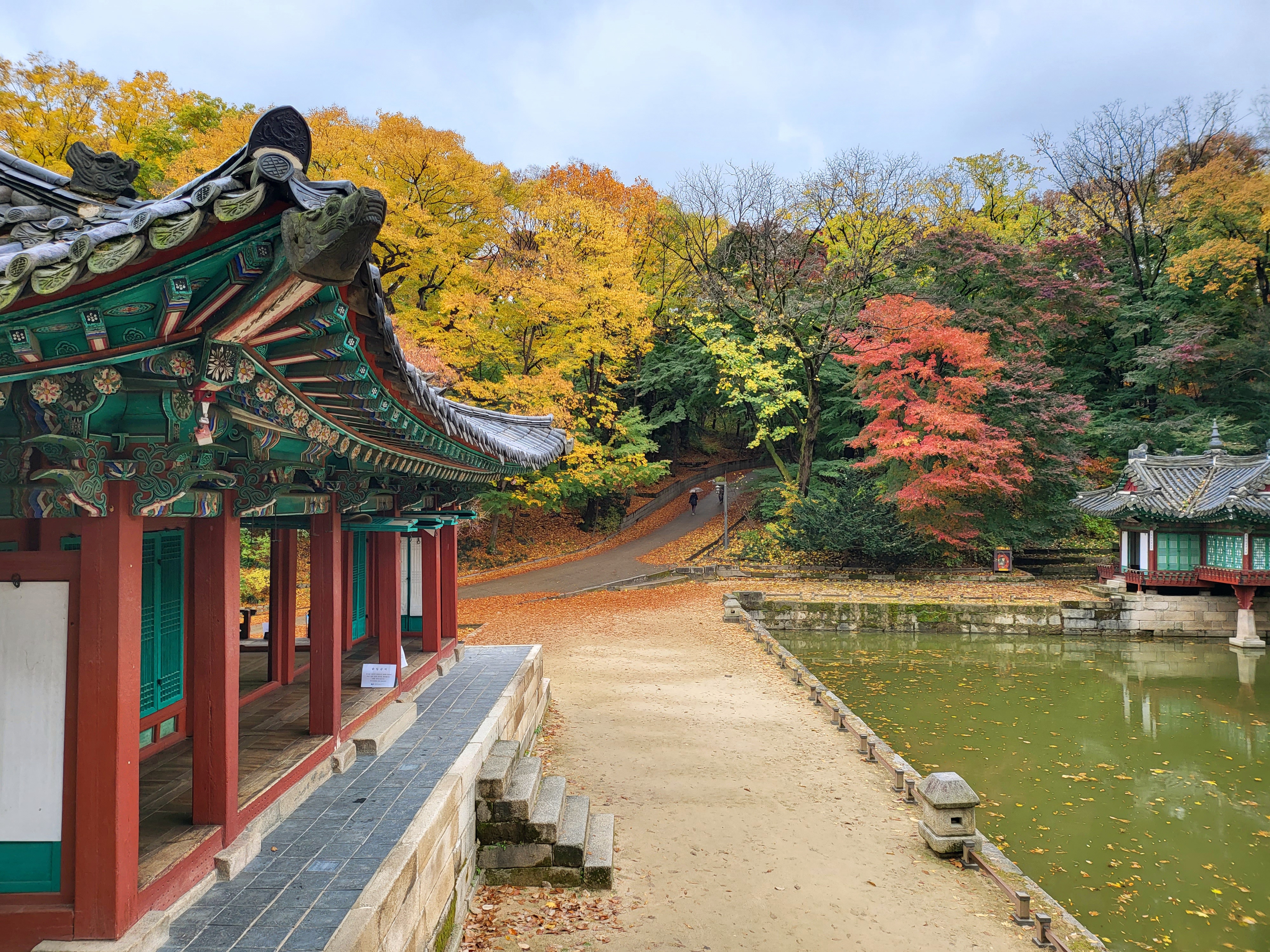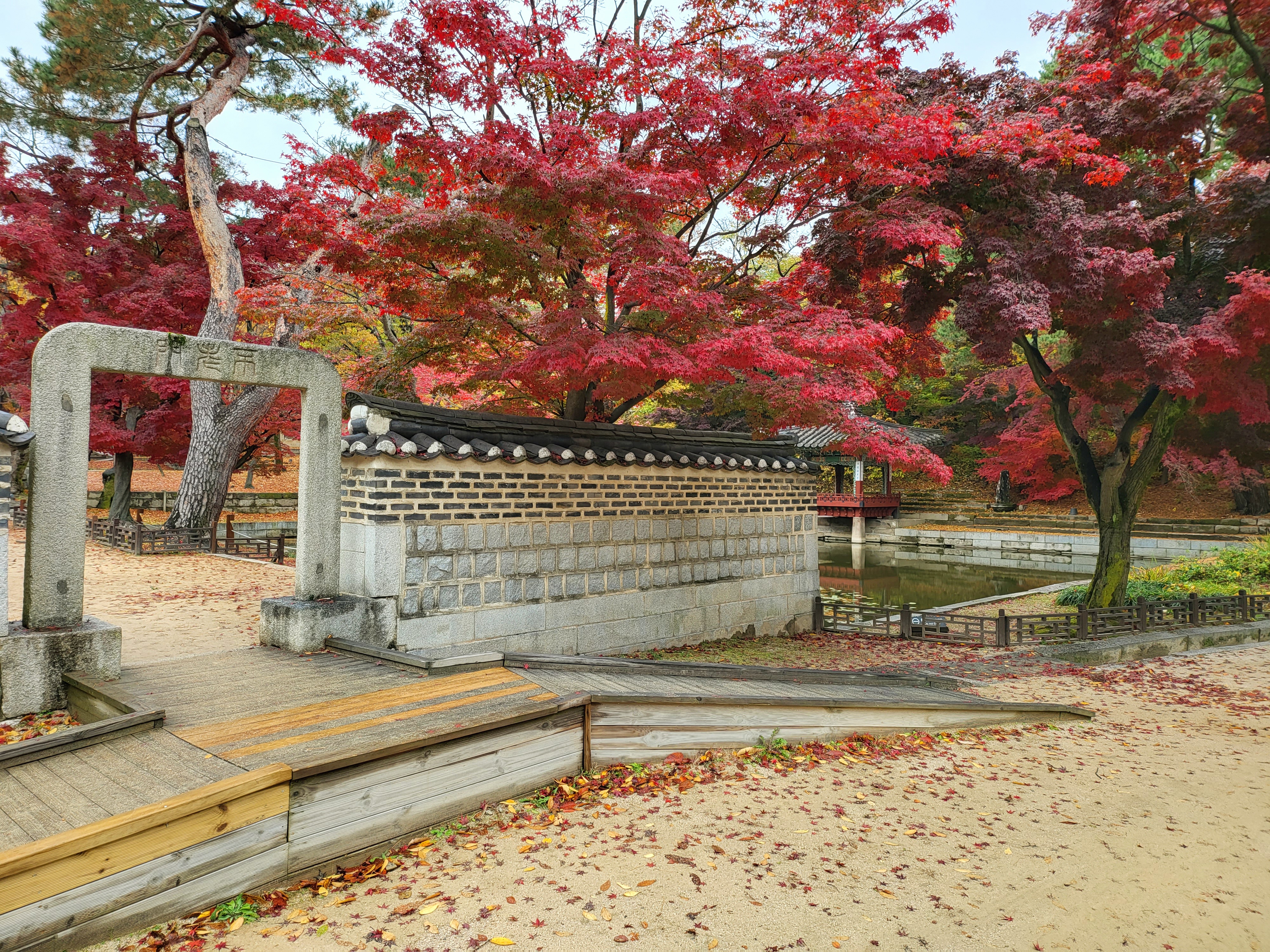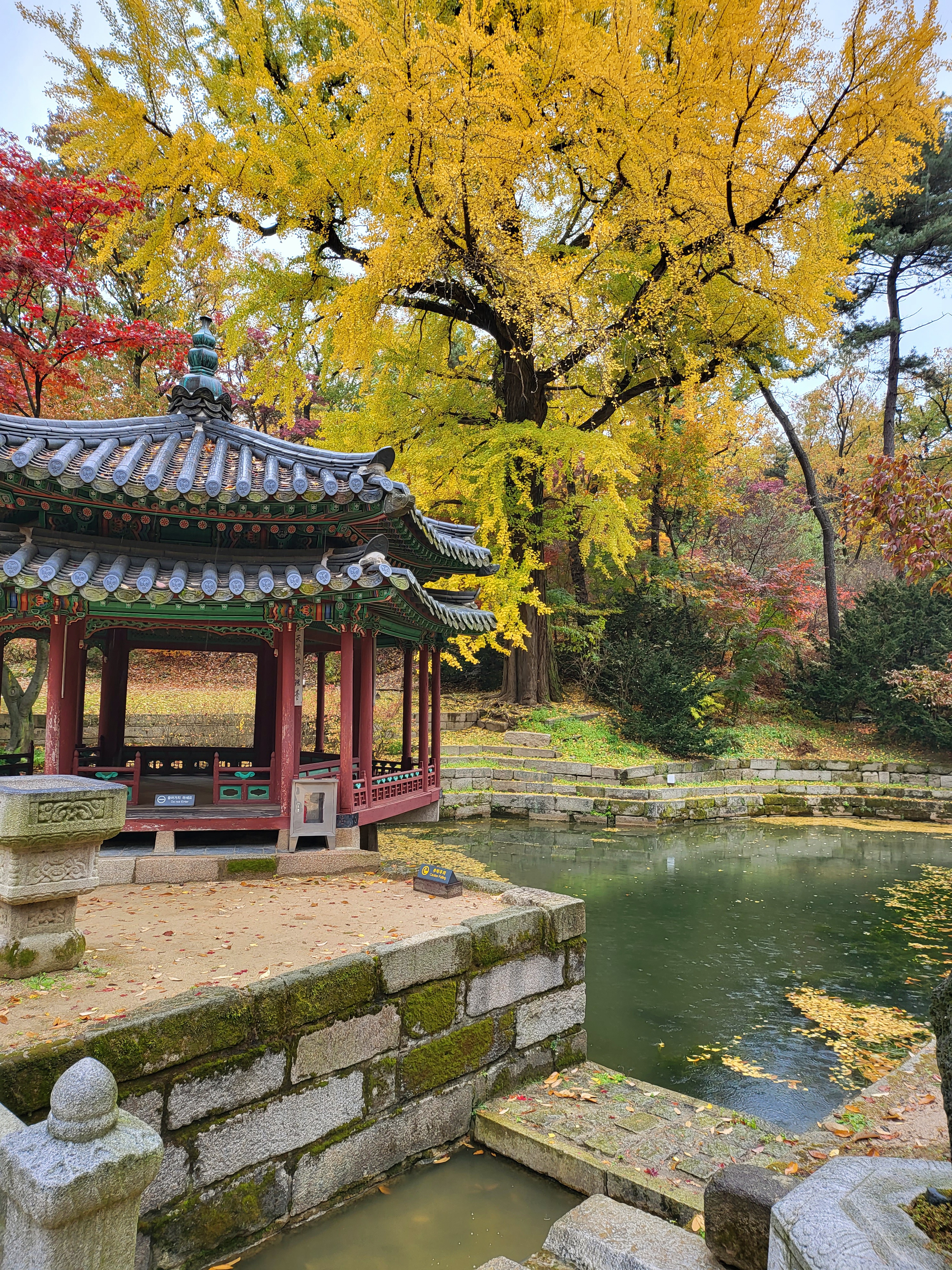 On a rainy Tuesday, Nov. 9 2021, royal palace Changdeokgung Palace of the Joseon Dynasty is blazing its late autumn red maple leaves.