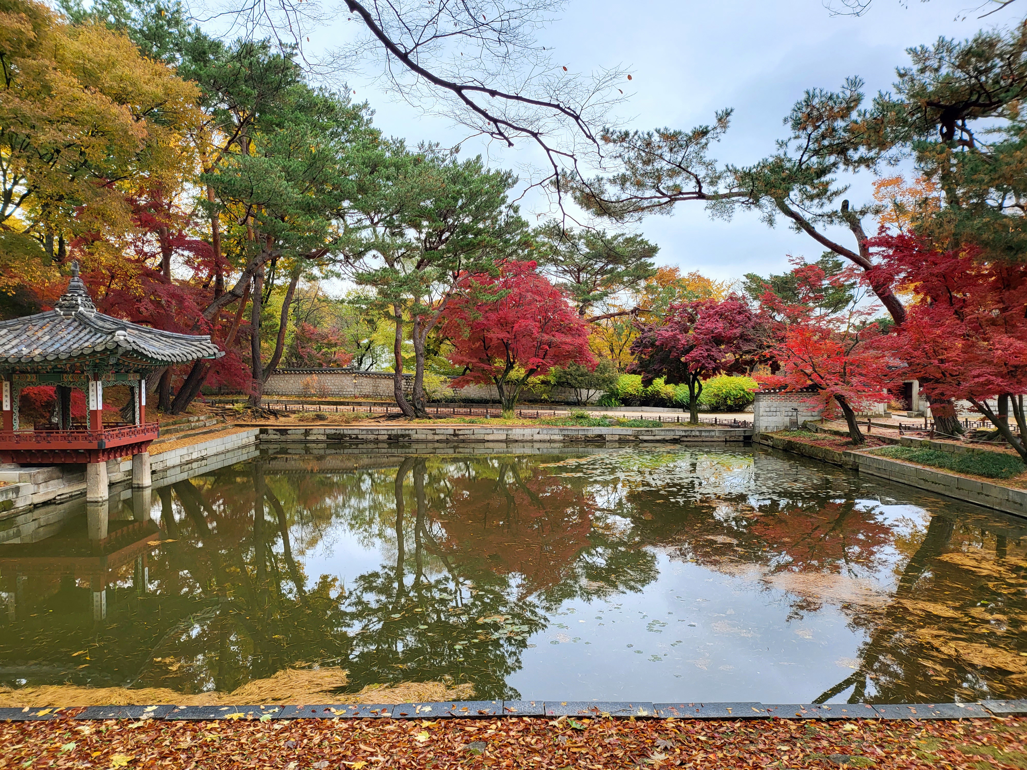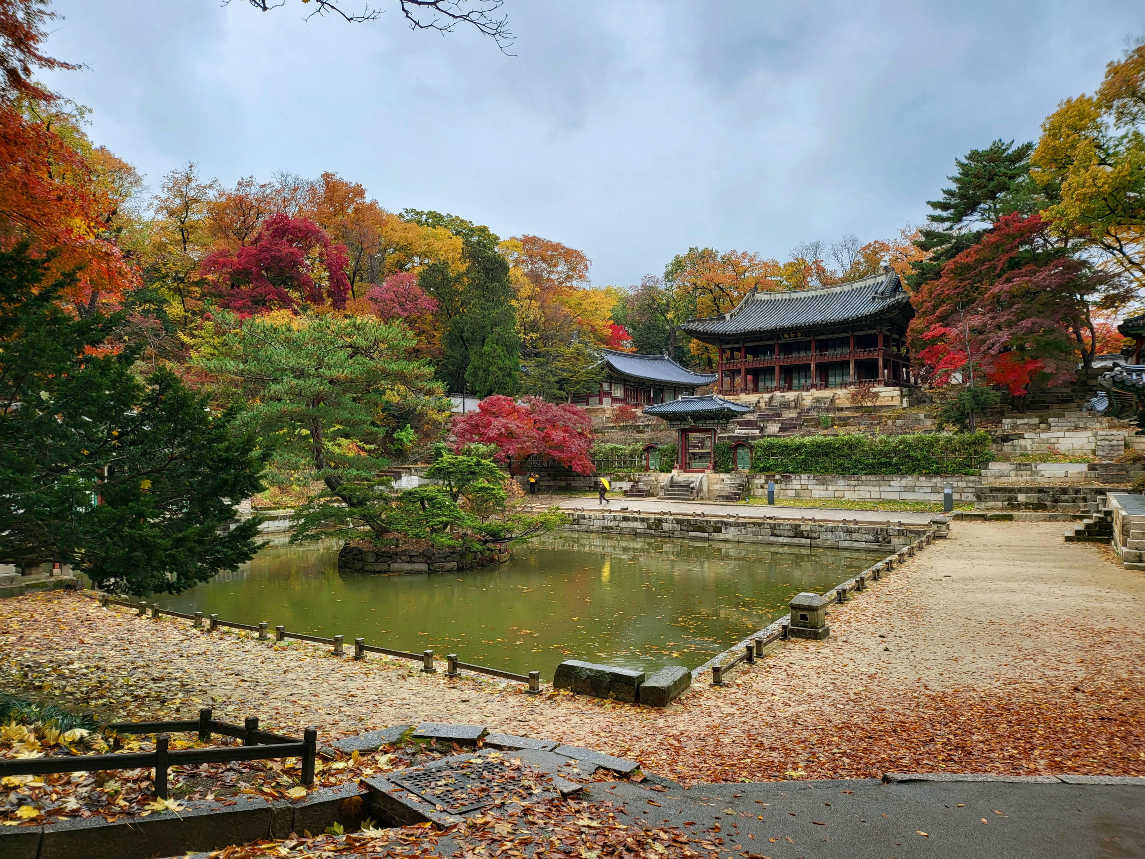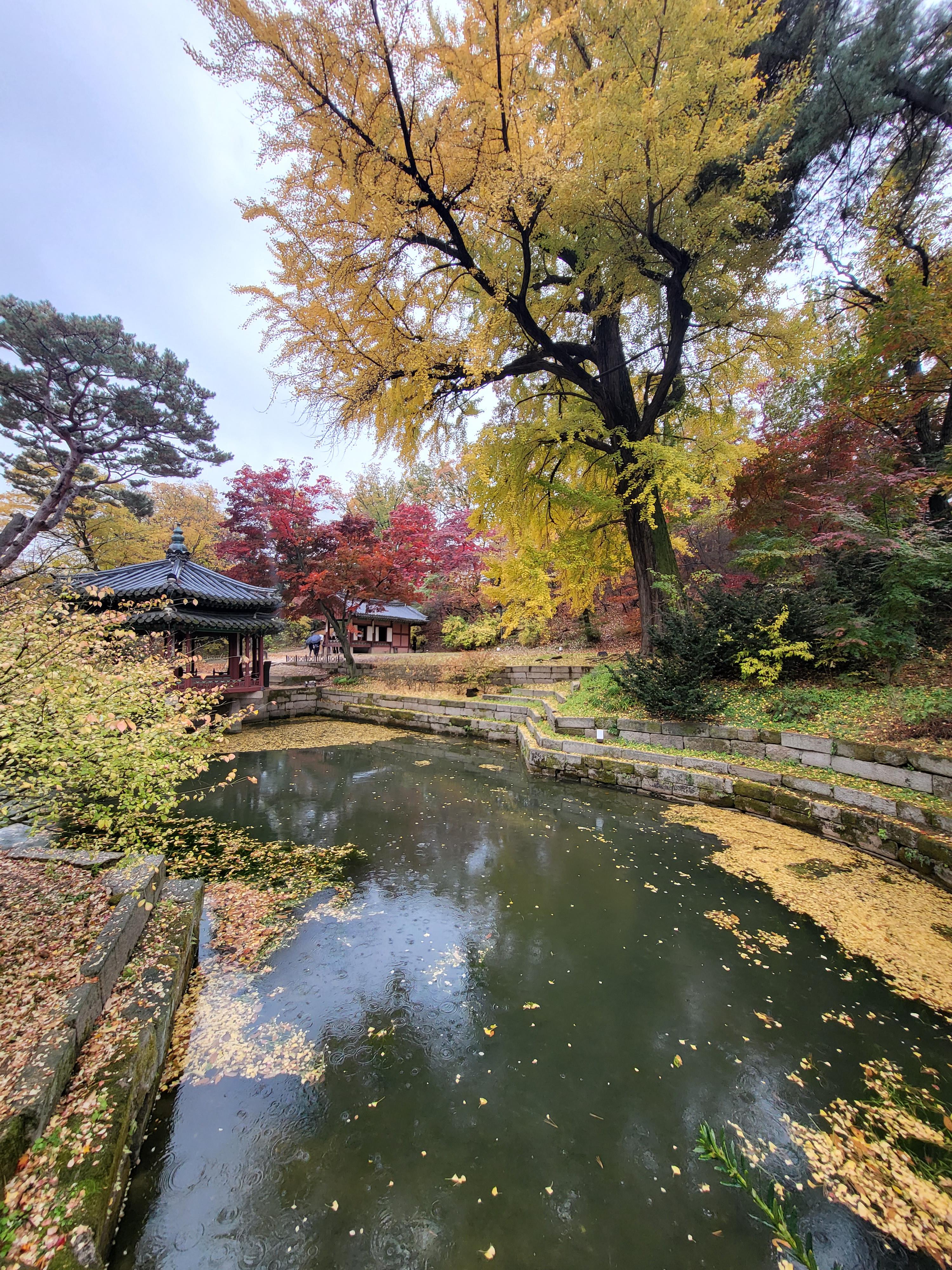 On a rainy Tuesday, Nov. 9 2021, royal palace Changdeokgung Palace of the Joseon Dynasty is blazing its late autumn red maple leaves.