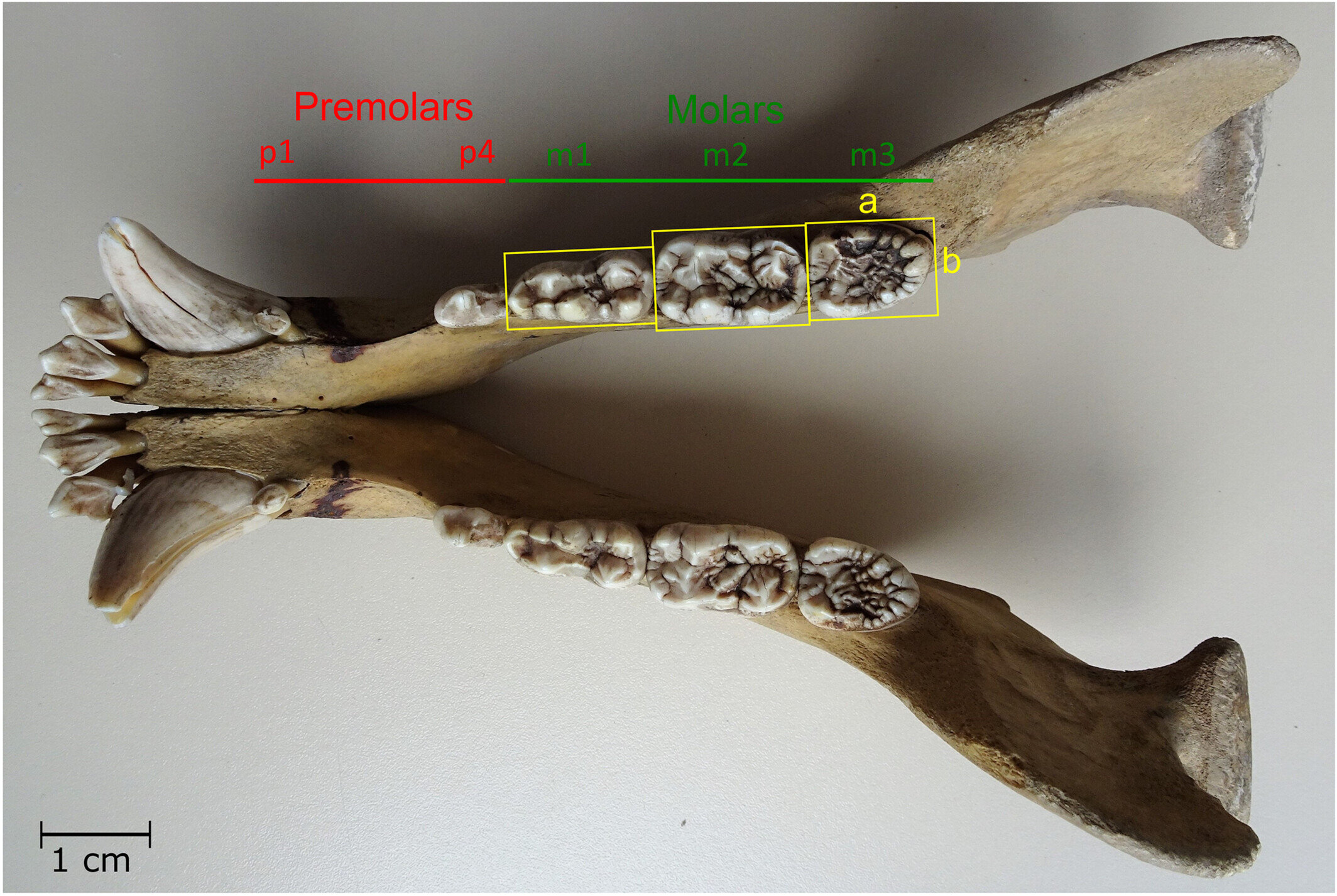 초식동물의 경우 그 반대다. 첫 번째 어금니는 작고 세 번째 어금니는 크다.